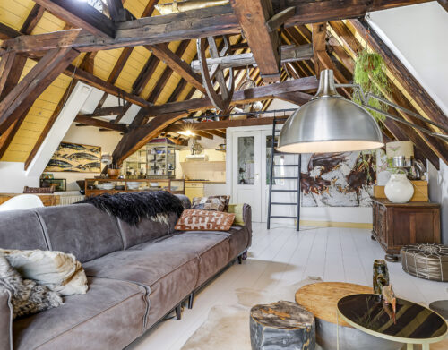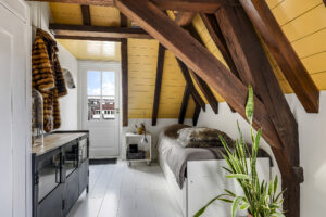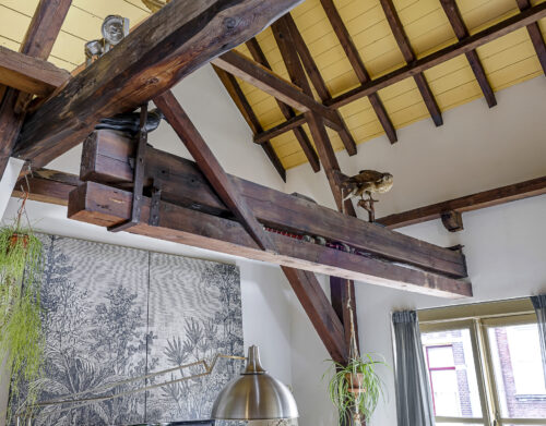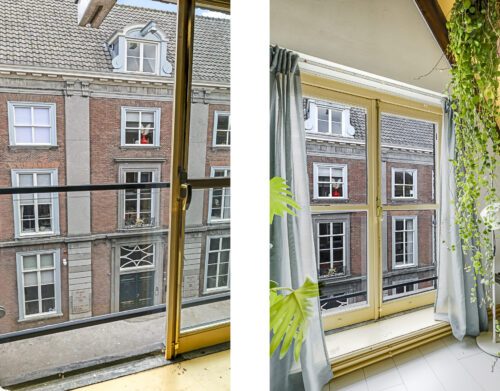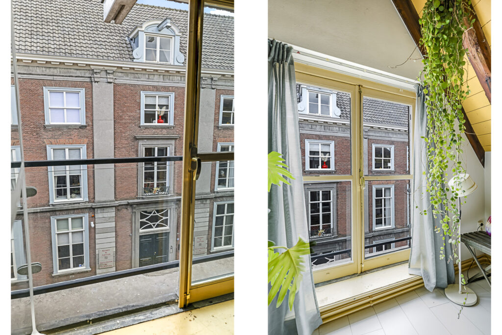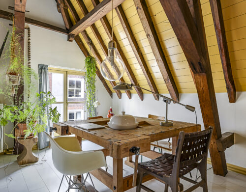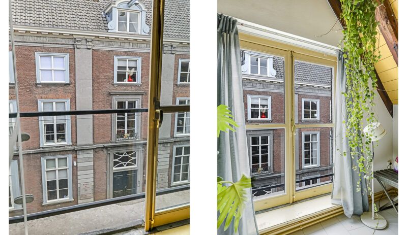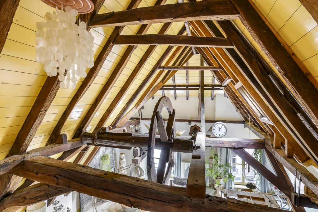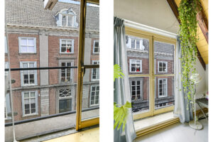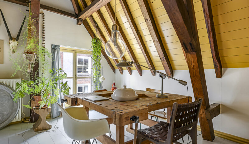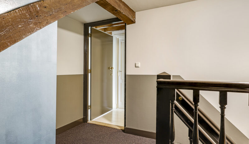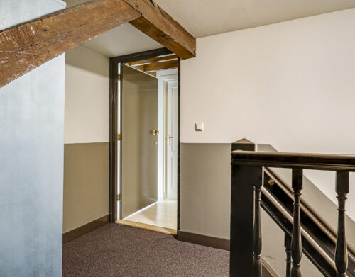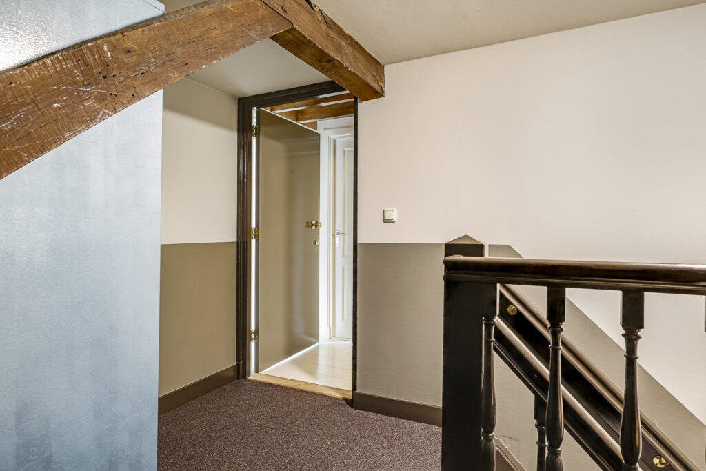 Op de tweede verdieping, vind je dit karakteristieke appartement met een woonoppervlakte van ca. 100 m². De combinatie van hoge plafonds, authentieke houten balken en een open leefruimte zorgt voor een bijzonder sfeervolle woonbeleving. En het dakterras? Dat biedt een adembenemend uitzicht op de Eusebiuskerk, die ’s avonds prachtig verlicht is.