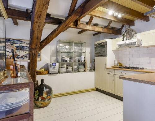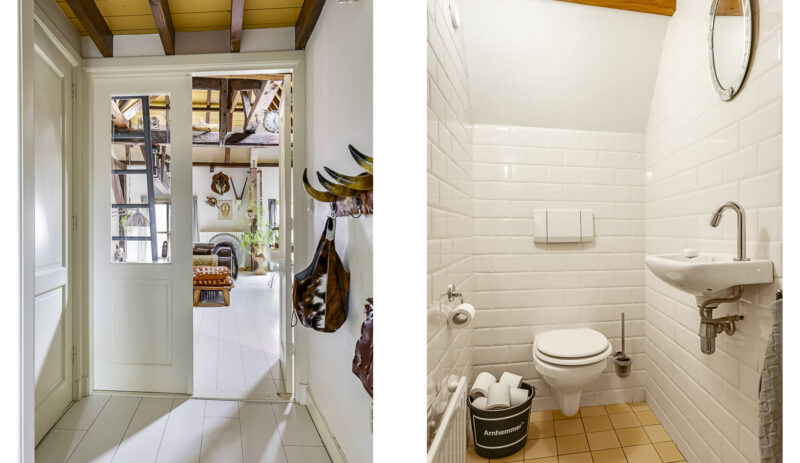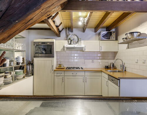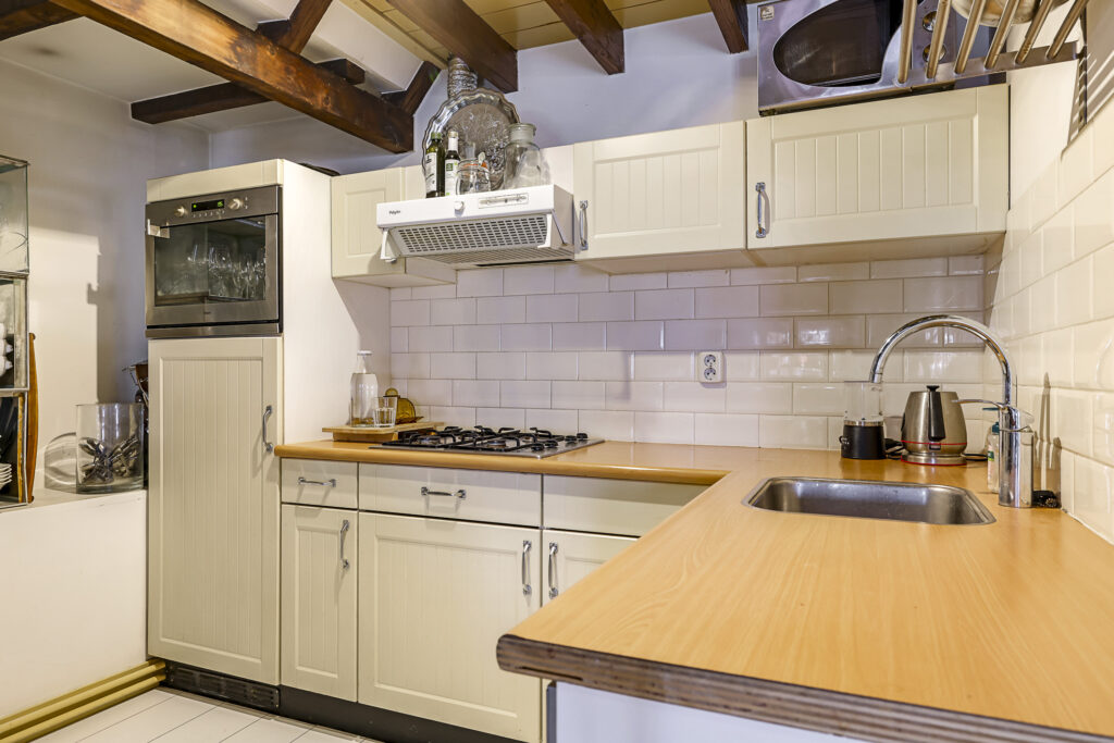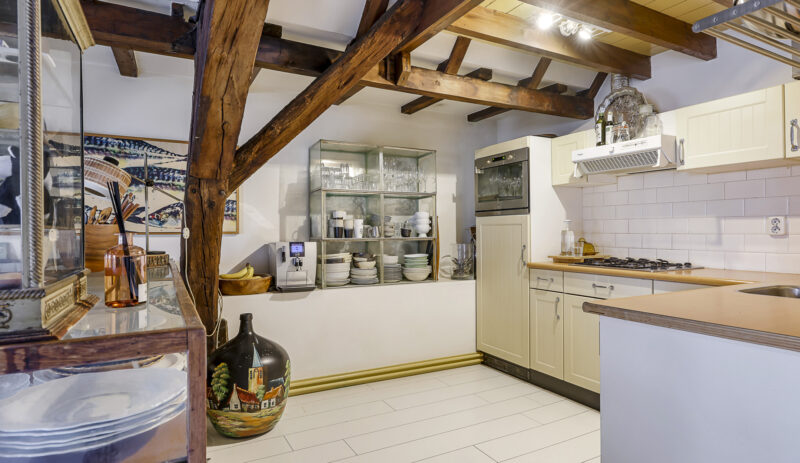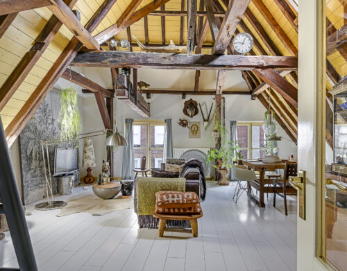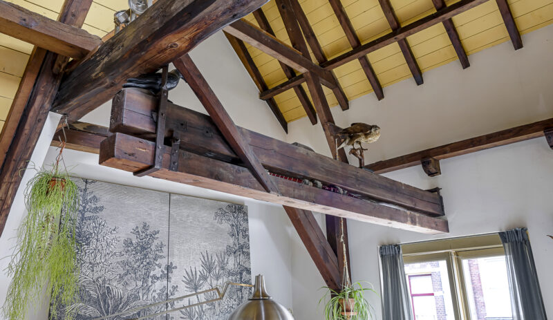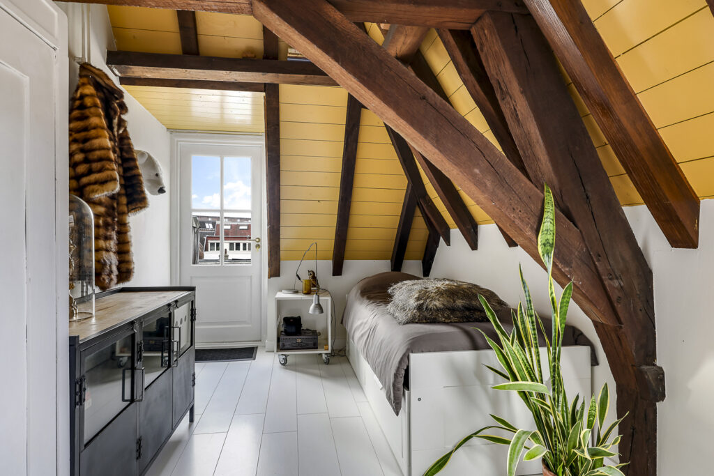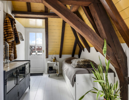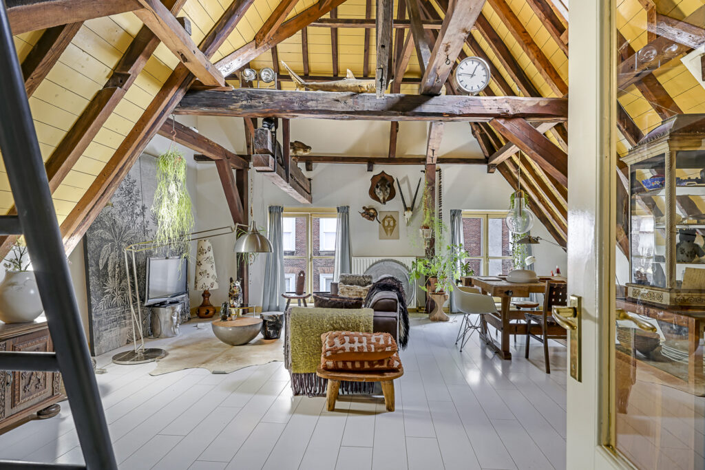 Zodra je via de entree de woonkamer binnenstapt, trekken de houten balken en het hoge plafond meteen de aandacht. De woonkamer ademt ruimte en karakter. Dankzij de grote ramen is het hier heerlijk licht. In de zomer zet je de openslaande ramen wijd open en geniet je van de levendige sfeer van de Bakkerstraat beneden.