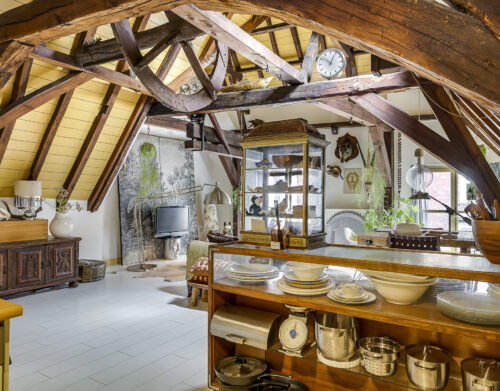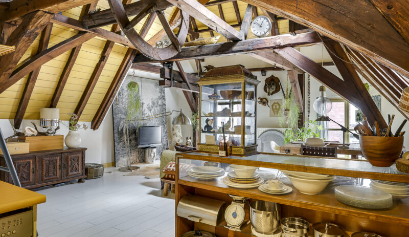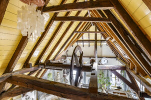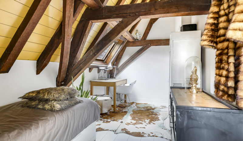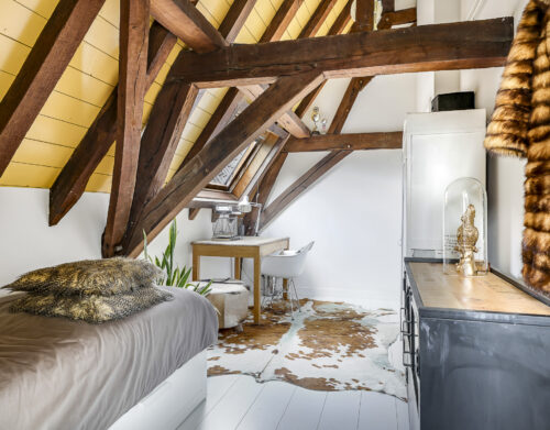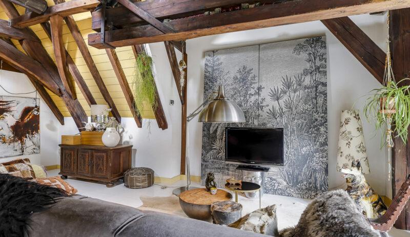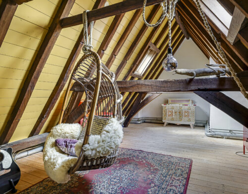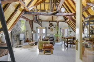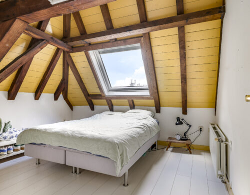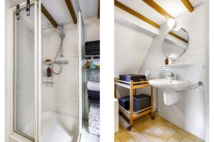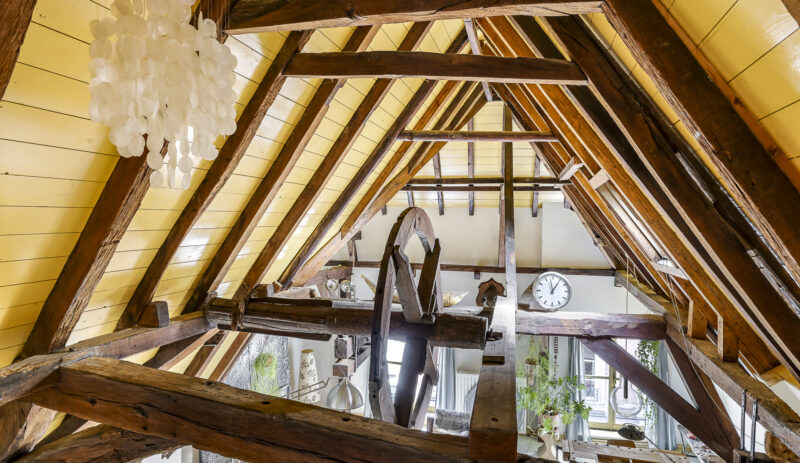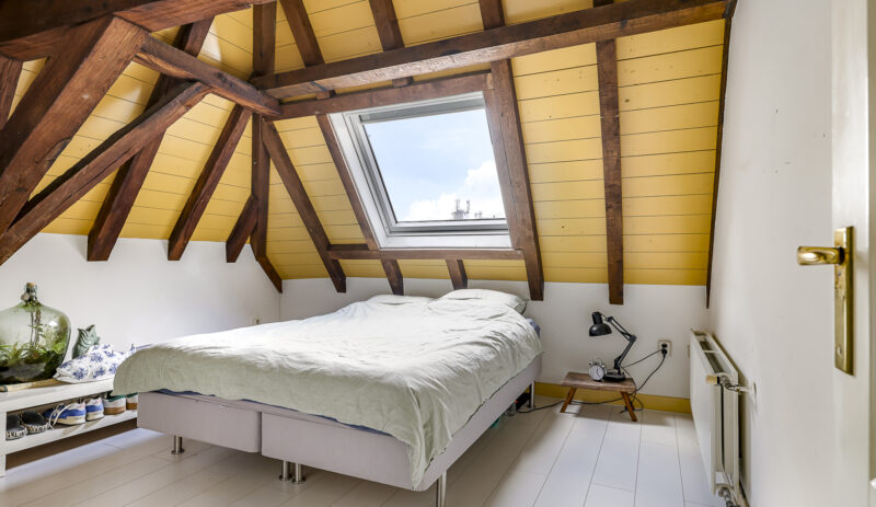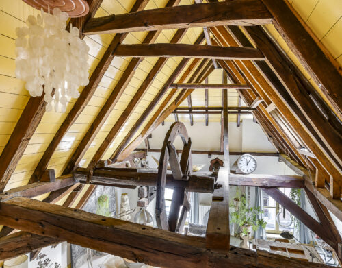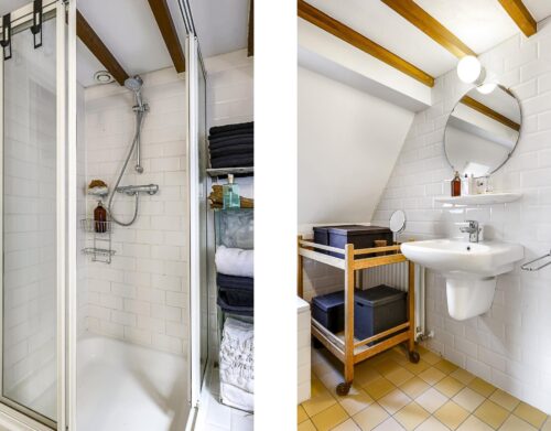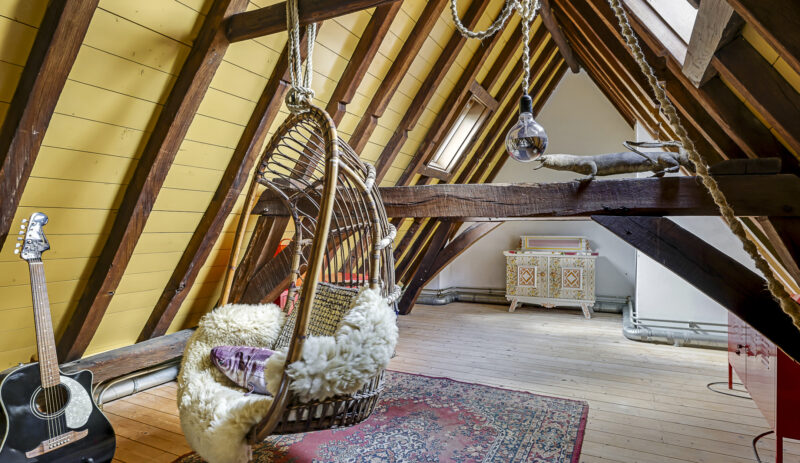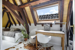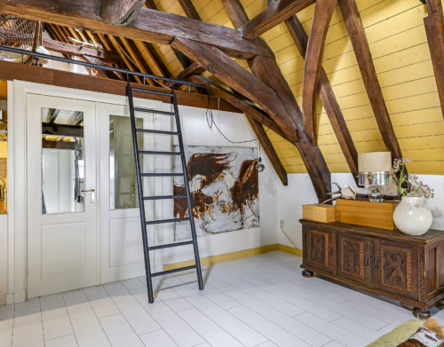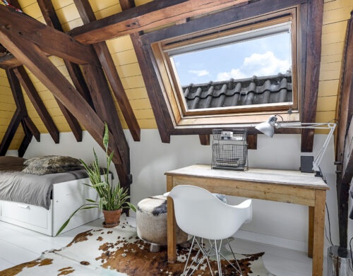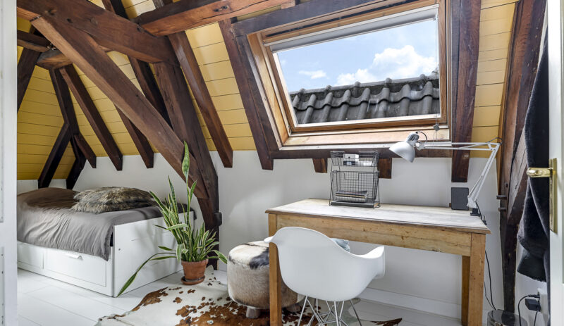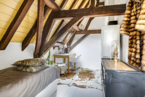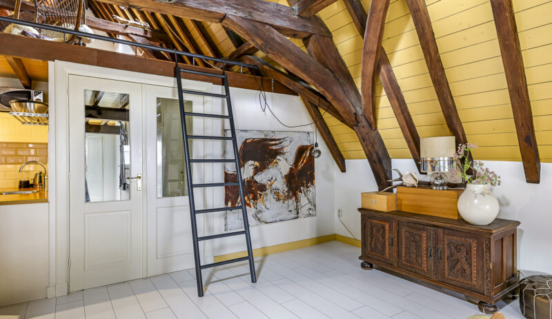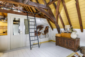 De twee ruime slaapkamers hebben beide het warme karakter van de houten balken, wat een intieme en romantische sfeer creëert. Vanuit één van de slaapkamers loop je direct door naar het dakterras.