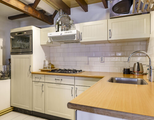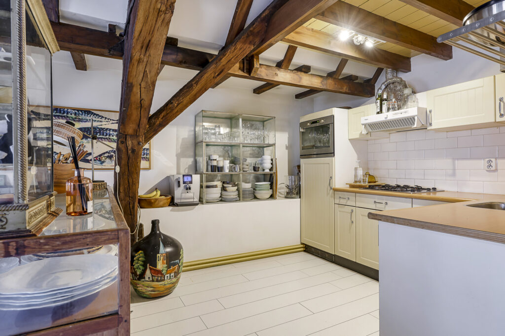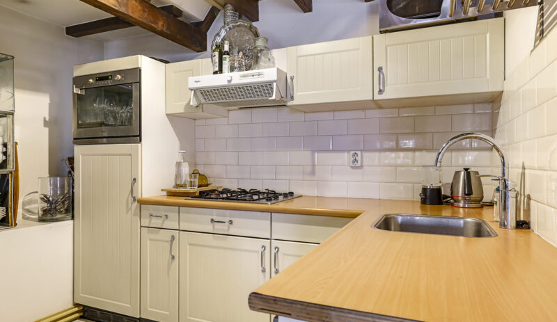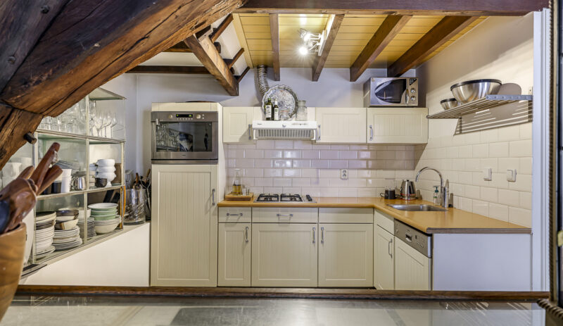 De Open keuken sluit perfect aan bij de stijl van de woonkamer. Hier kook je met plezier: de keuken is volledig uitgerust met een combi oven, vaatwasser, koelkast en een 4-pits gasfornuis. Terwijl je staat te koken, blijf je in contact met de rest van de leefruimte.
