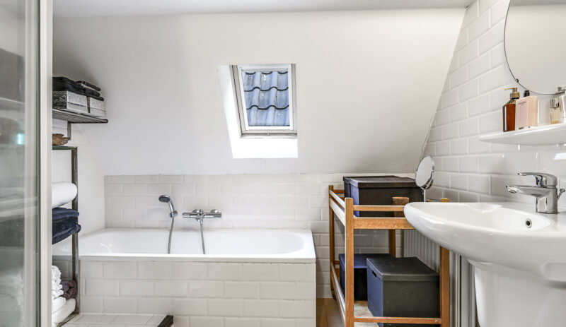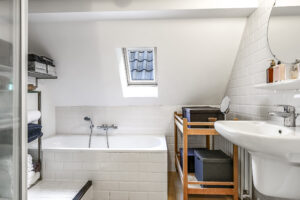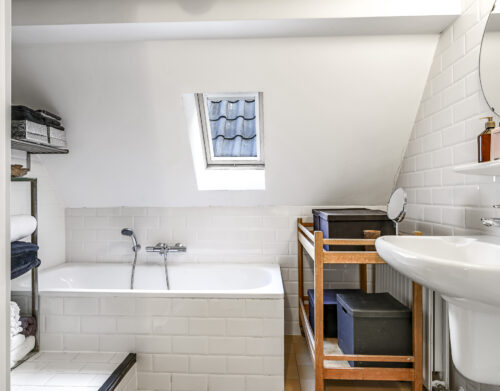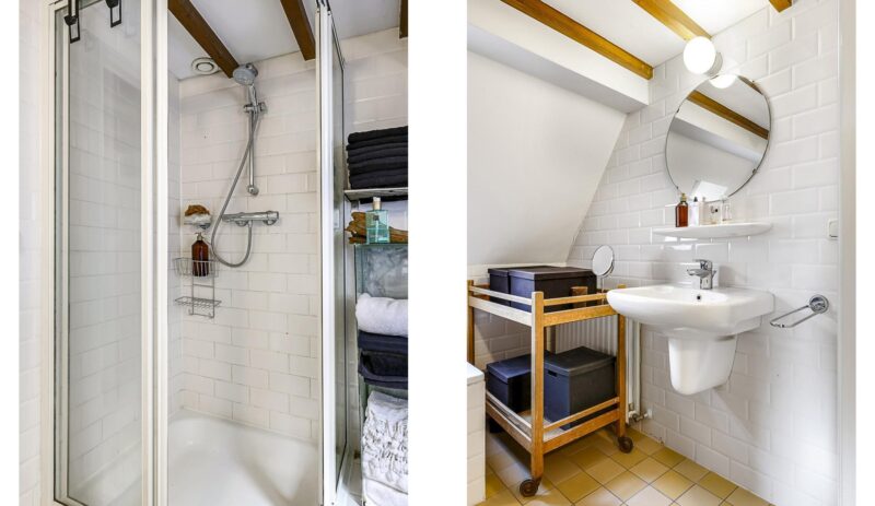 De ruime badkamer is voorzien van een ligbad, douchecabine en wastafel. Het dakraam zorgt voor een mooie lichtinval en een prettige sfeer.