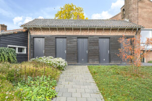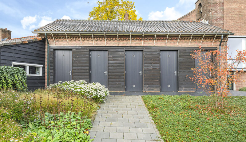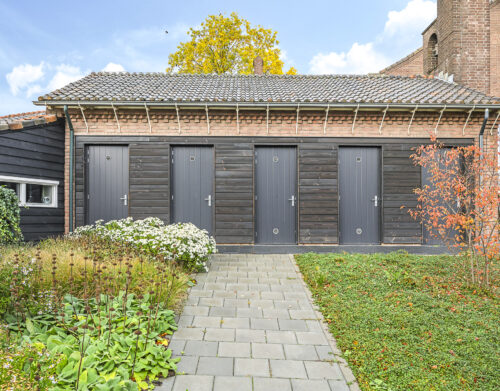 Aan de achterzijde van het complex bevind zich een separaat gebouwtje met hierin de bergingen. Deze privé berging is ruim, eenvoudig te bereiken met de fiets en voorzien van elektra.