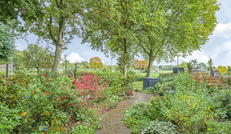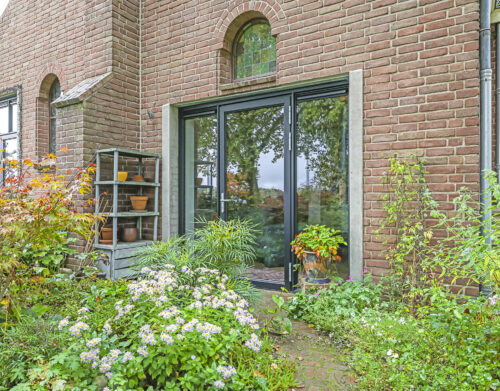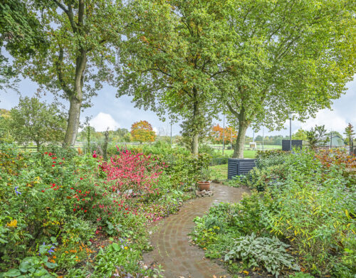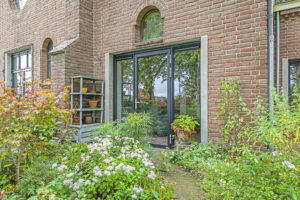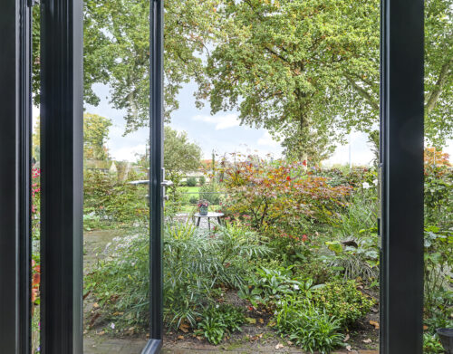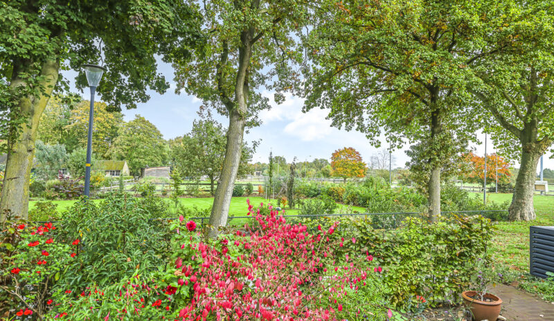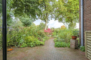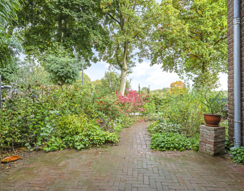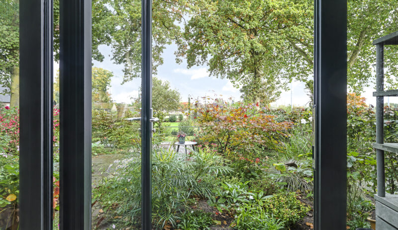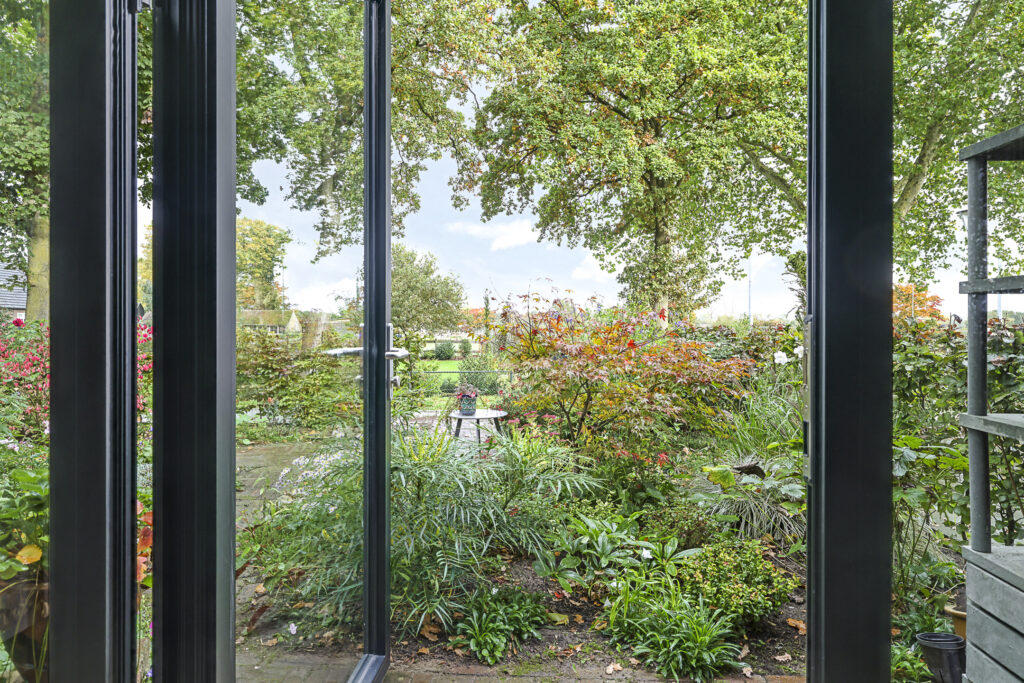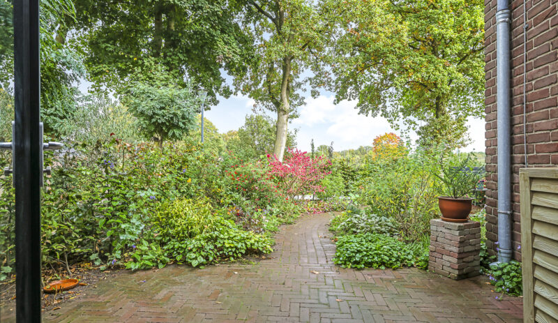 Zowel vanaf de zit als de eethoek krijg je rechtstreeks toegang tot de bijbehorend tuin. Deze buitenruimte is sfeervol en groen aangelegd en bied een vrij uitzicht richting een weide met paarden. De woning is via de tuin met achterom ook rechtstreeks te betreden.