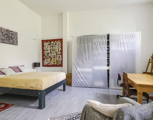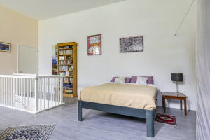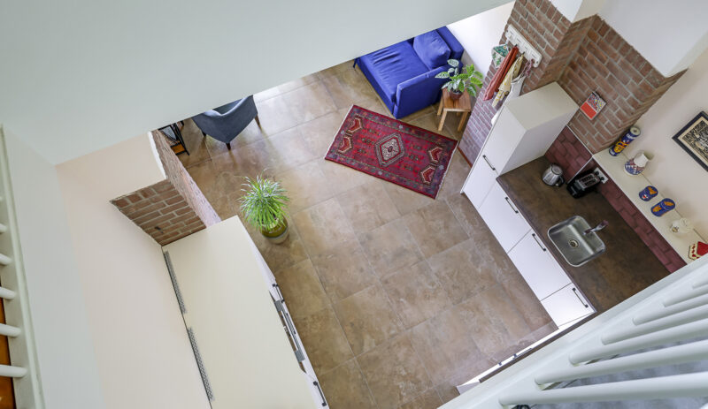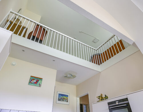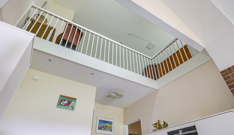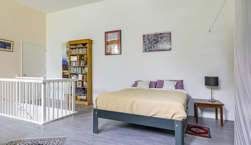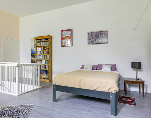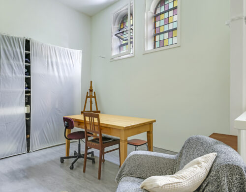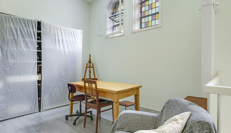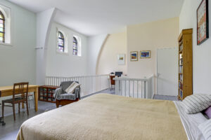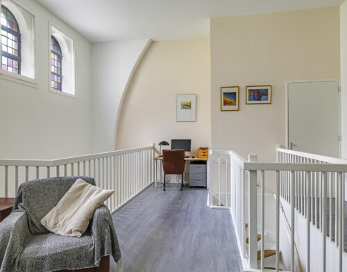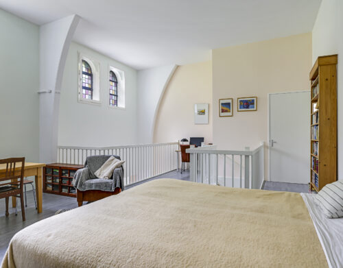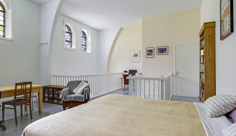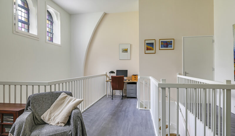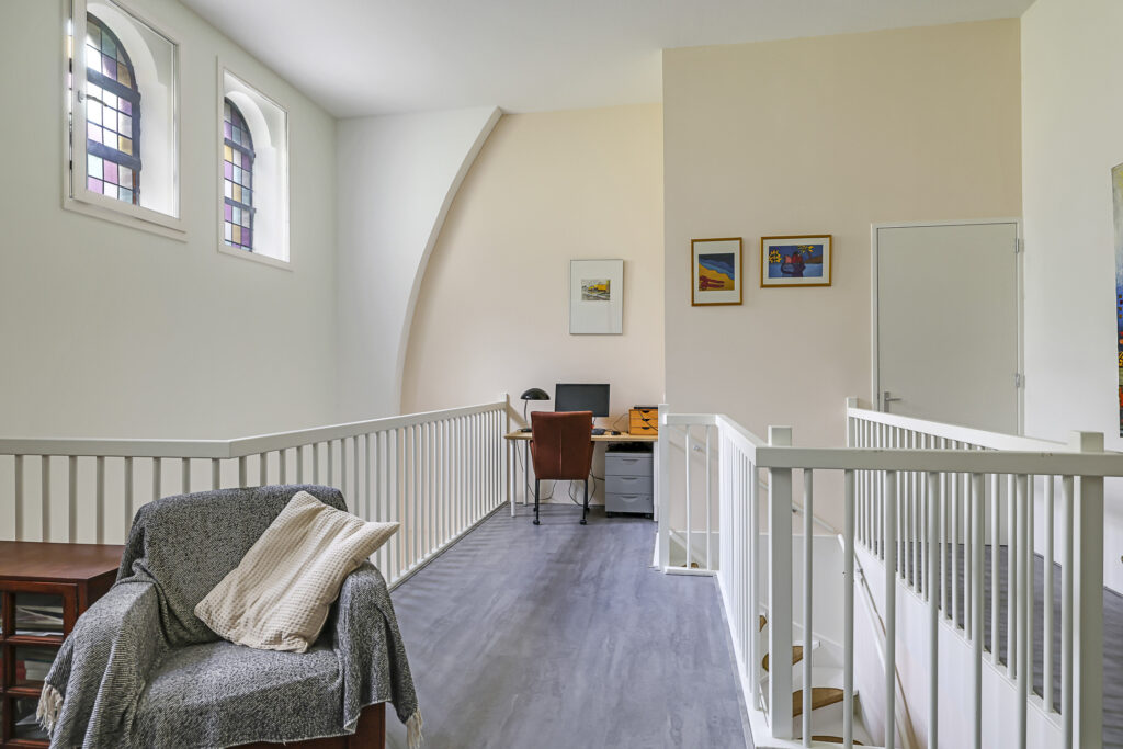 Via een vaste trap bereik je een zeer ruime vide waar zich de slaapruimte, een thuiswerk plek en een ruime bergkast bevinden. Ook op deze verdieping zijn verschillende authentiek details van het kerkgebouw mooi bewaard gebleven waaronder de originelen glas in lood ramen. De verdieping is ruim genoeg om desgewenst een tweede toilet dan wel badkamer toe te voegen.