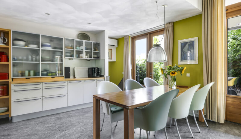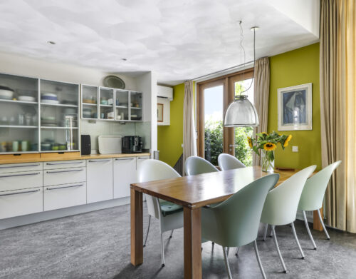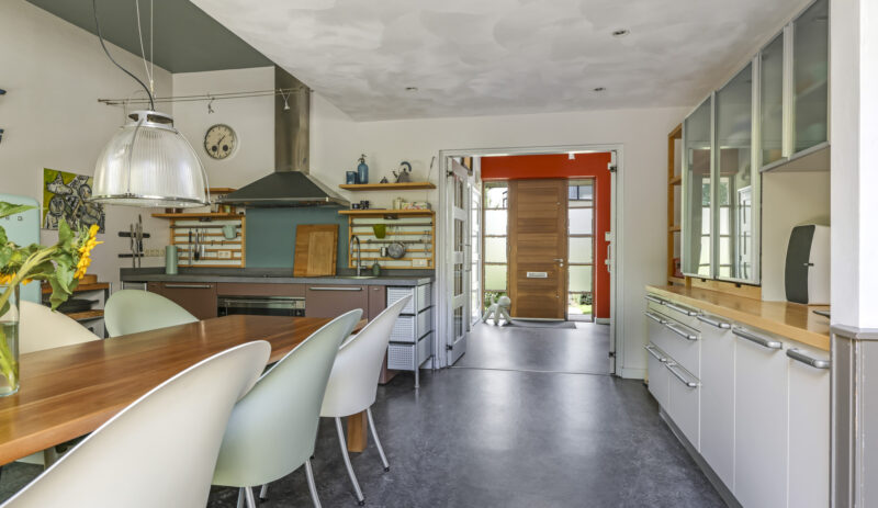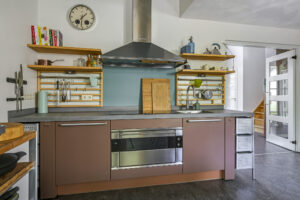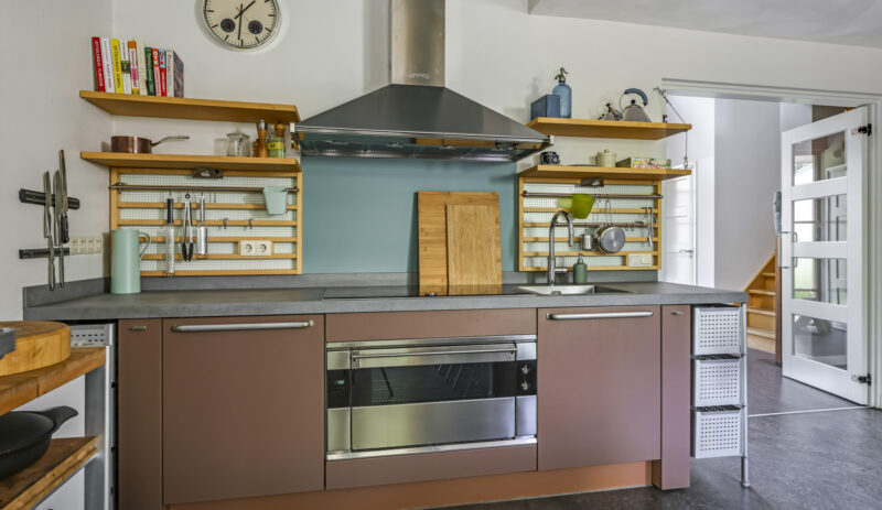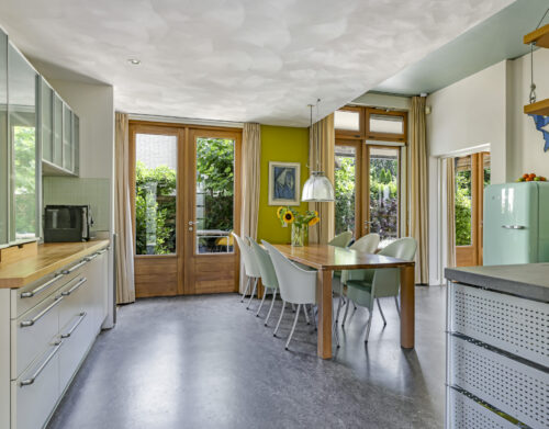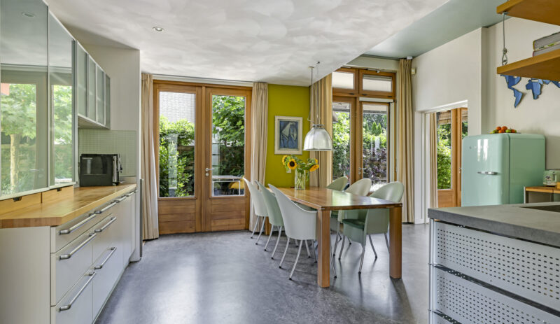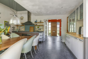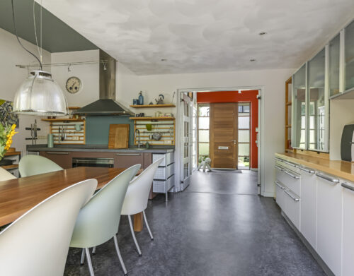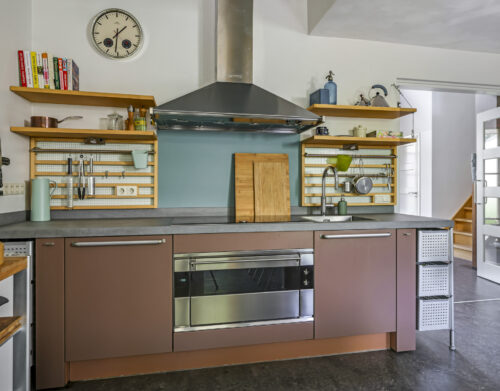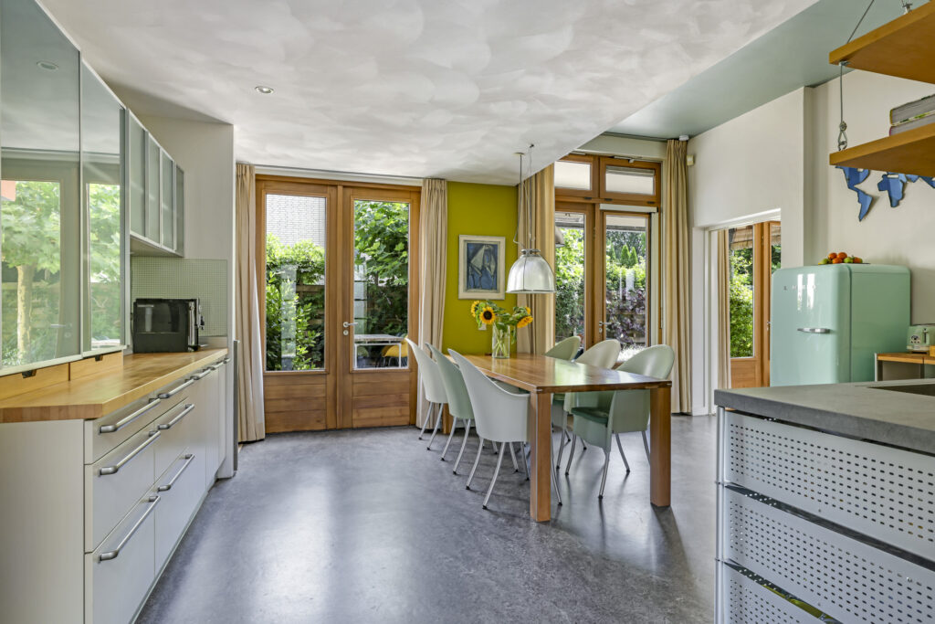De woonkeuken vormt het kloppend hart van de woning: royaal opgezet, voorzien van moderne inbouwapparatuur aangevuld me een karaktervolle Smeg-koelkast die achterblijft. Hier kookt u niet alleen, maar beleeft u het samenzijn met familie en vrienden.