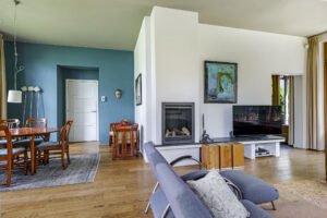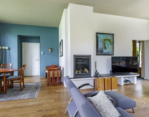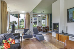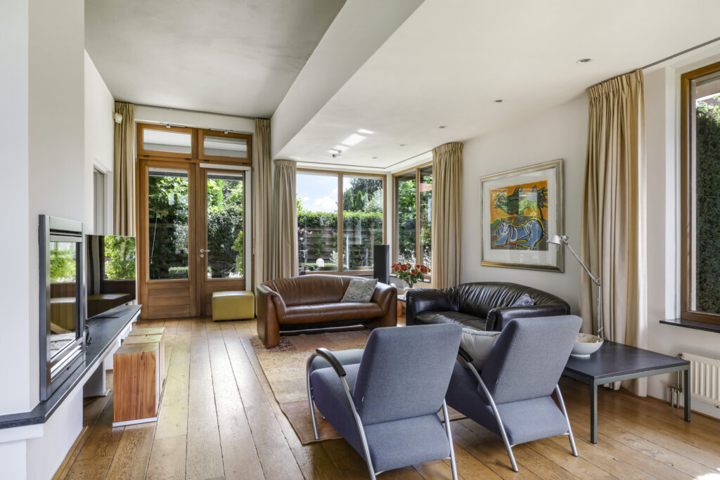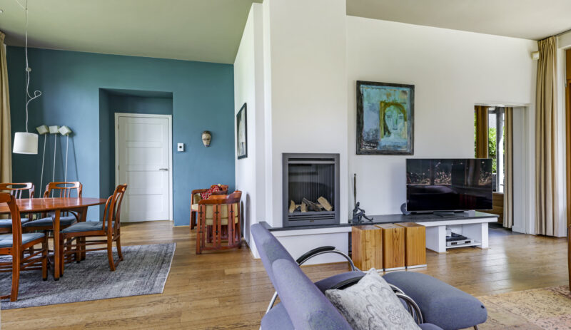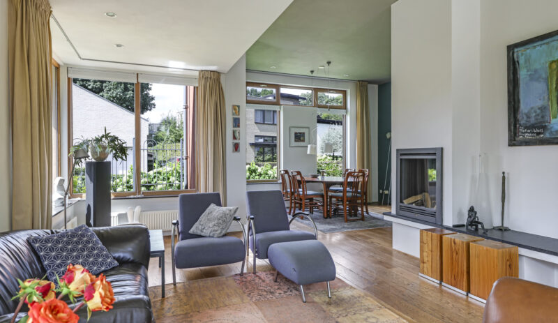 • Royale woonkamer met houten vloer en sfeervolle gashaard