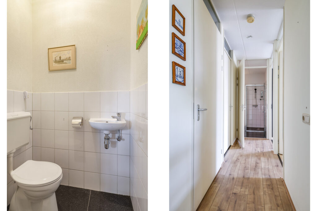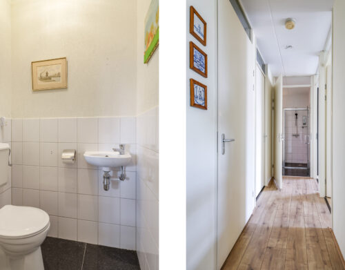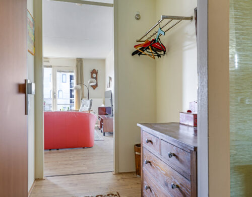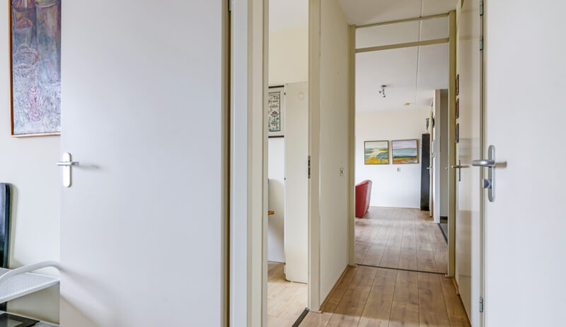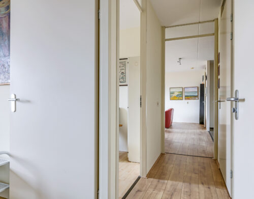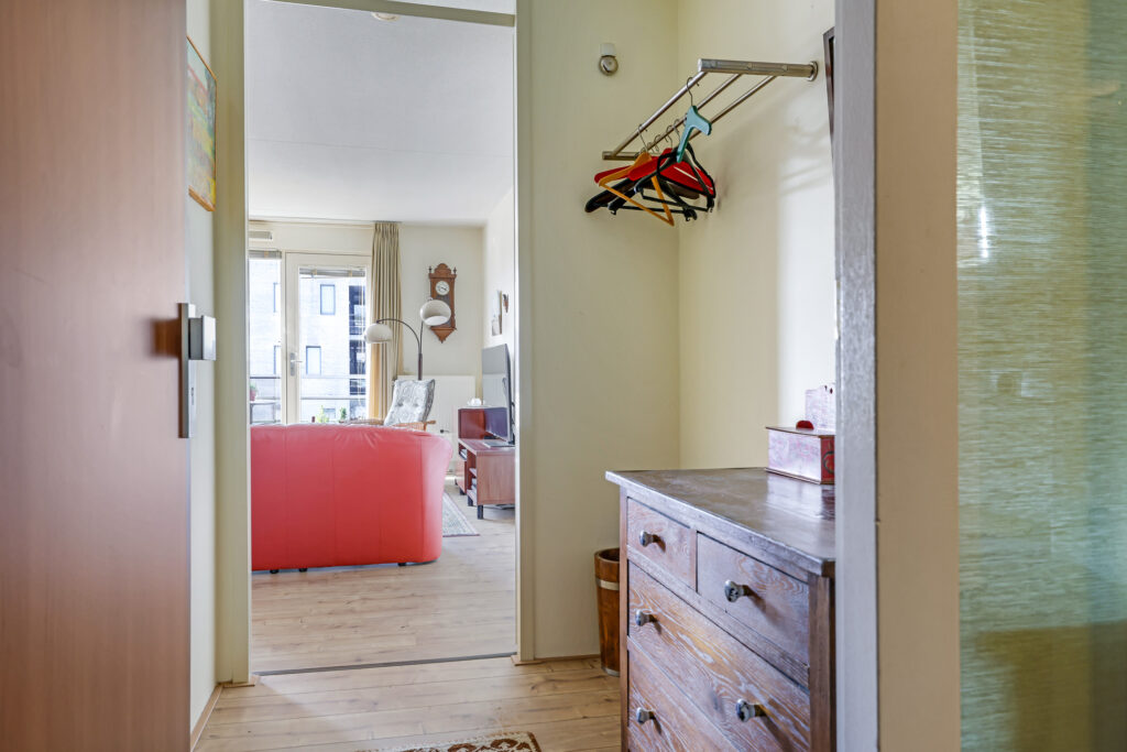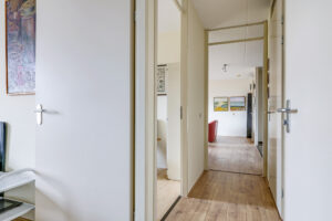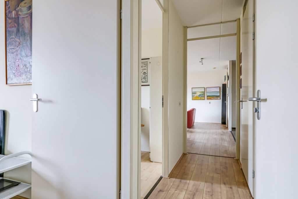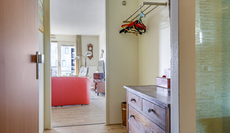 Bij binnenkomst in het appartement valt direct de ruime hal op, voorzien van een moderne laminaatvloer. Vanuit deze hal zijn de woonkamer en de keuken bereikbaar. Aan de andere zijde van het appartement bevinden zich het toilet met fontein, de wasruimte, de badkamer en de twee slaapkamers.