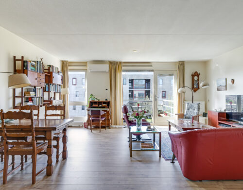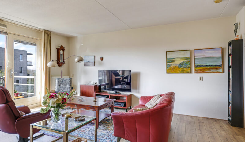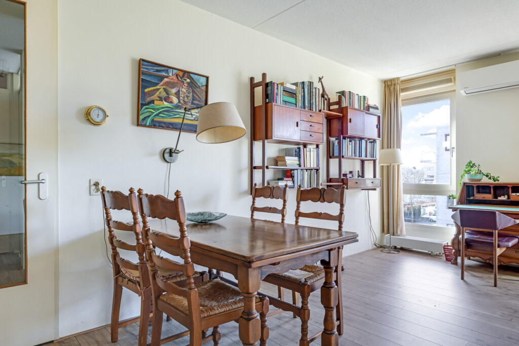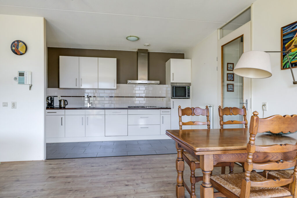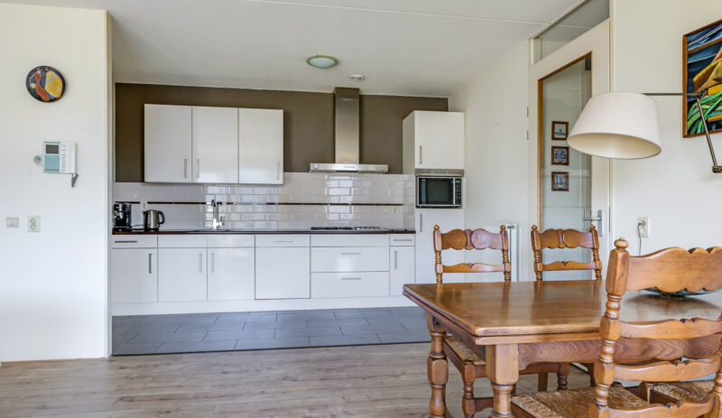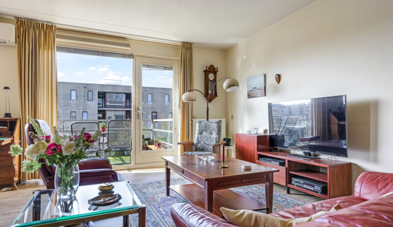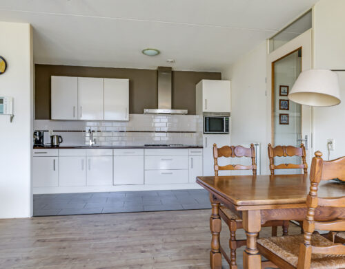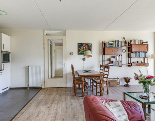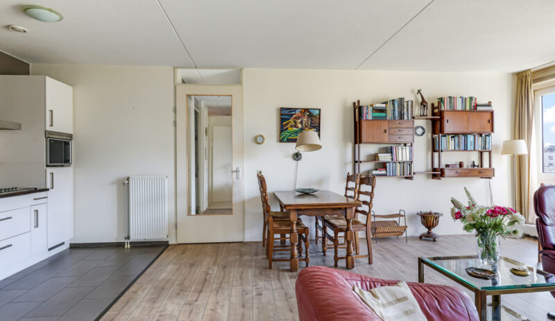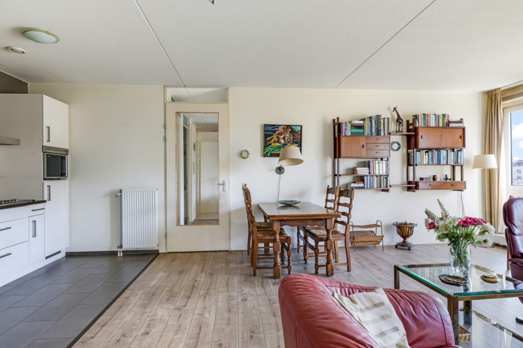 De ruime en lichte woonkamer met open keuken (2006) vormt het hart van het appartement. De keuken is modern uitgevoerd en voorzien van diverse inbouwapparatuur, waaronder een vaatwasser, gaskookplaat, koelkast en afzuigkap. De grote raampartijen zorgen voor een aangename hoeveelheid daglicht, waardoor de ruimte extra ruim en sfeervol aanvoelt. Vanuit de woonkamer heb je direct toegang tot het zonnige balkon, gelegen op het zuidwesten.
