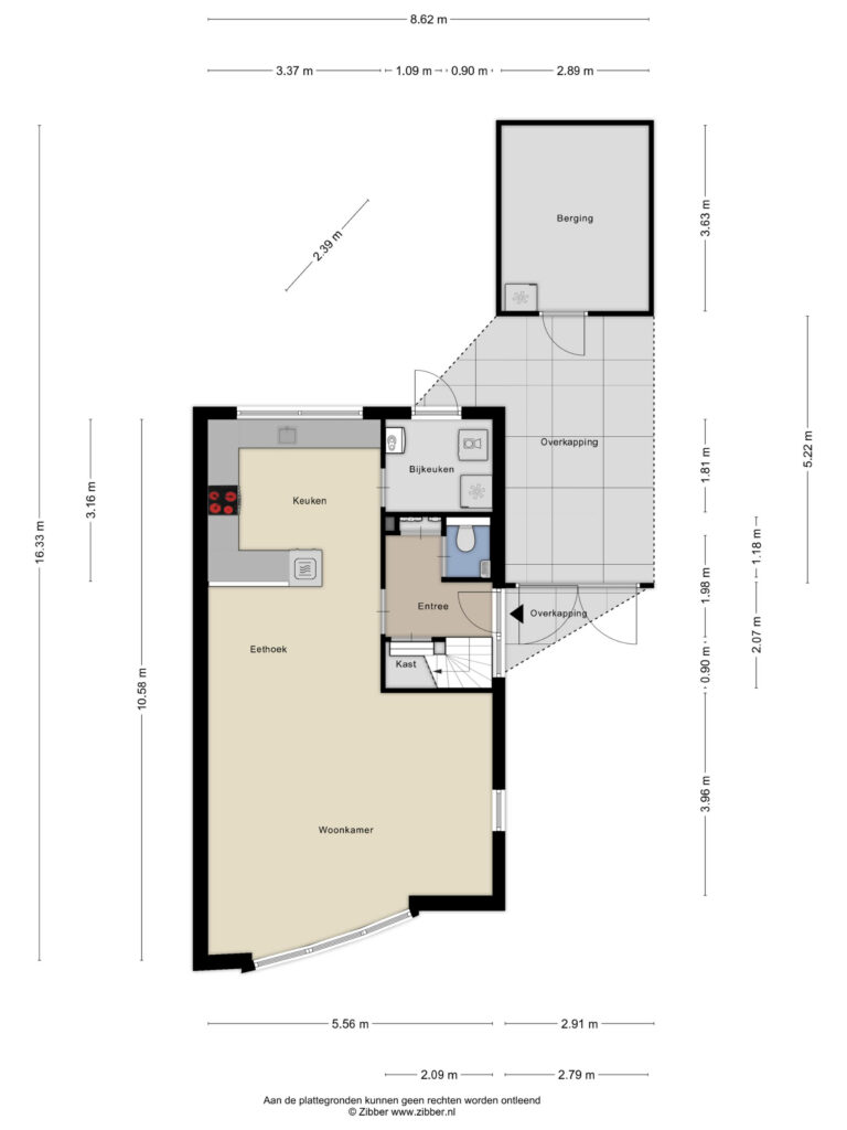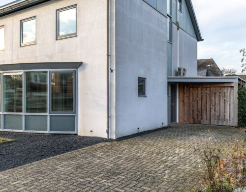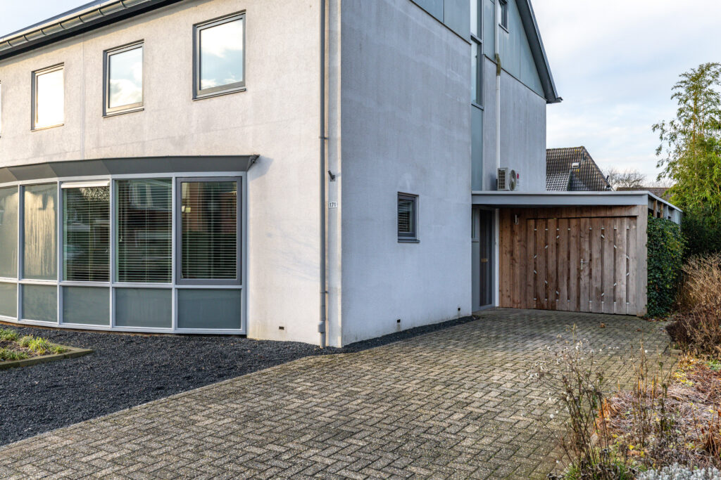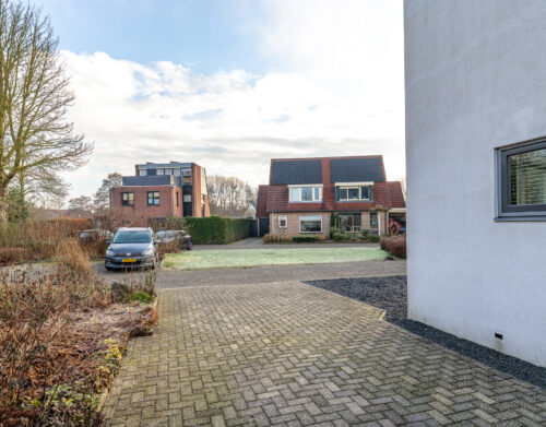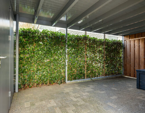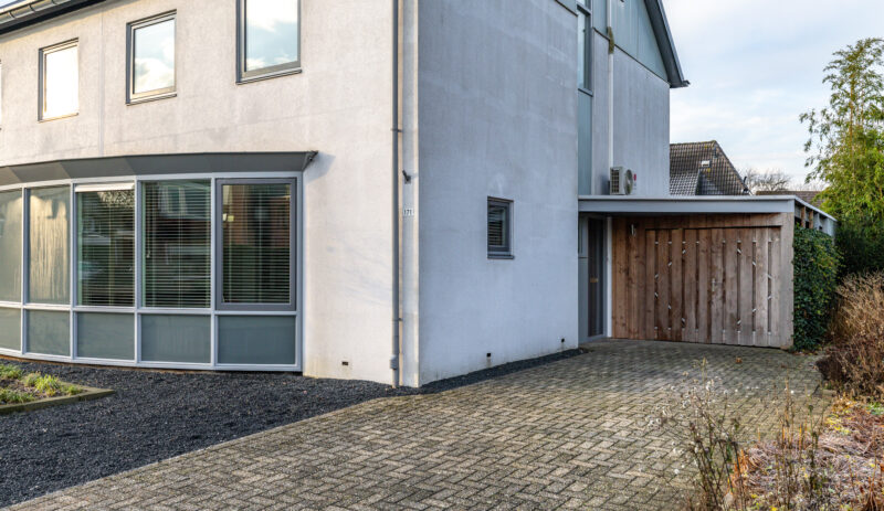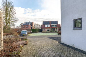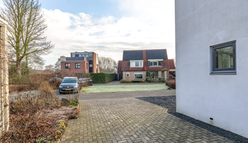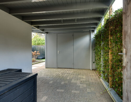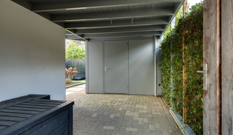 Aan de voorzijde beschikt de woning over een eigen oprit, geschikt voor het parkeren van meerdere auto’s op eigen terrein. De voormalige carport is in gebruik genomen als overkapping / bergruimte. Je zou er ook voor kunnen kiezen om dit gedeelte weer als carport te gebruiken.