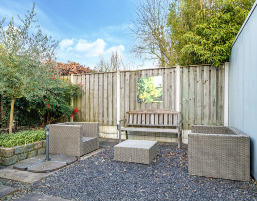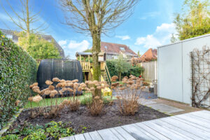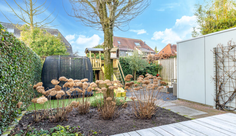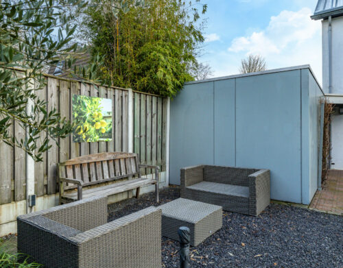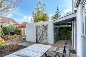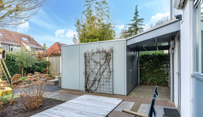 De privacyvolle achtertuin is gelegen op het zuidwesten, waardoor je hier optimaal kunt genieten van de middag- en avondzon. Wens je wat schaduw, dan biedt het grote zonnescherm aan de achtergevel uitkomst. De vrijstaande houten berging biedt ruimte voor fietsen, tuingereedschap en tuinmeubilair.