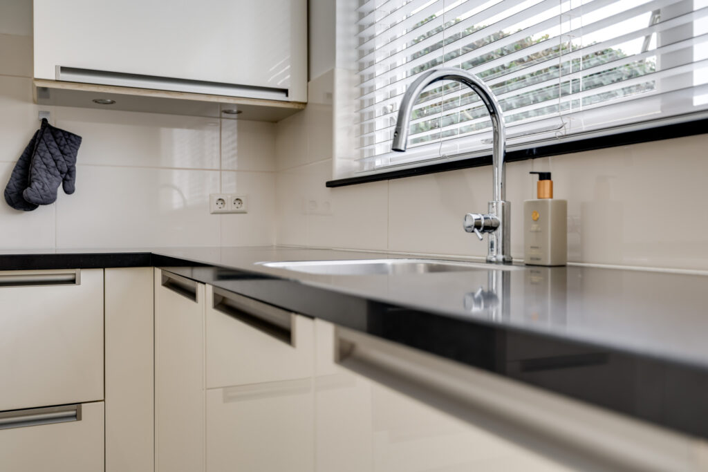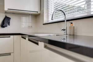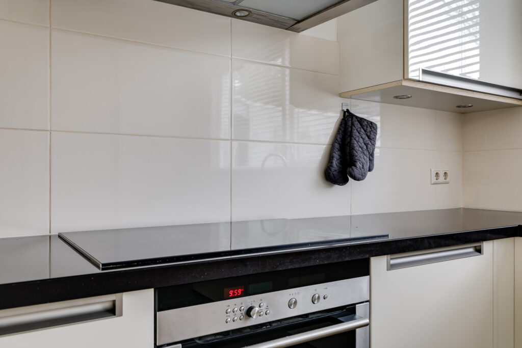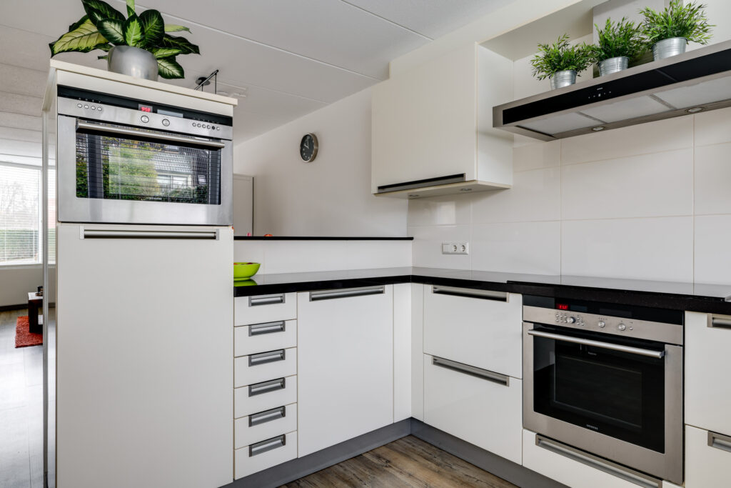 Overdekte entree, hal met moderne toiletruimte en verdiepte trapkast. Ruime en lichte woonkamer met sfeervolle erker en vrij uitzicht op het groen aan de voorzijde. De halfopen keuken is uitgevoerd in een praktische U-opstelling en voorzien van een hardstenen werkblad en diverse inbouwapparatuur, waaronder een koelkast, combi-stoomoven, combioven, vaatwasser, inductiekookplaat en afzuigschouw.