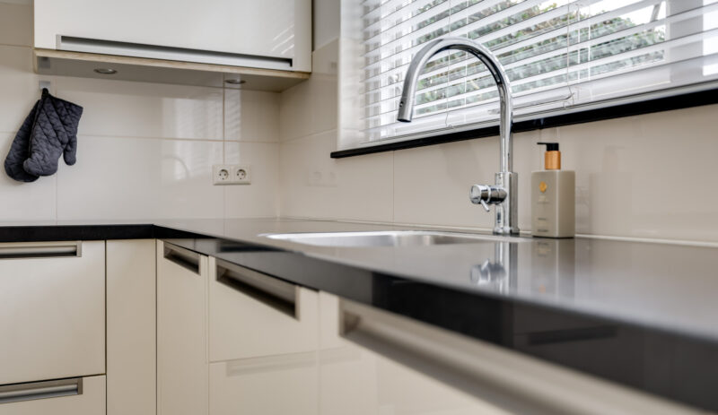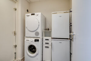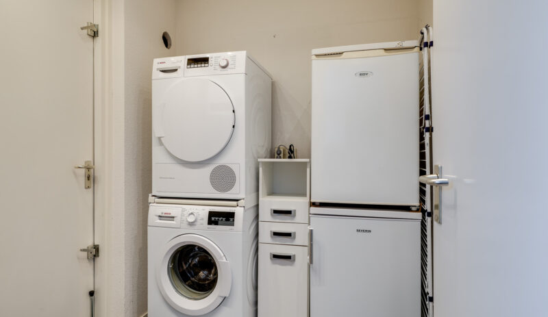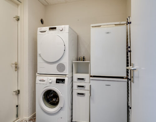 Aansluitend de praktische bijkeuken met veel bergruimte, uitstortgootsteen, aansluitingen voor wasmachine en droger en opstelling van de CV-ketel (Nefit, bouwjaar 2018).