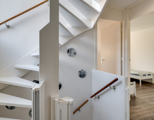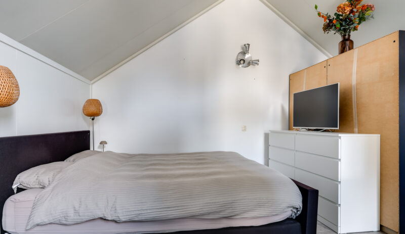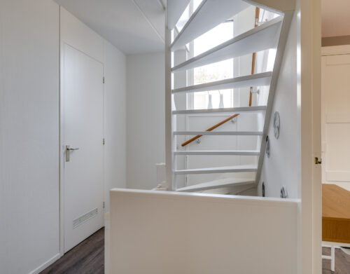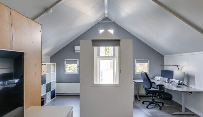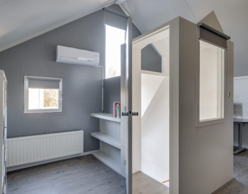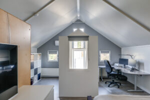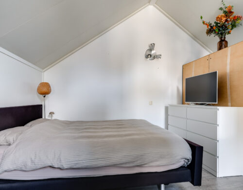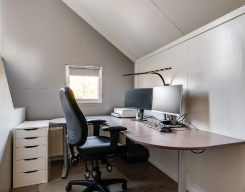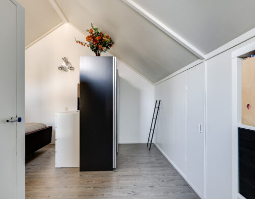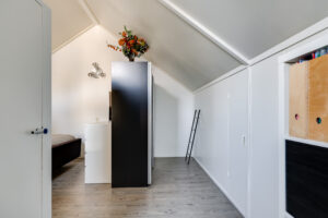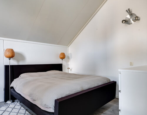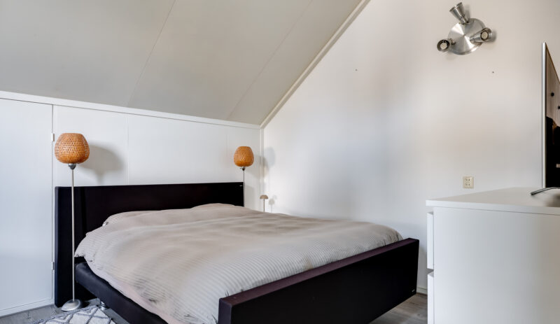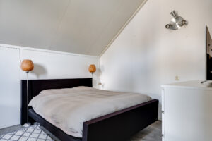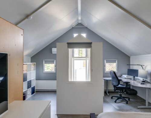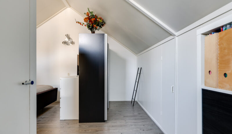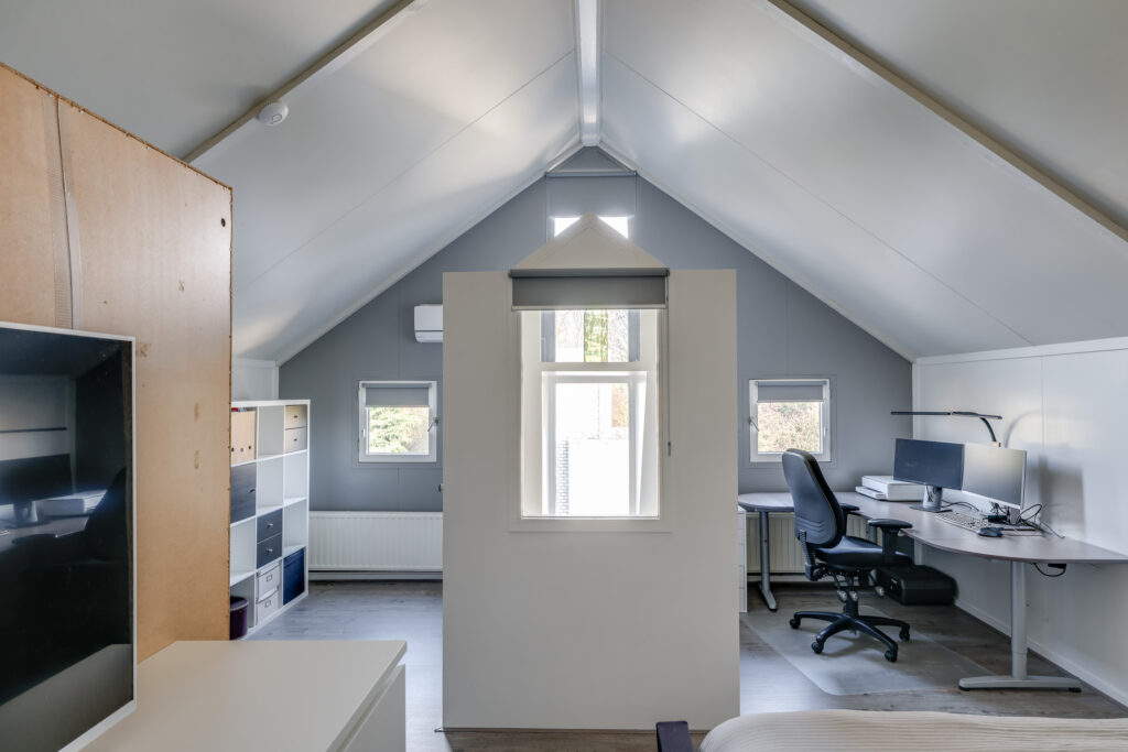 Via een vaste trap bereikbare royale verdieping met vierde slaap-/werkkamer, veel bergruimte achter de knieschotten en een airco-installatie (2022), wat deze verdieping ook in de zomermaanden zeer comfortabel maakt.