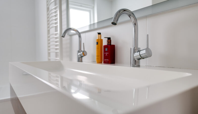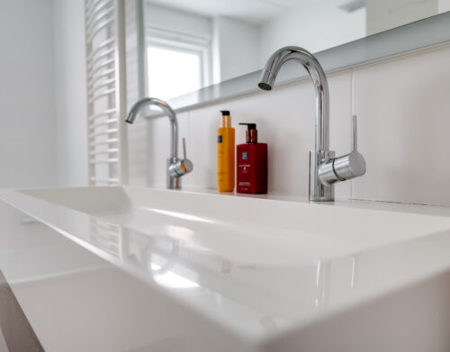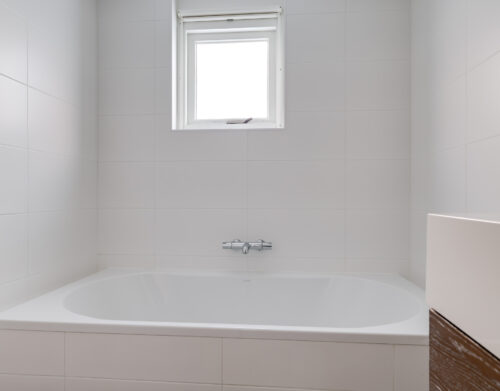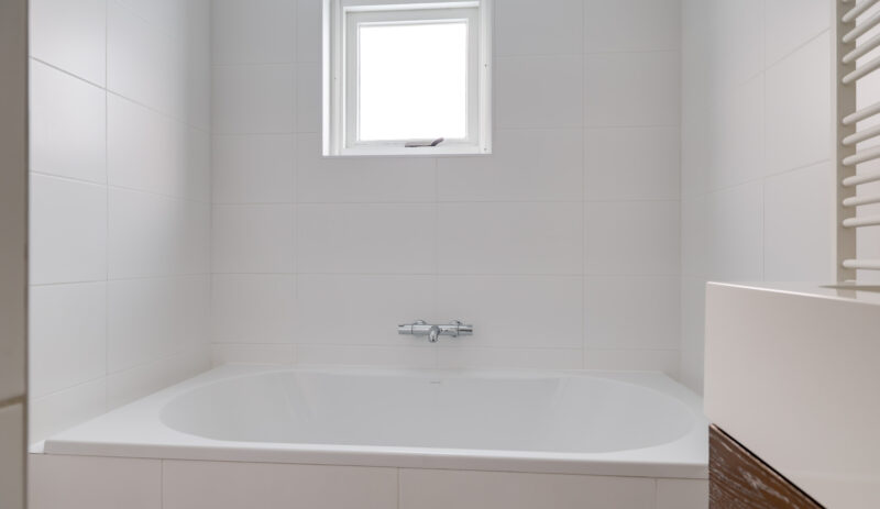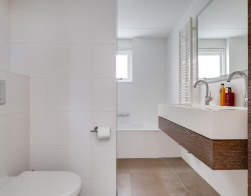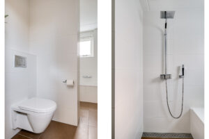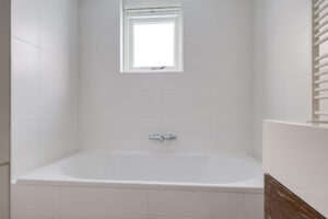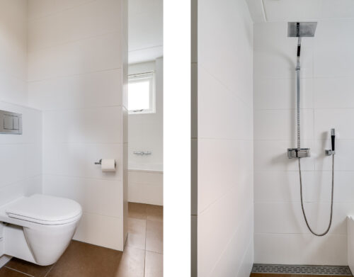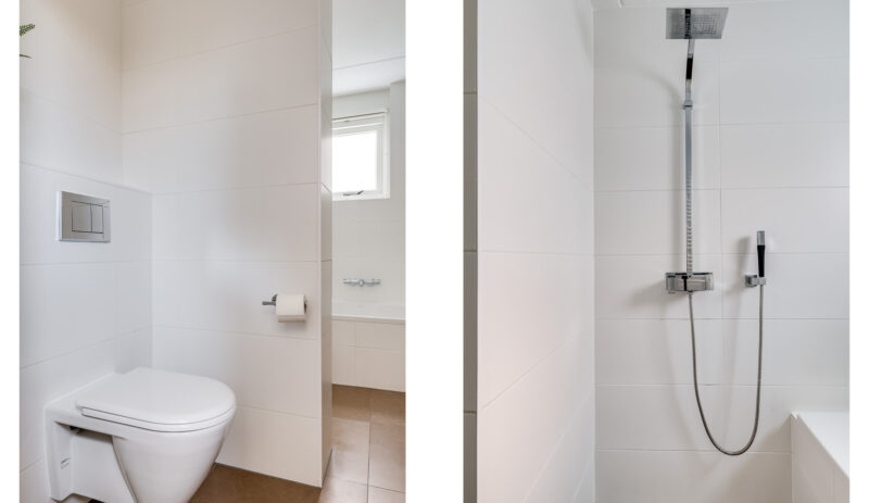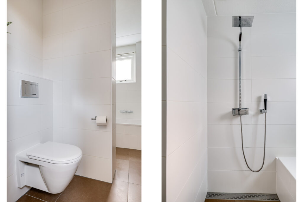 Overloop, drie ruime slaapkamers en een complete badkamer met ligbad, inloopdouche met regendouche, wastafelmeubel met dubbele wastafel, tweede toilet, designradiator en vloerverwarming. Ook deze verdieping is afgewerkt met een nette PVC-vloer.