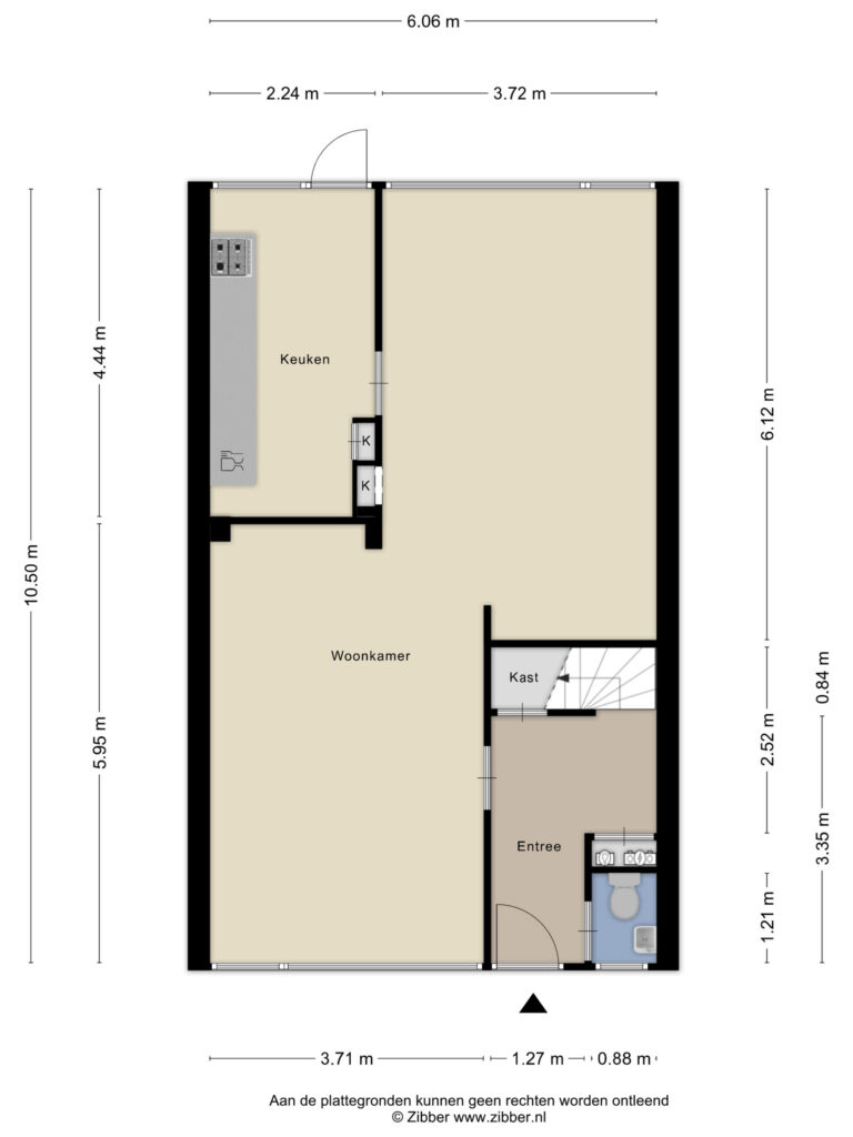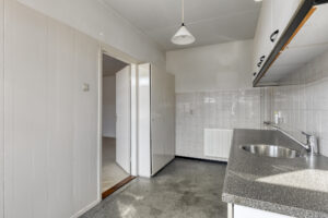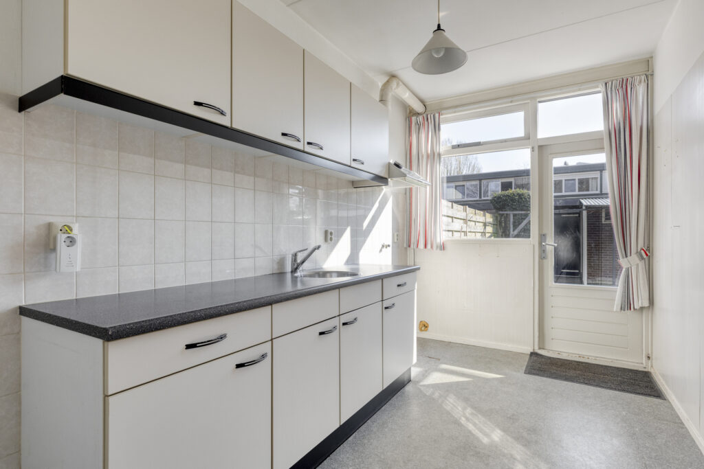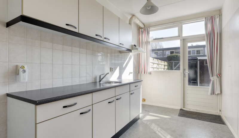 De gesloten keuken beschikt over een eenvoudig keukenblok en praktische vaste kasten. Vanuit de keuken loop je direct de achtertuin in.