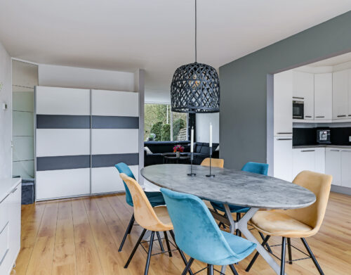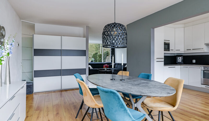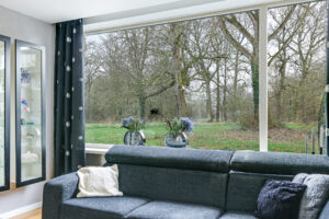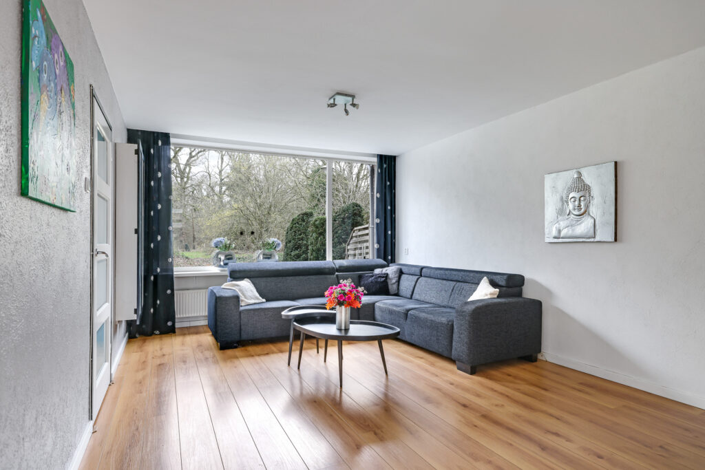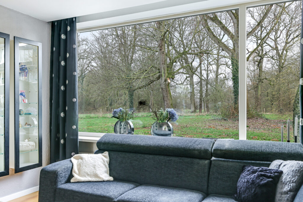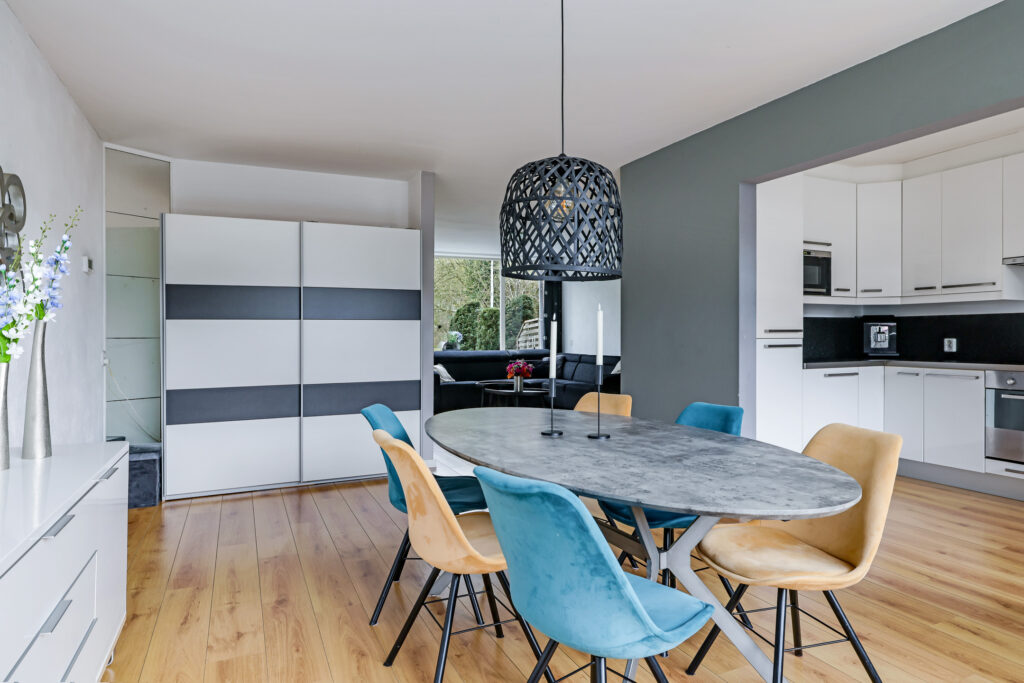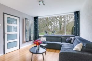 Via de entree kom je in de hal met toiletruimte, meterkast, trapopgang naar de verdieping en een praktische trapkast voor proviand. De woonkamer is uitgevoerd in een karakteristieke Z-vorm en biedt met circa 42 m² verrassend veel leefruimte. Dankzij deze indeling ontstaat er een natuurlijke scheiding tussen de zitkamer en de eetkamer, wat zorgt voor een ruimtelijke en sfeervolle opzet. Aan de voorzijde is er een heerlijk vrij uitzicht over de groene omgeving.