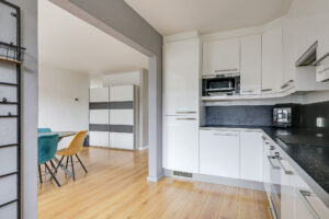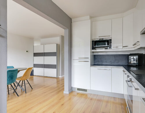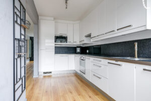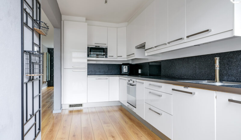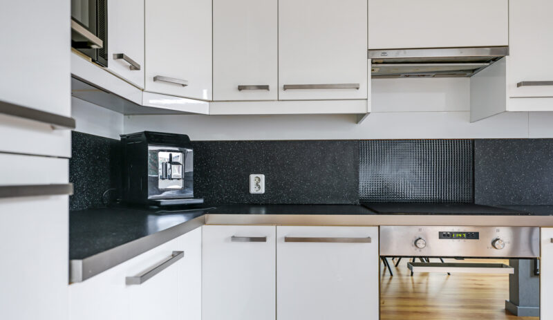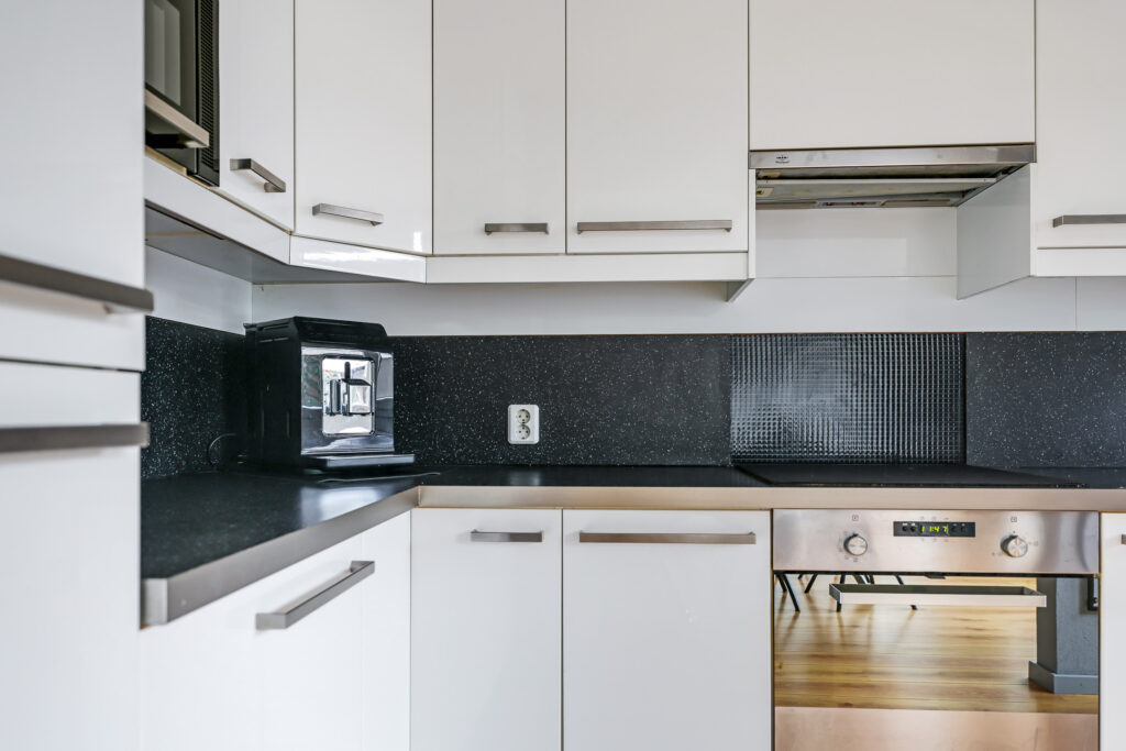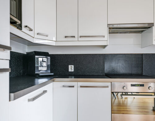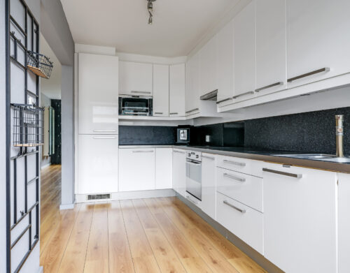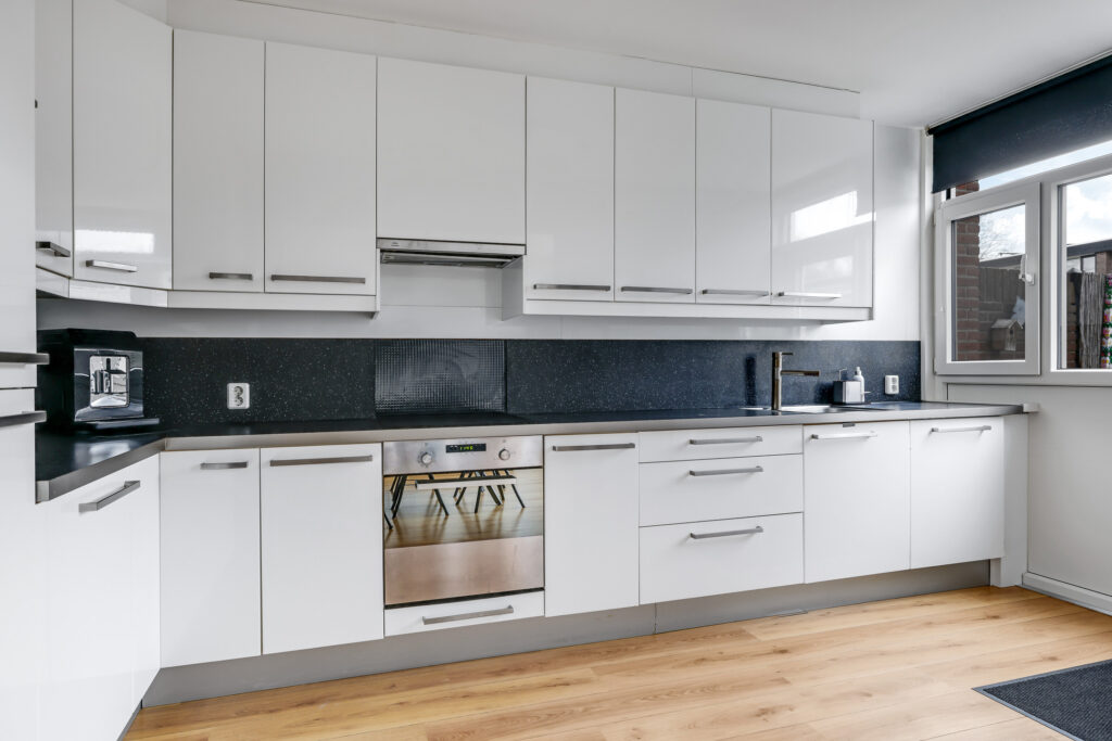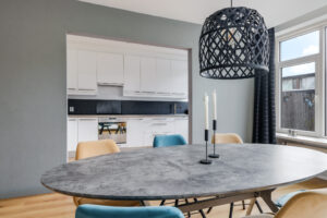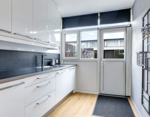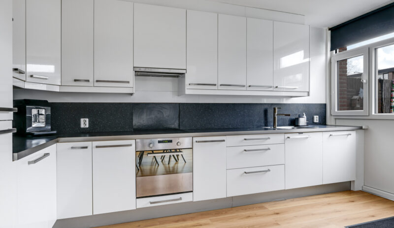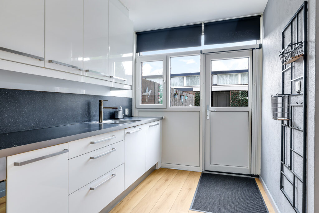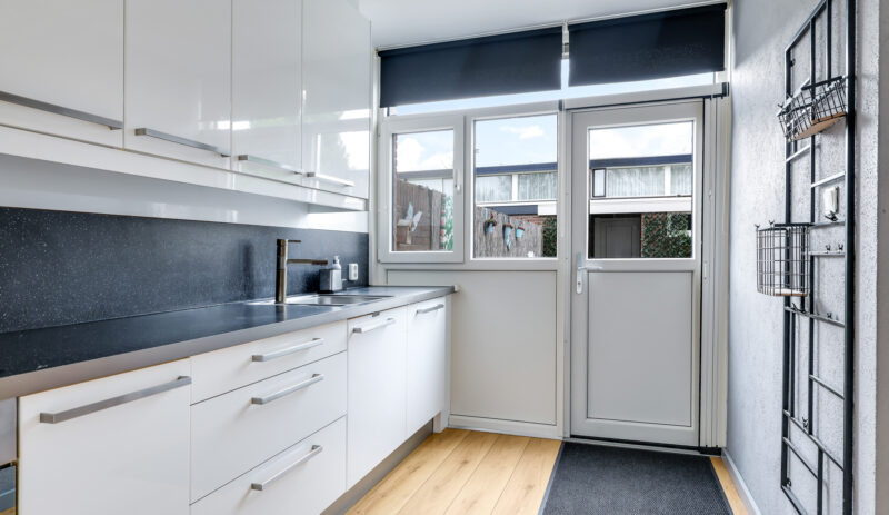 De halfopen keuken is geplaatst in een hoekopstelling en voorzien van diverse inbouwapparatuur, waaronder een koelkast, diepvries, magnetron, oven, vaatwasser, inductiekookplaat en afzuigkap. Vanuit de keuken heb je direct toegang tot de achtertuin.