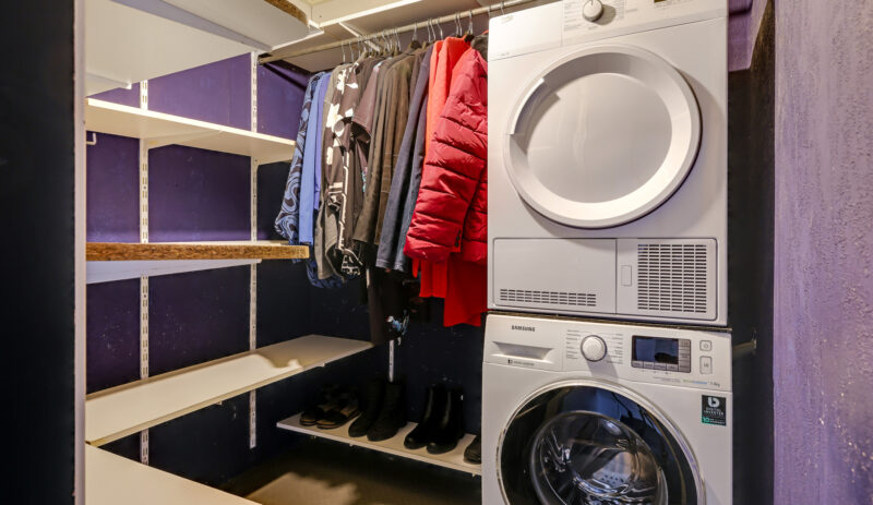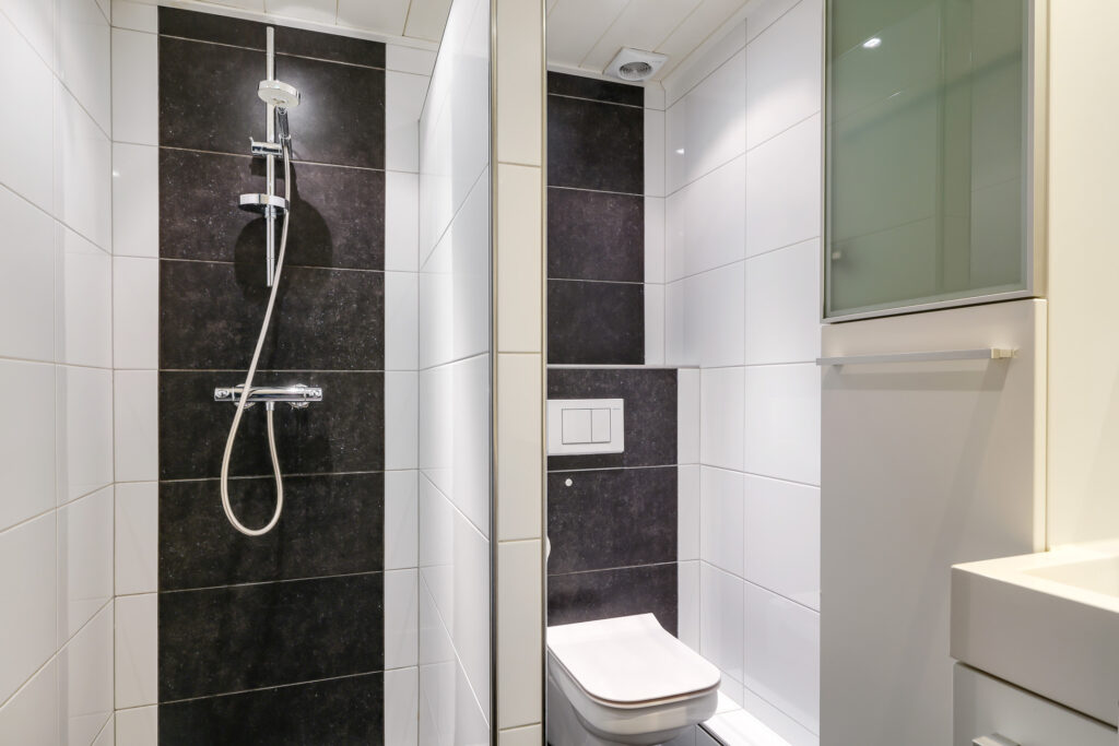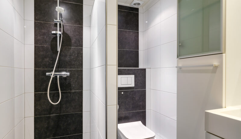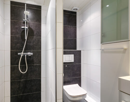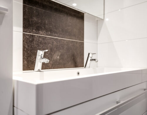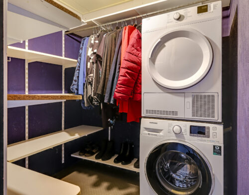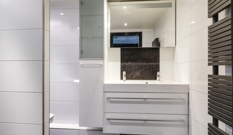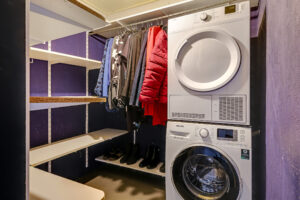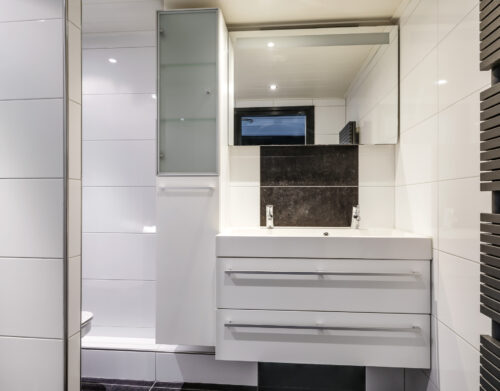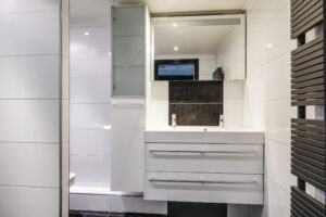 De moderne badkamer is uitgevoerd in een lichte, neutrale kleurstelling en voorzien van een inloopdouche, toilet en een dubbel wastafelmeubel. Op deze verdieping bevinden zich daarnaast nog een stookruimte met de CV-opstelling (Remeha Avanta, 2010) en een separate wasruimte met aansluitingen voor de wasapparatuur en extra bergruimte.