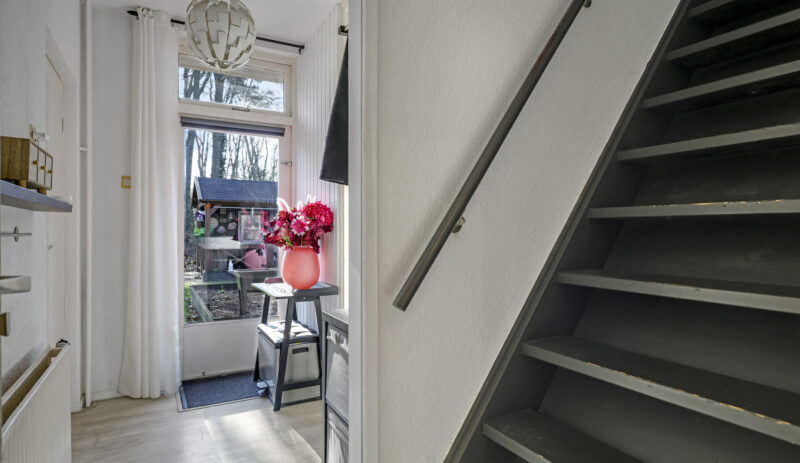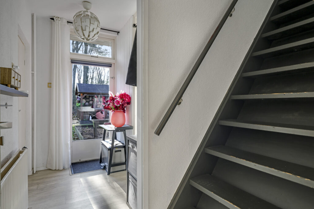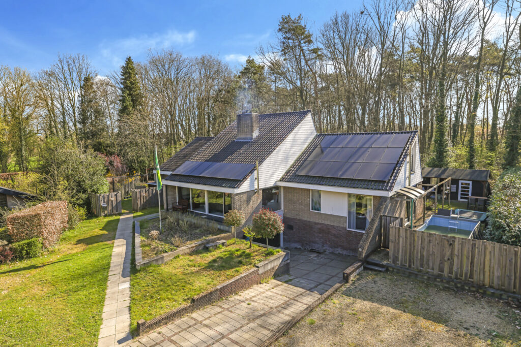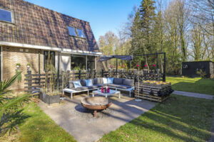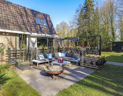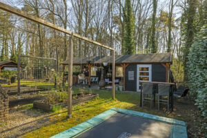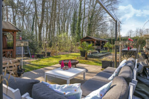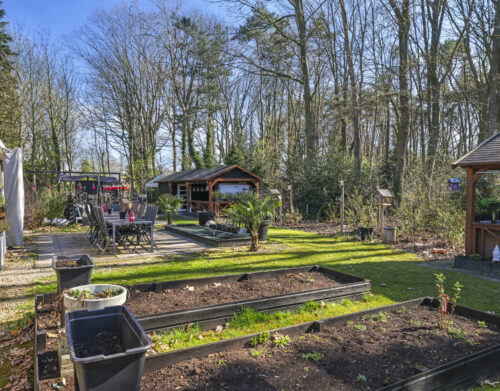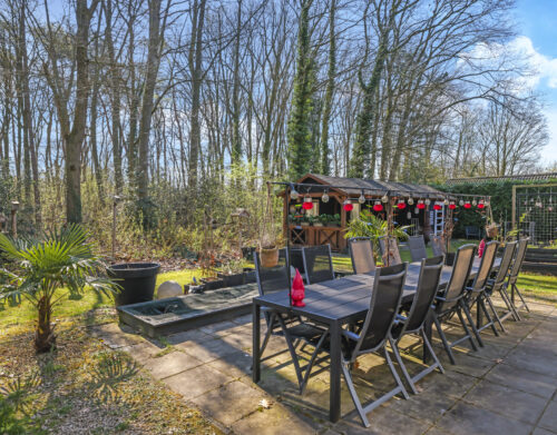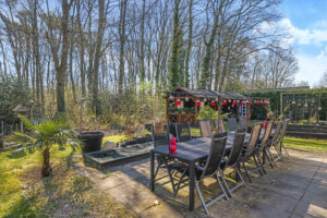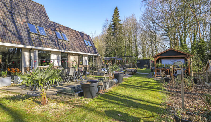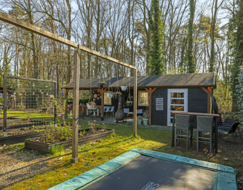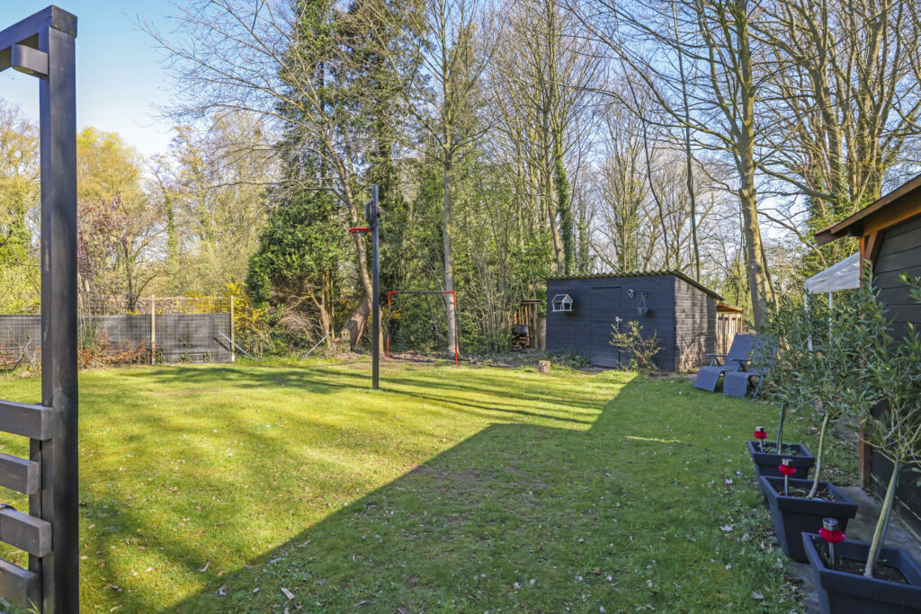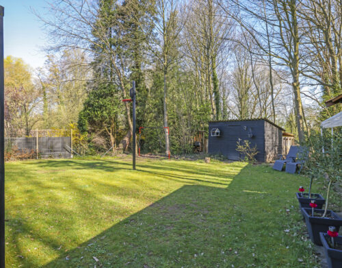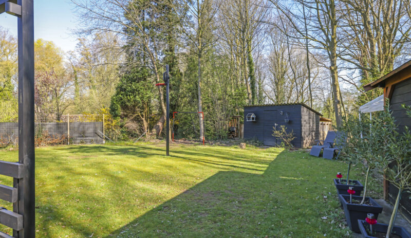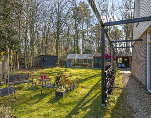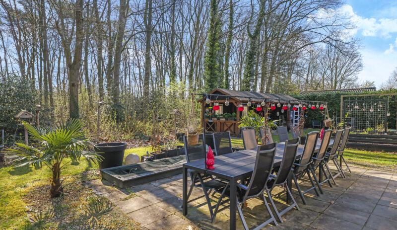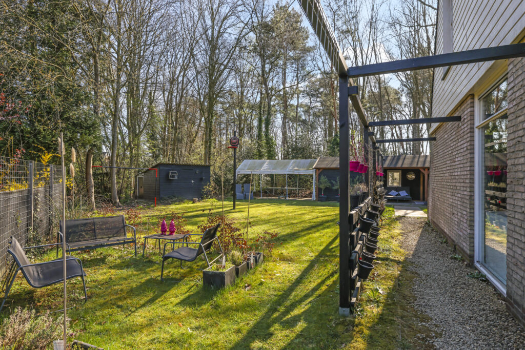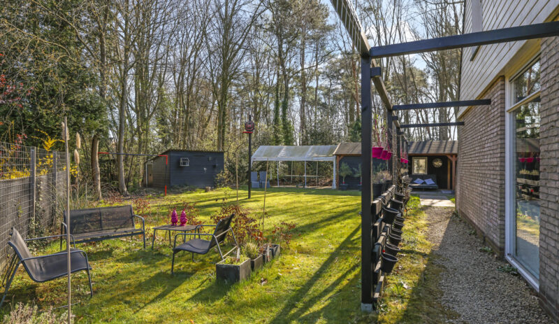 De woning is omgeven door een fantastische, brede achtertuin op het zuidoosten. Hier geniet u de hele dag door van zon, rust en volledige privacy. De tuin grenst direct aan een bosgebied, wat niet alleen zorgt voor een groene, natuurlijke achtergrond, maar ook voor een gevoel van vrijheid en beschutting.