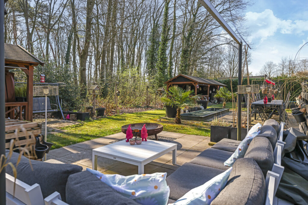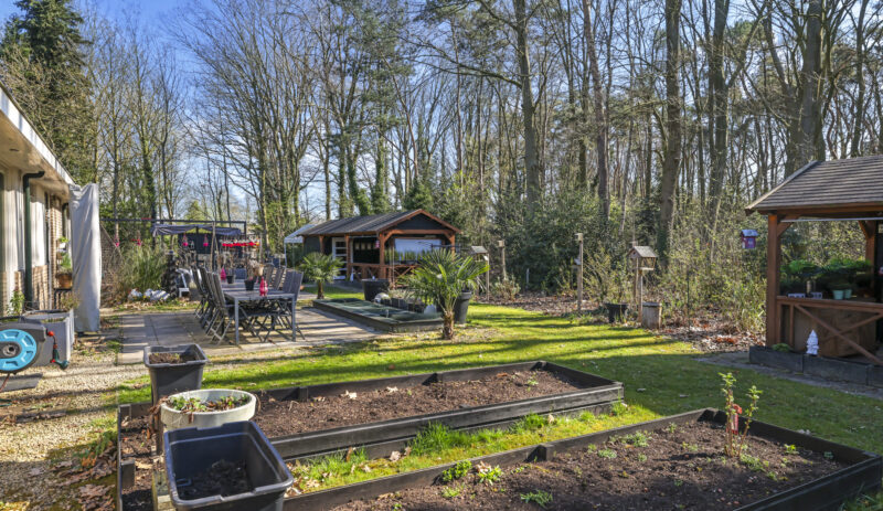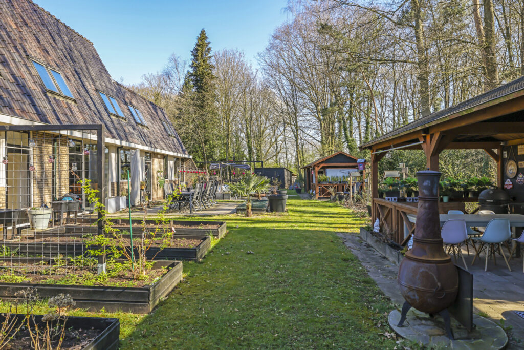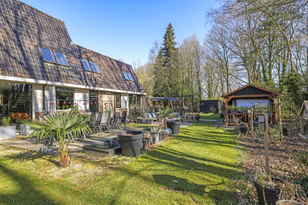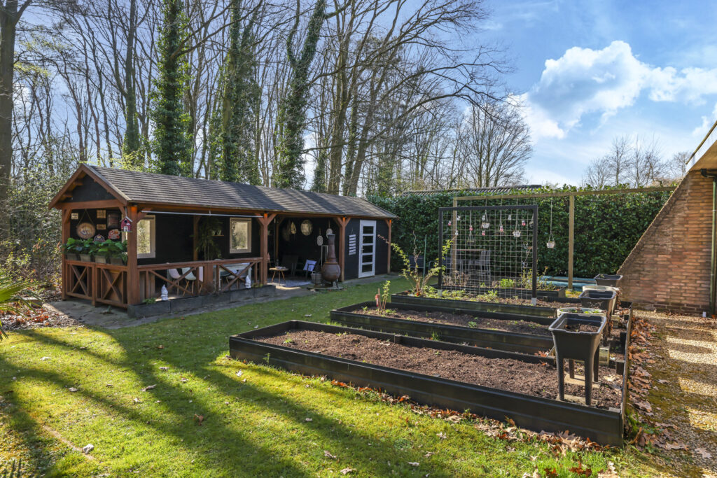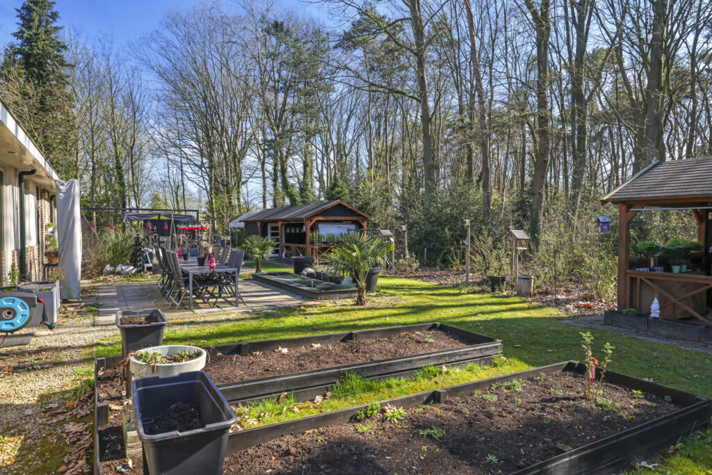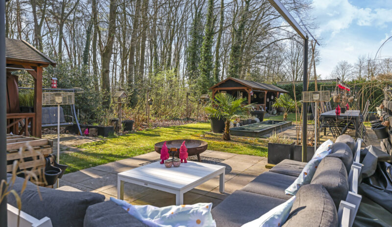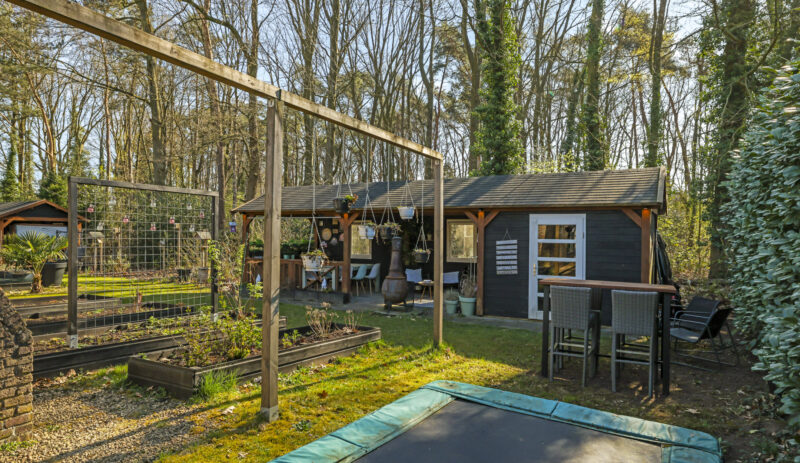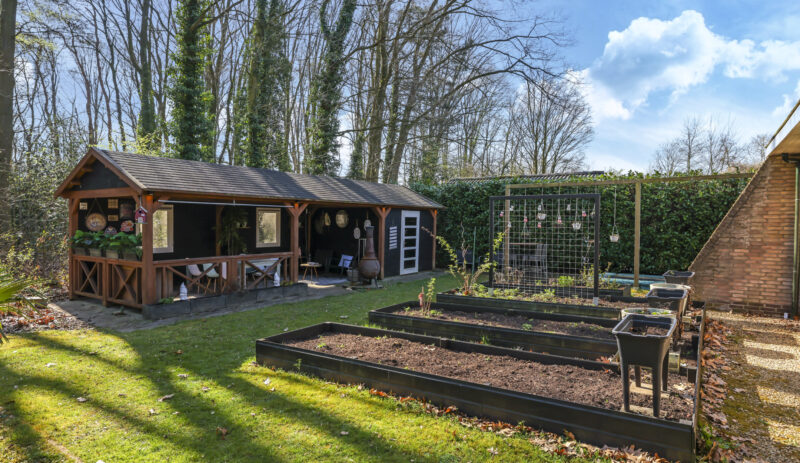 De buitenruimte is veelzijdig ingericht met meerdere terrassen, een speel-/sportveld en moestuinbakken. In 2020 zijn er twee vrijstaande bijgebouwen geplaatst, elk bestaande uit een schuur met aansluitende overkapping. Eén van deze bijgebouwen is ingericht als wellnessruimte (met saunacabine en jacuzzi) – een heerlijke plek om tot rust te komen in eigen tuin.