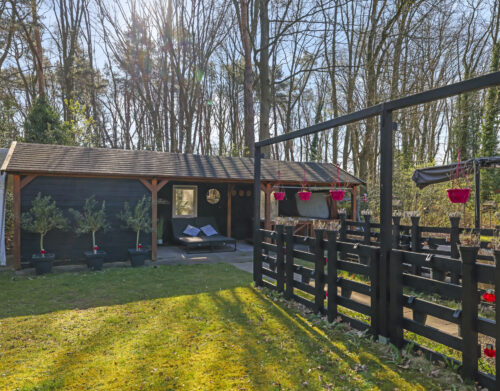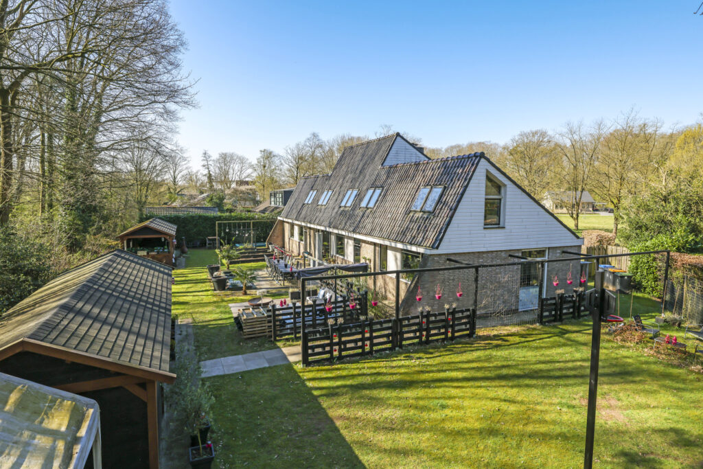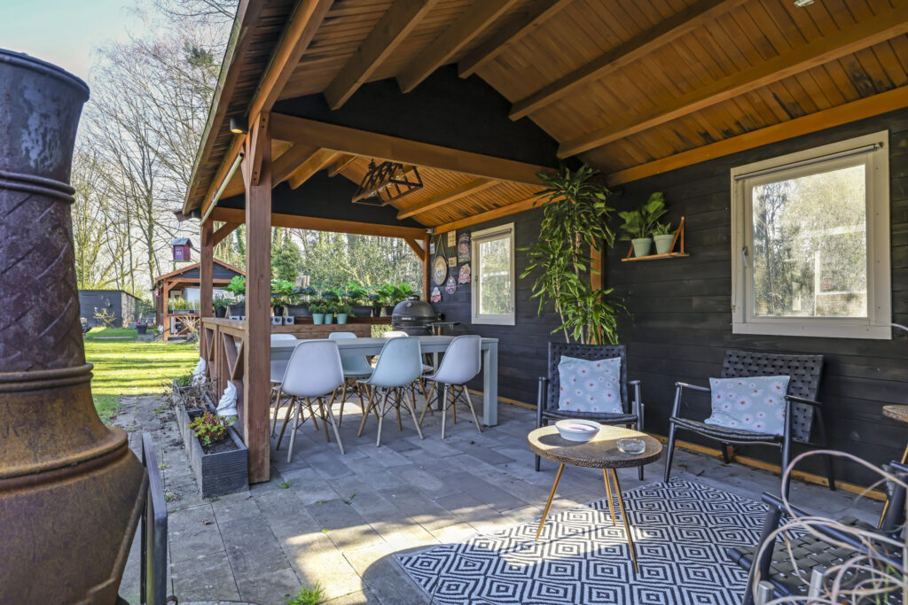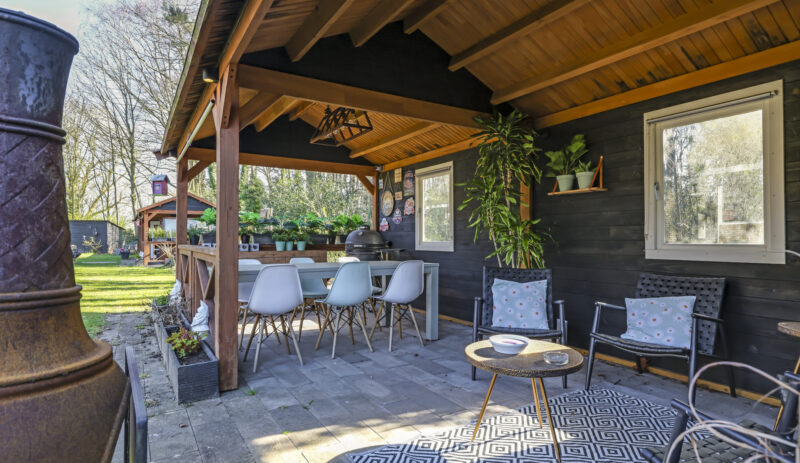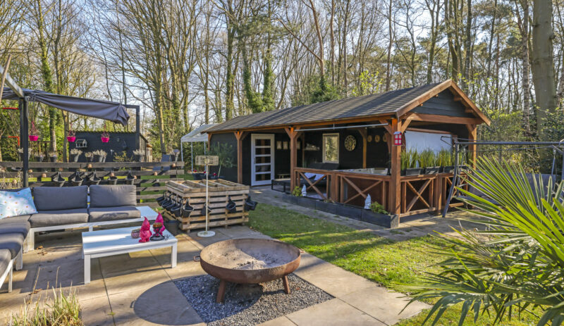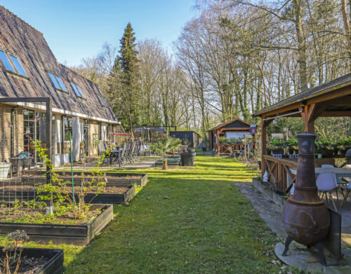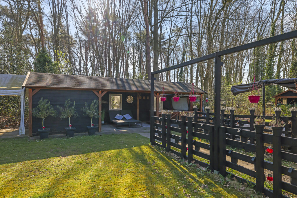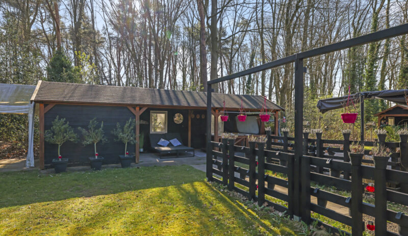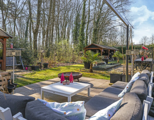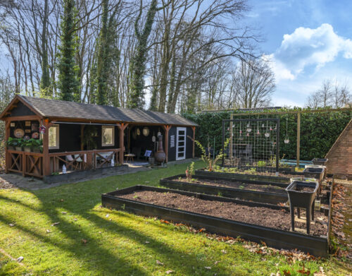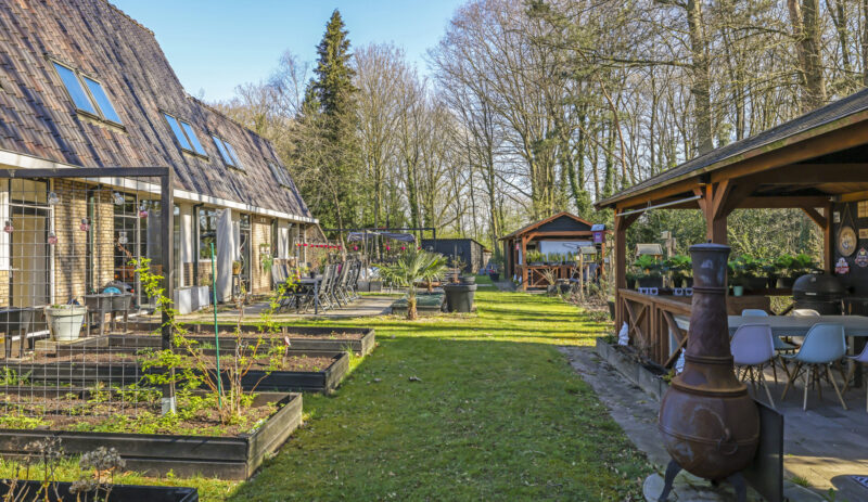 De buitenruimte is veelzijdig ingericht met meerdere terrassen, een speel-/sportveld en moestuinbakken. In 2020 zijn er twee vrijstaande bijgebouwen geplaatst, elk bestaande uit een schuur met aansluitende overkapping. Eén van deze bijgebouwen is ingericht als wellnessruimte (met saunacabine en jacuzzi) – een heerlijke plek om tot rust te komen in eigen tuin.