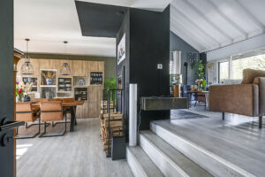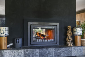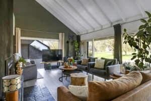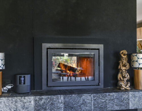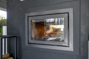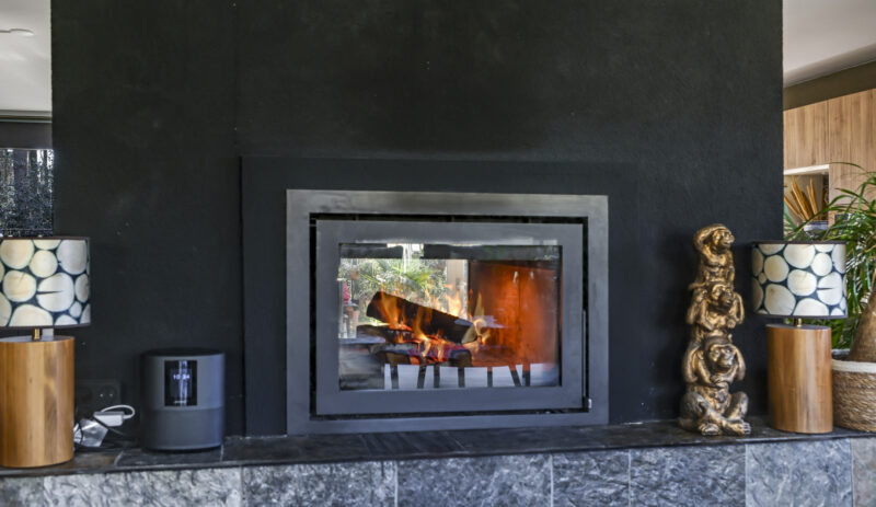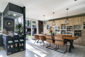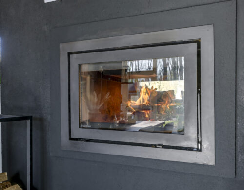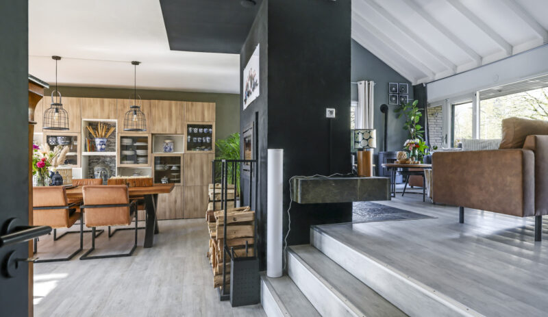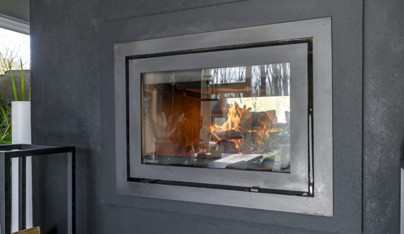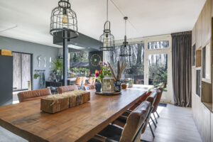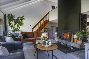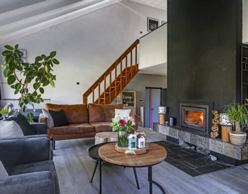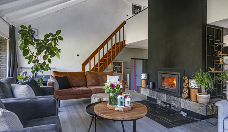 Centraal in de leefruimte bevindt zich een sfeervolle haardpartij die aan twee zijden te stoken is en de eet- en zitkamer op warme wijze verbindt.