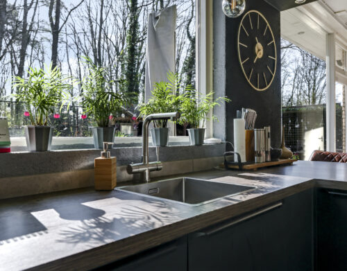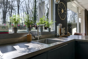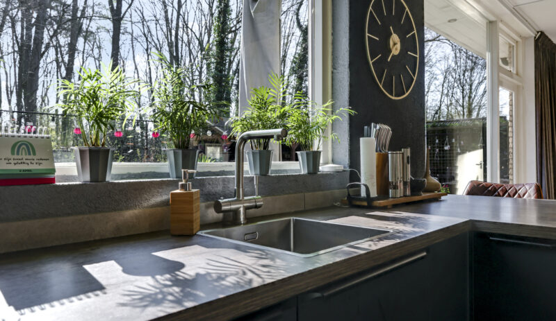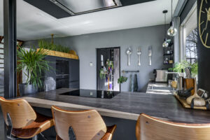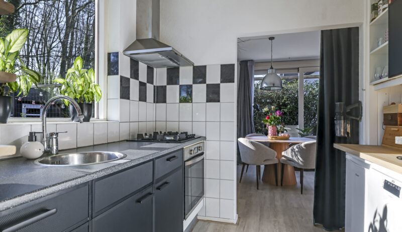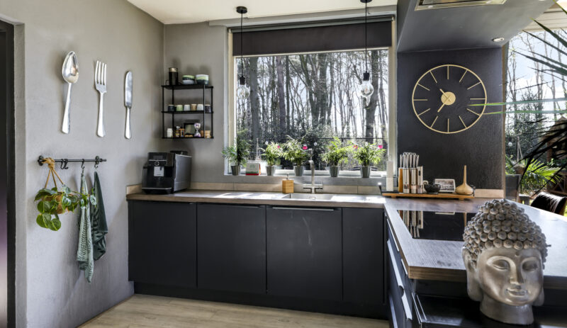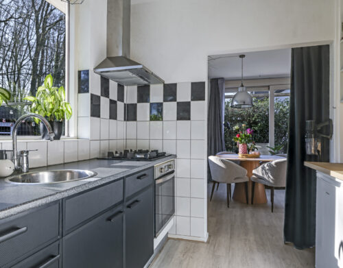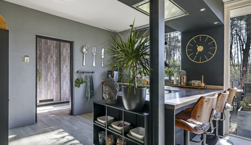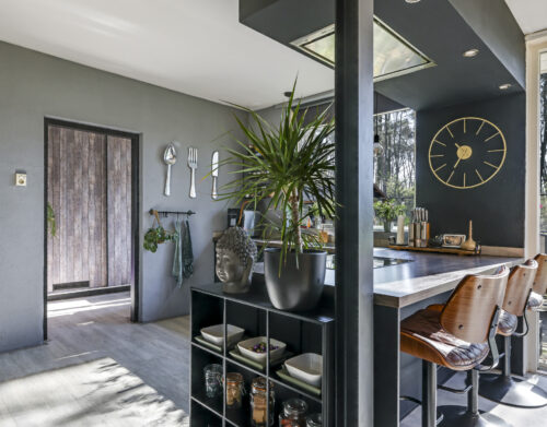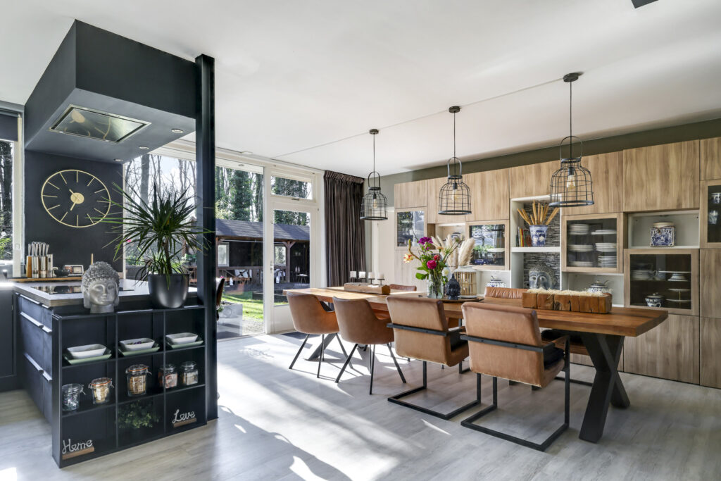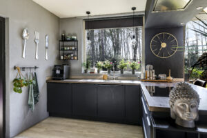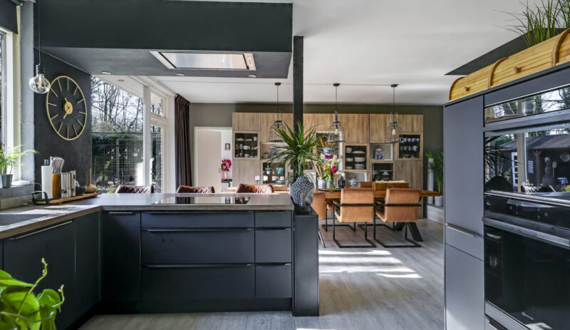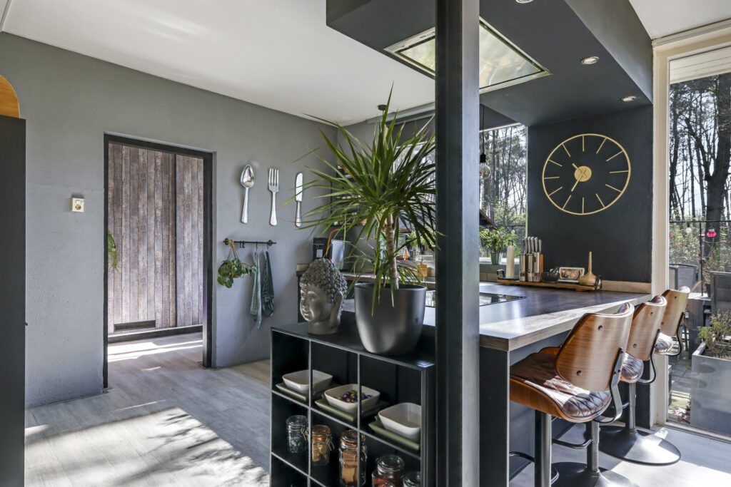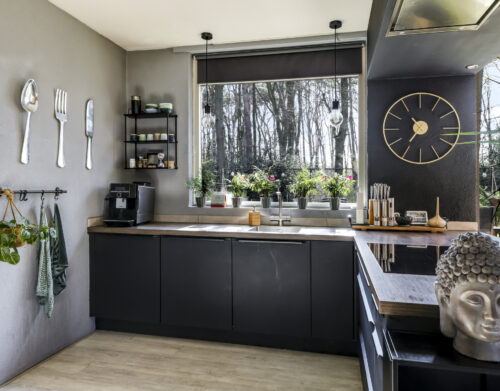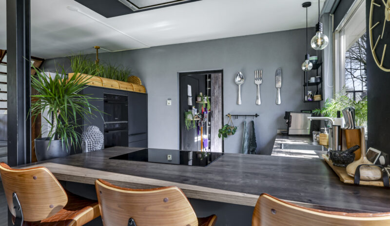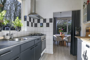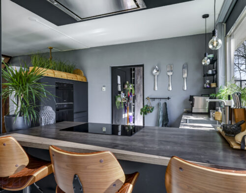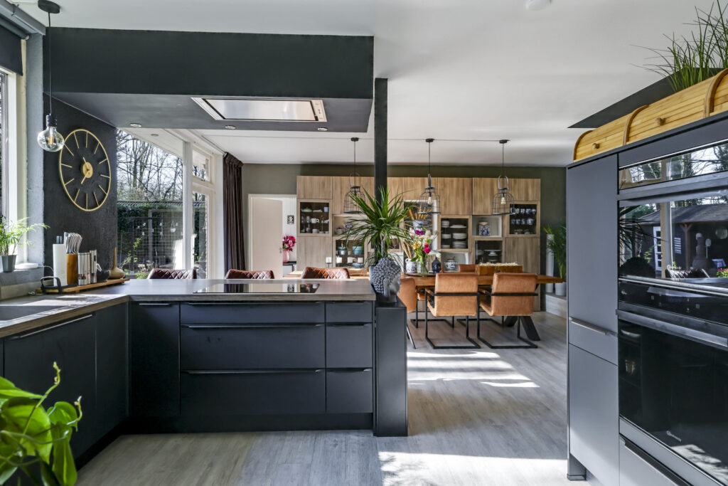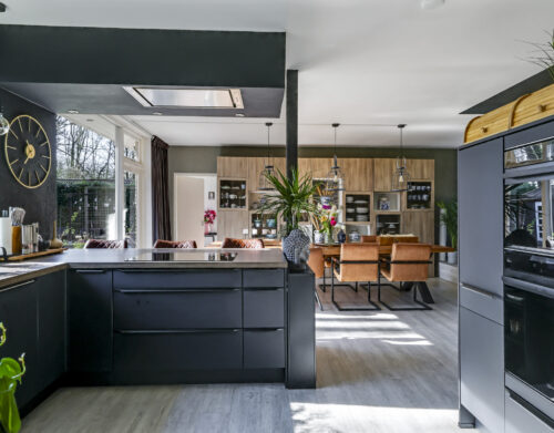 De moderne open keuken (2020) is geplaatst in een hoekopstelling met barretje en is uitgerust met o.a. een inductiekookplaat, afzuiging, vaatwasser en kokend water kraan alsmede een apparatenwand met oven, magnetron, koelkast en een praktische apothekerskast.