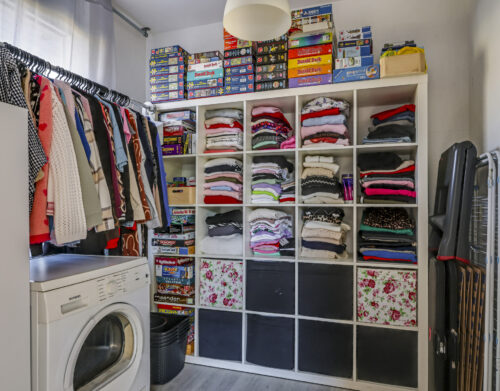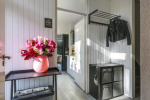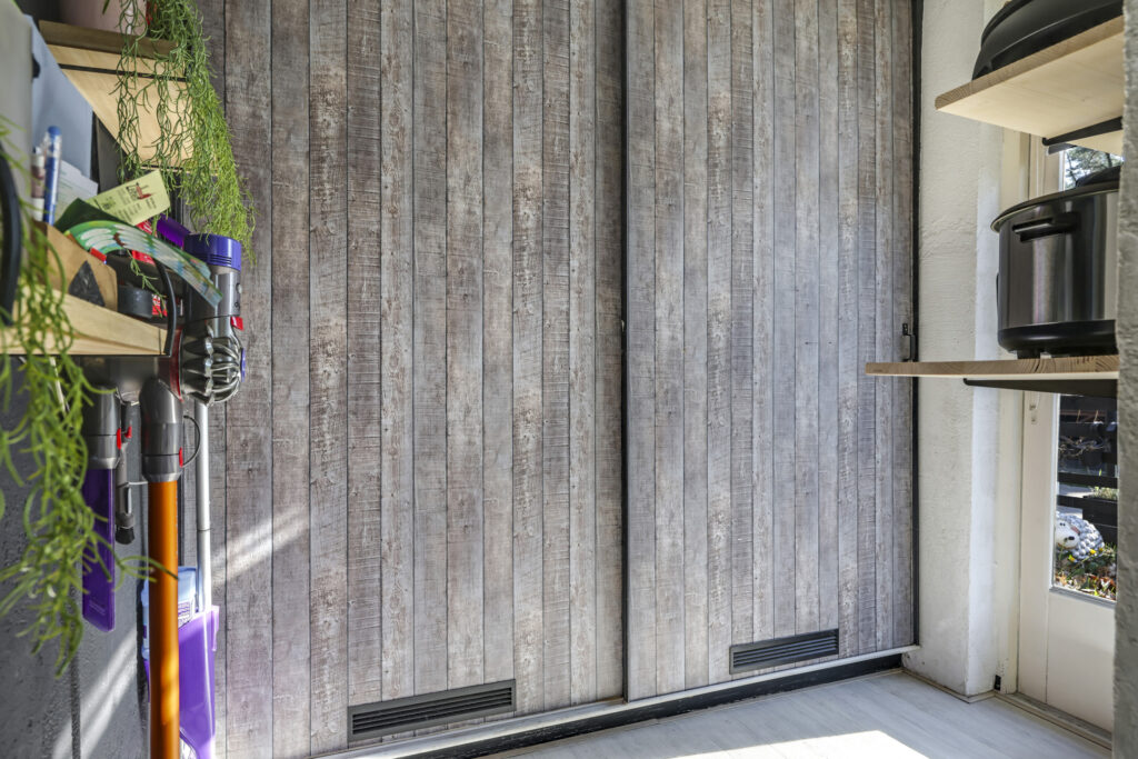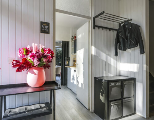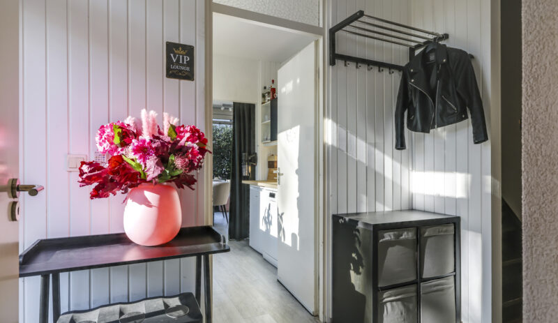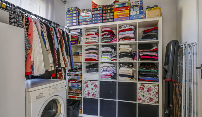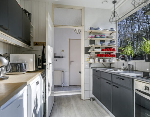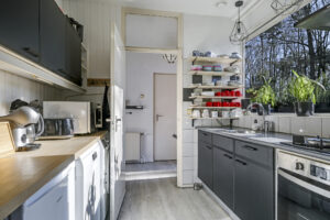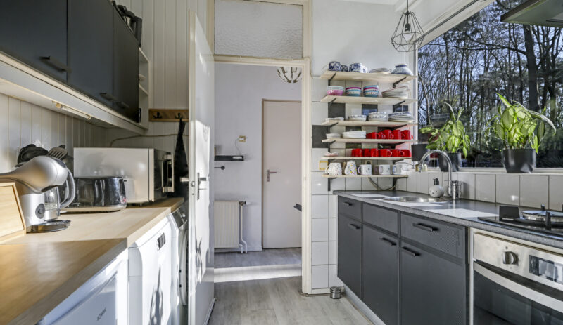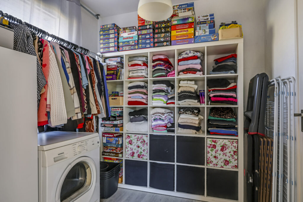 Aansluitend aan de keuken ligt de bijkeuken met wasmachineaansluiting (verwerkt in een vaste kastenwand) en een achterentree.