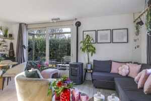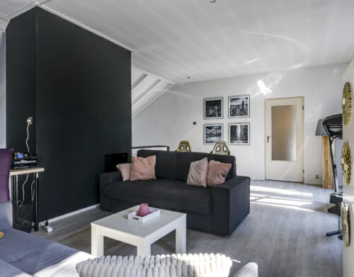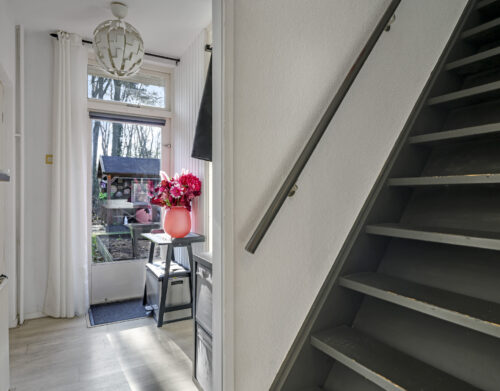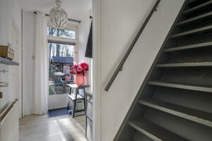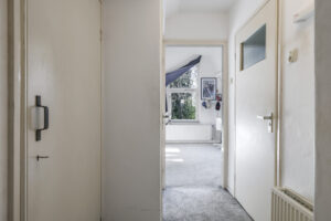 Bij binnenkomst valt meteen de ruimtelijkheid op. De entree biedt toegang tot de garderobe en een nette toiletruimte. De royale living is verdeeld over twee niveaus, met aan de tuinzijde een eetkamer en aan de voorzijde een lichte zitkamer met pelletkachel, hoge plafonds en prachtig uitzicht over het plantsoen.
