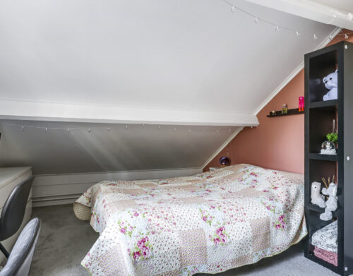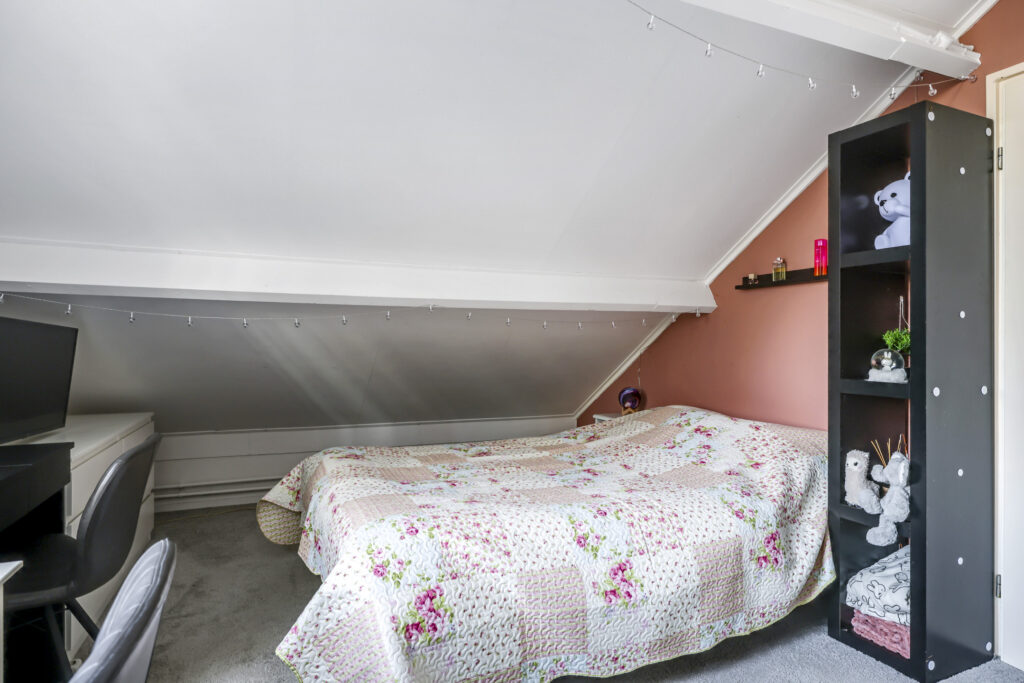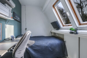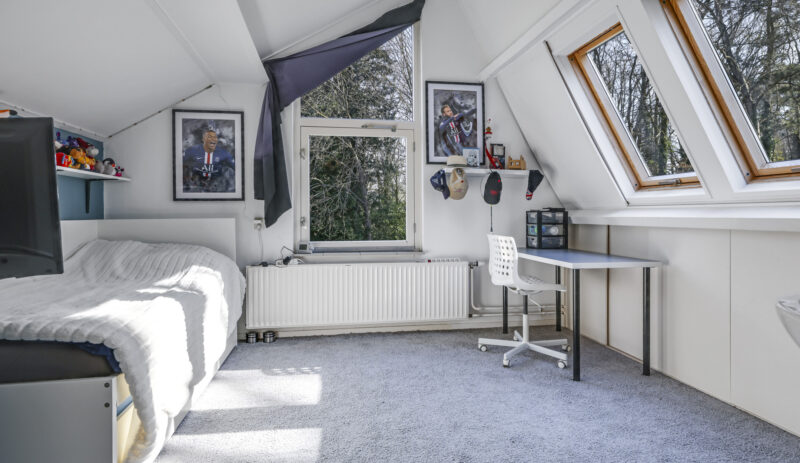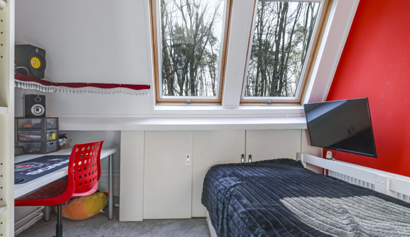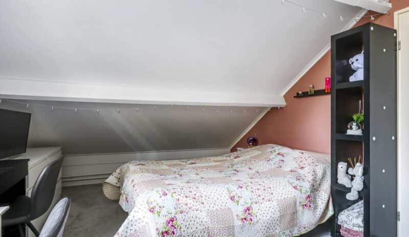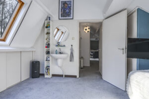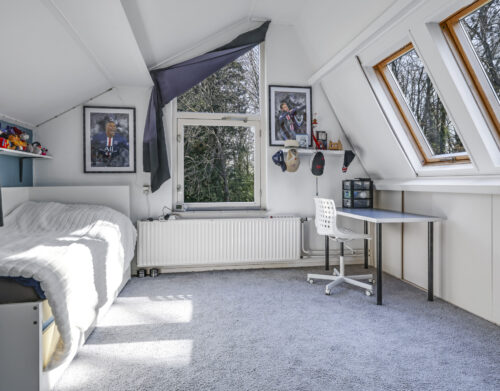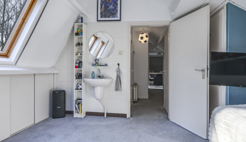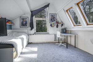 Vanuit de zitkamer leidt een trap naar een verrassende entresol (ca. 38 m²) met open haard en veel lichtinval dankzij dubbele dakramen – perfect als werkkamer, speelruimte of extra slaapkamer(s). Verder bevinden zich hier nog twee slaapkamers, een badkamer met douche en wastafel, een separate toiletruimte en een bergzolder.