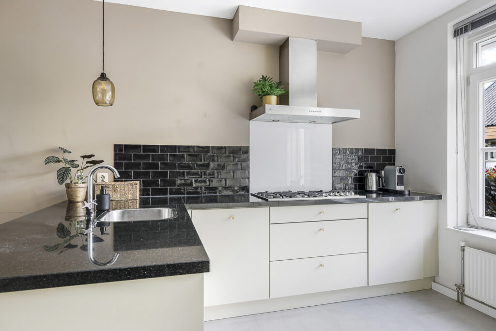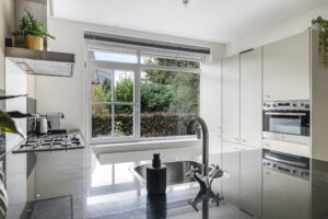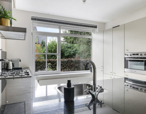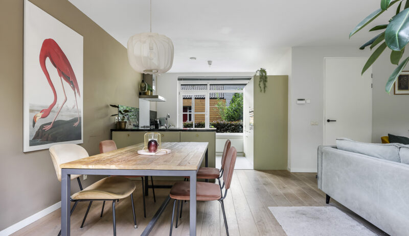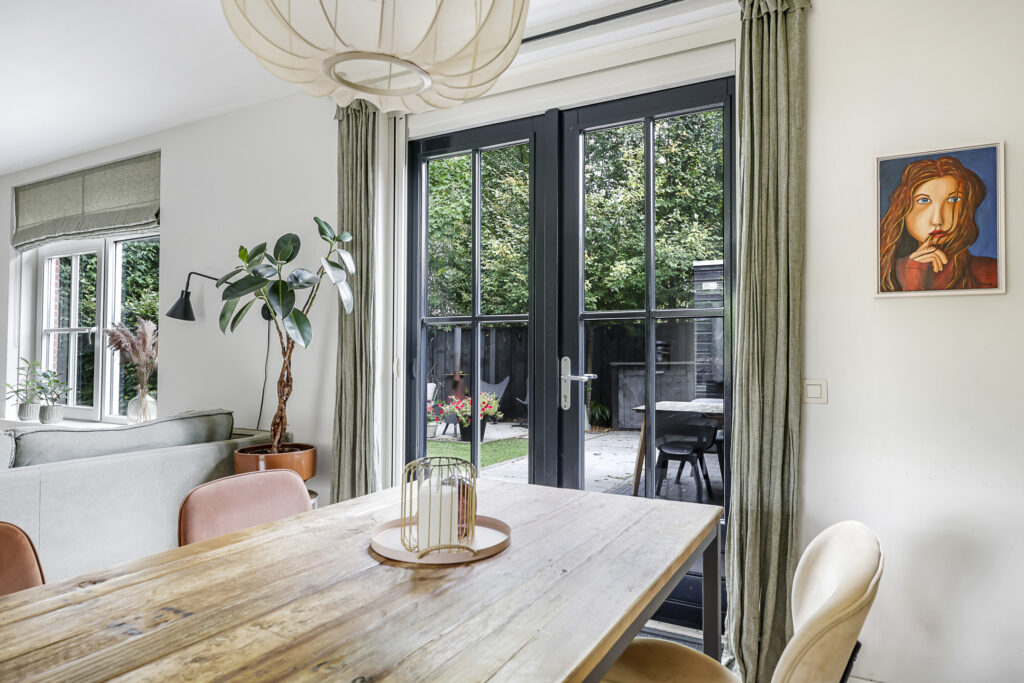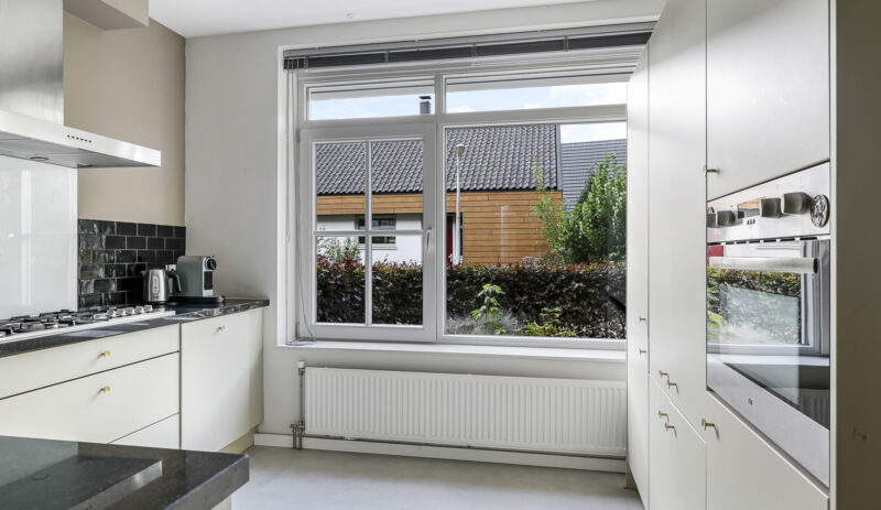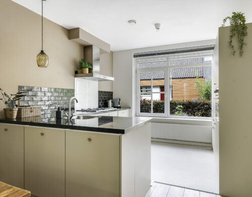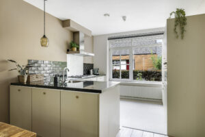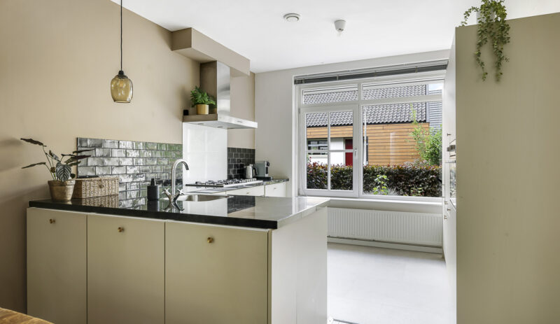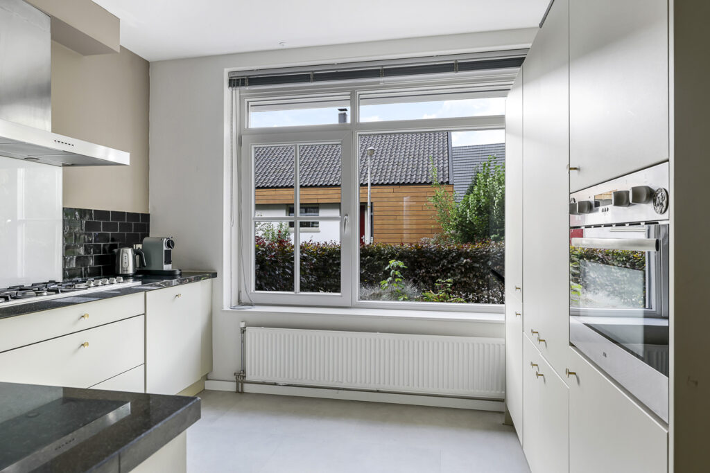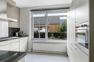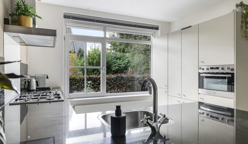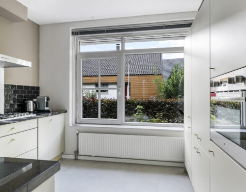 De tuingerichte woonkamer is een fijne plek om te ontspannen, met openslaande tuindeuren naar de achtertuin voorzien van een handige plissé hordeur. De provisiekast biedt plaats aan het opbergen van proviand of bijvoorbeeld de stofzuiger en de parketvloer geeft het geheel een sfeervolle uitstraling. Aan de voorzijde ligt de open keuken met granieten werkblad, volop kastruimte en alle inbouwapparatuur die je nodig hebt. Handig detail: de wasmachine en droger zijn netjes weggewerkt in de kasten.