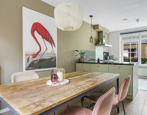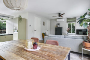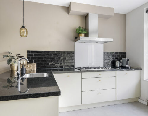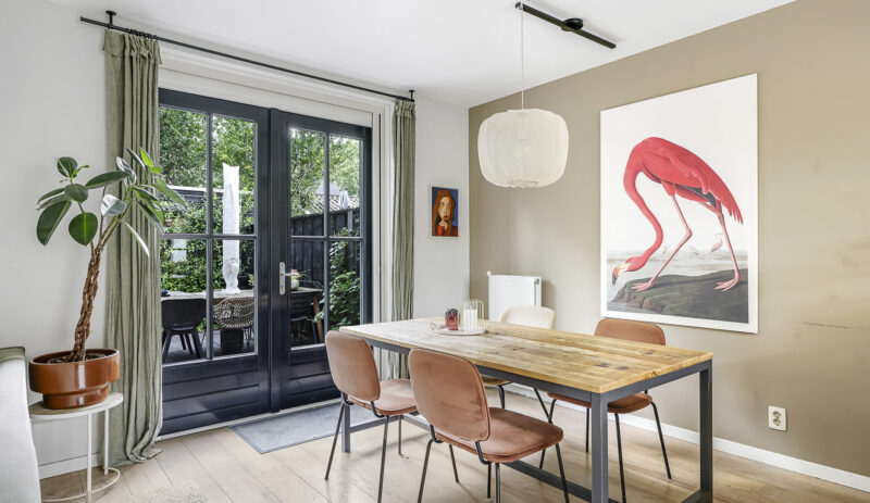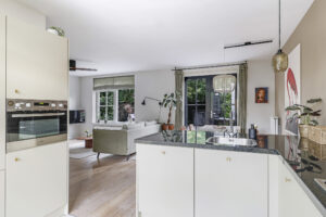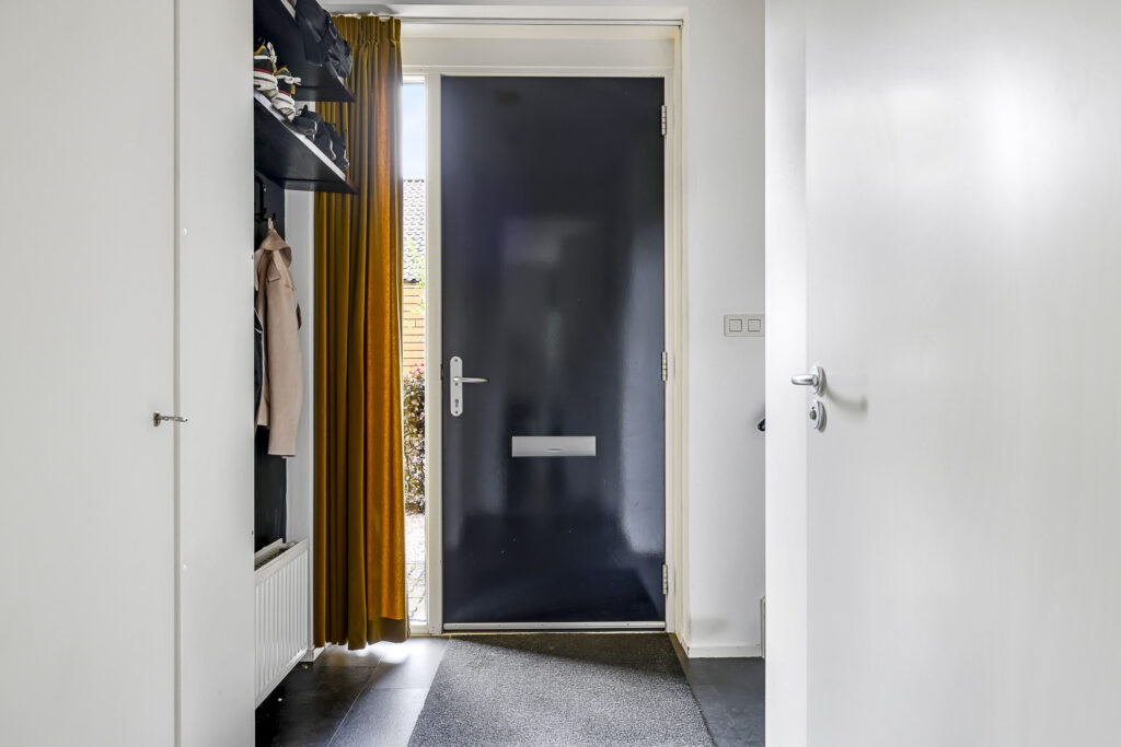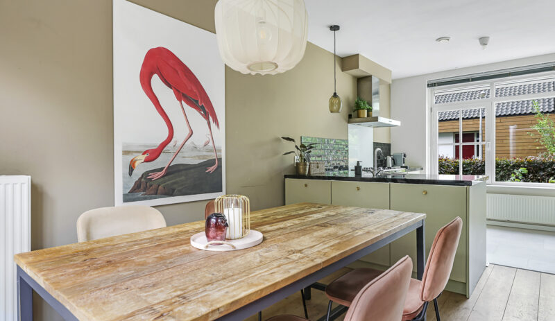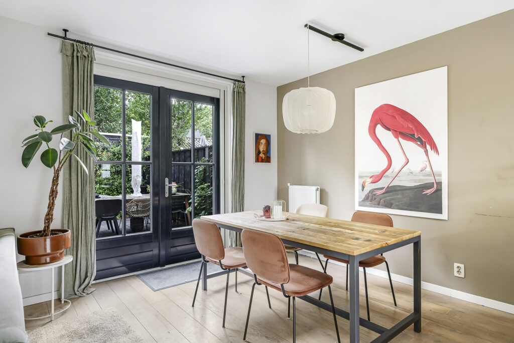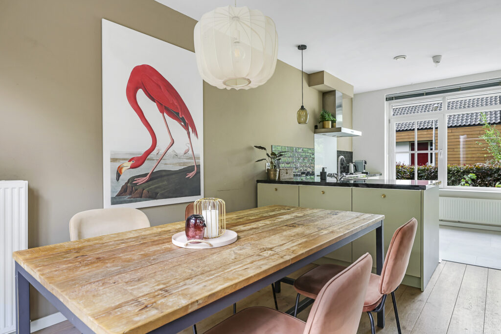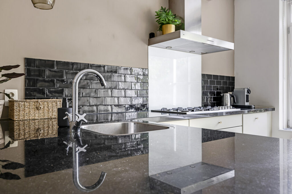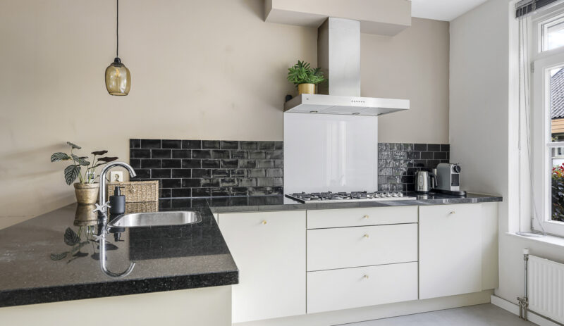De tuingerichte woonkamer is een fijne plek om te ontspannen, met openslaande tuindeuren naar de achtertuin voorzien van een handige plissé hordeur. De provisiekast biedt plaats aan het opbergen van proviand of bijvoorbeeld de stofzuiger en de parketvloer geeft het geheel een sfeervolle uitstraling. Aan de voorzijde ligt de open keuken met granieten werkblad, volop kastruimte en alle inbouwapparatuur die je nodig hebt. Handig detail: de wasmachine en droger zijn netjes weggewerkt in de kasten.