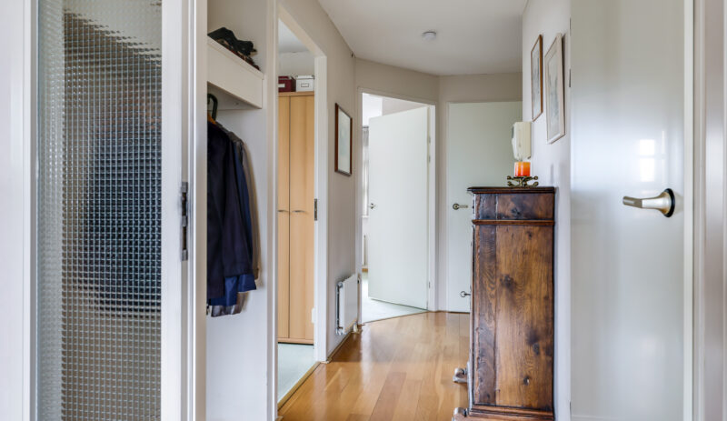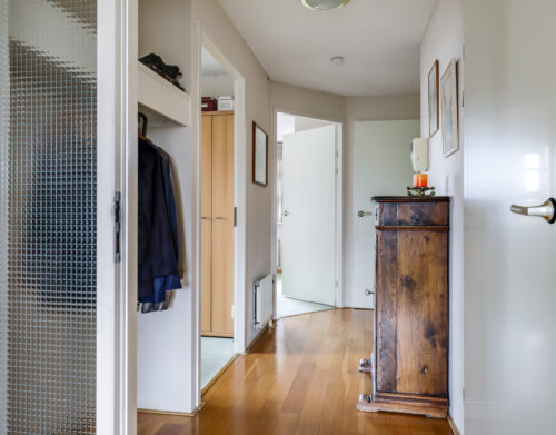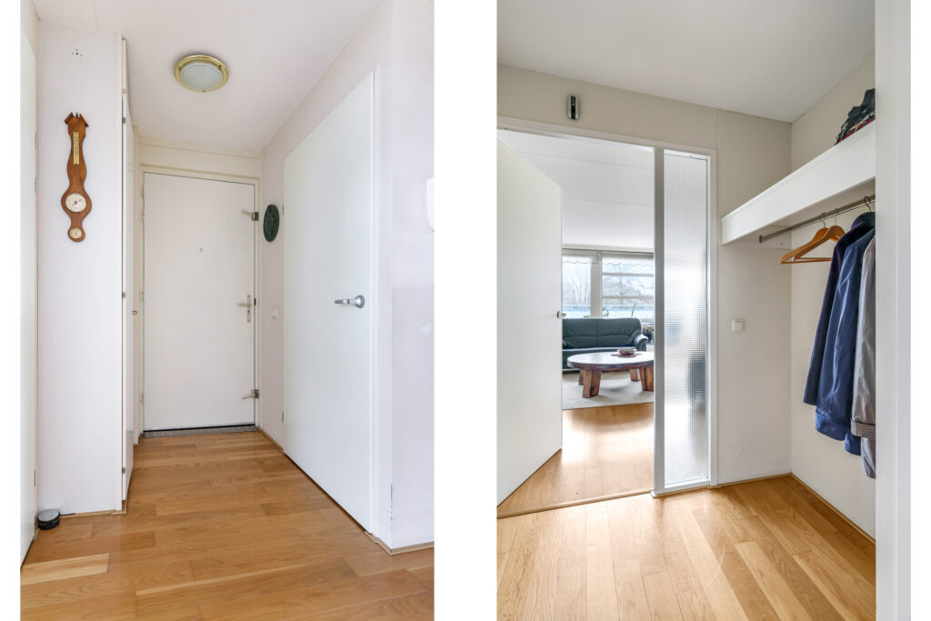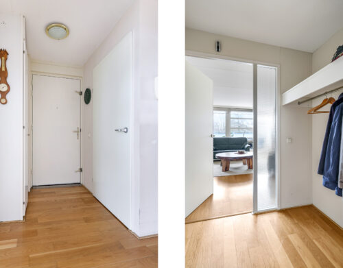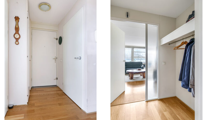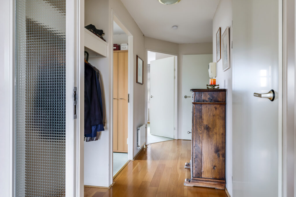 Eenmaal binnen in het penthouse word je verwelkomd in een ruime hal met garderobenis, toiletruimte (hangcloset met fontein), meterkast en toegang tot alle vertrekken.