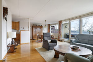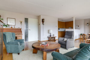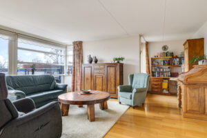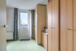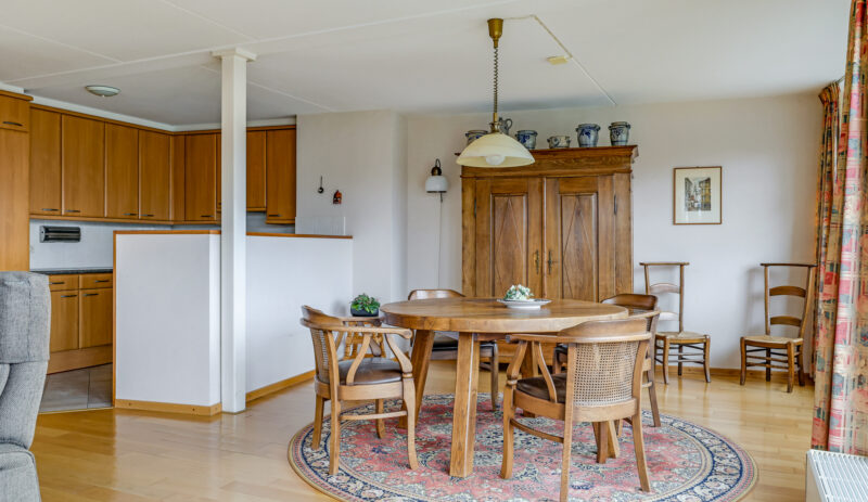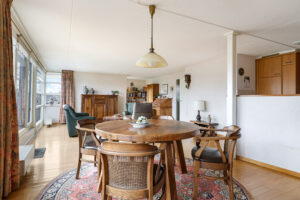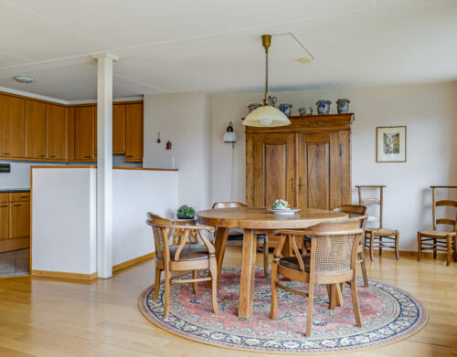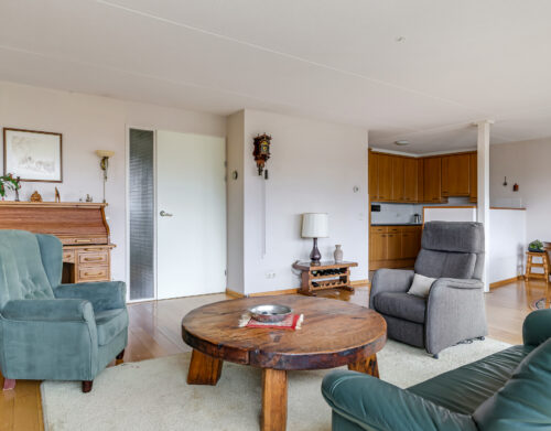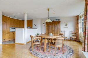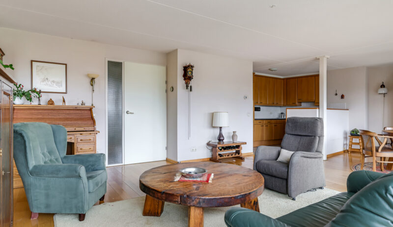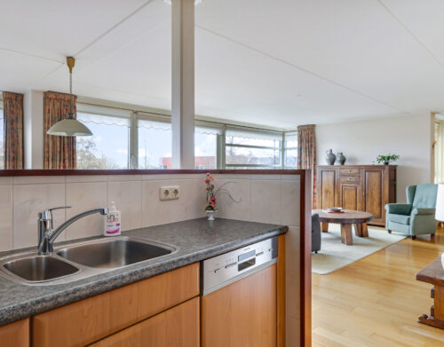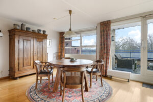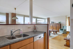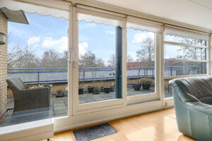 De woonkamer is royaal van opzet en voorzien van een parketvloer. Dankzij de grote glazen pui met schuifpui sta je in directe verbinding met het oostgerichte dakterras aan de achterzijde. Hier geniet je van een vrij uitzicht over de omgeving en een heerlijke ochtendzon. De elektrisch bedienbare screens zorgen indien gewenst voor verkoeling en comfort.
