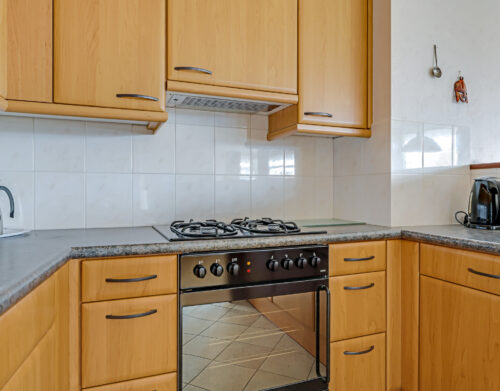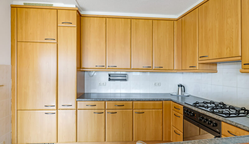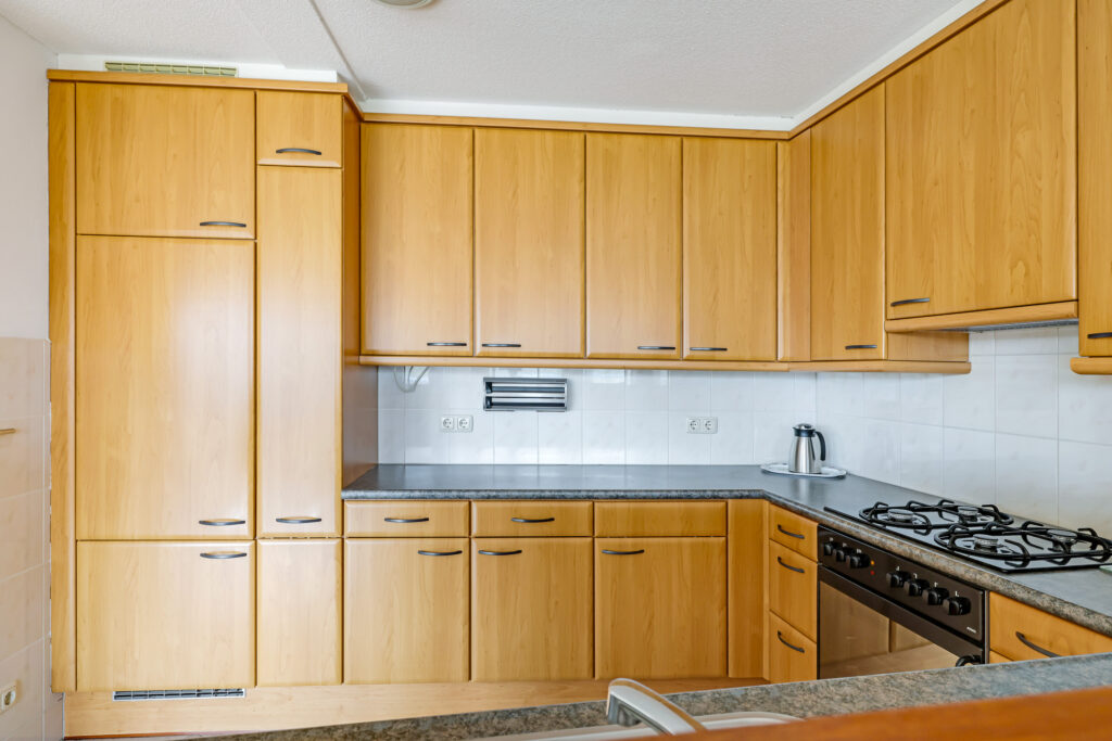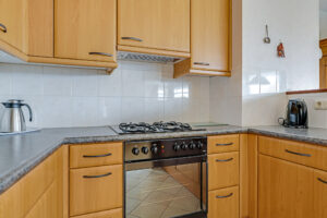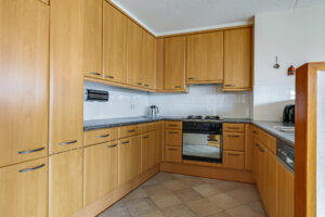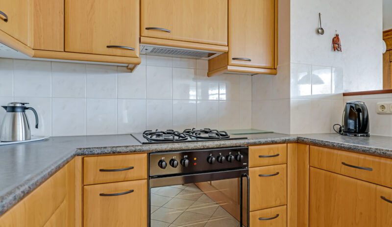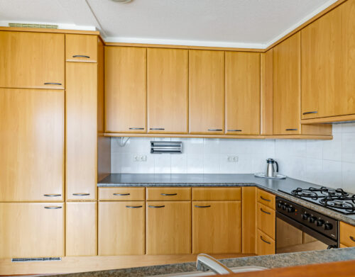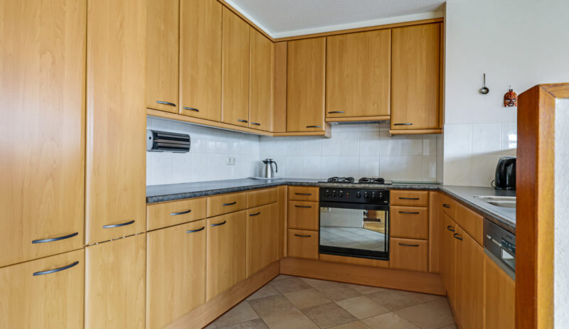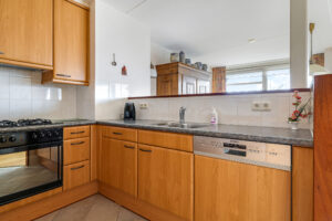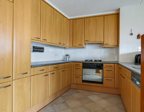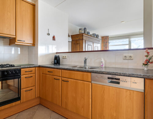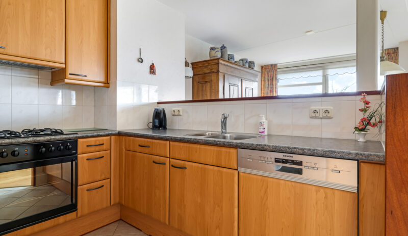 De halfopen keuken is uitgevoerd in een praktische U-opstelling en biedt veel werk- en bergruimte. Aanwezig zijn onder andere een koelkast, oven, gaskookplaat, afzuigkap en vaatwasser.