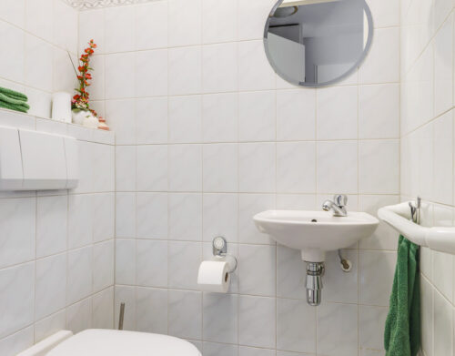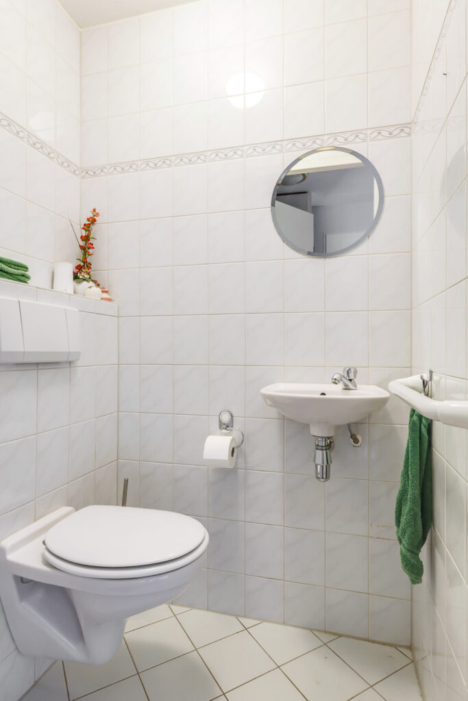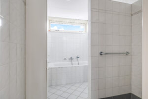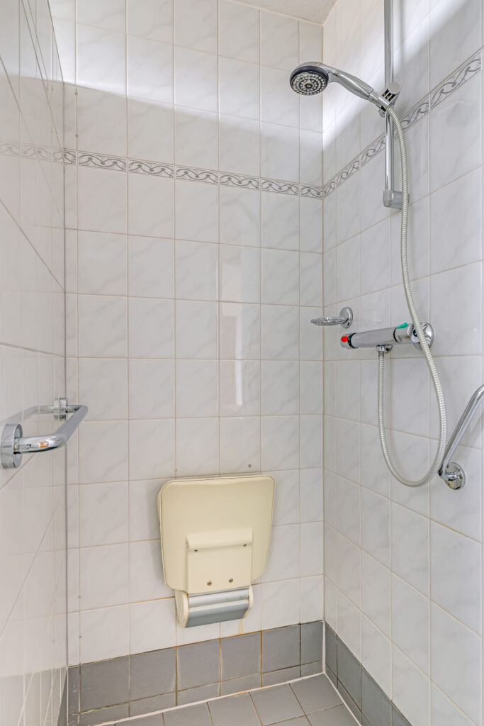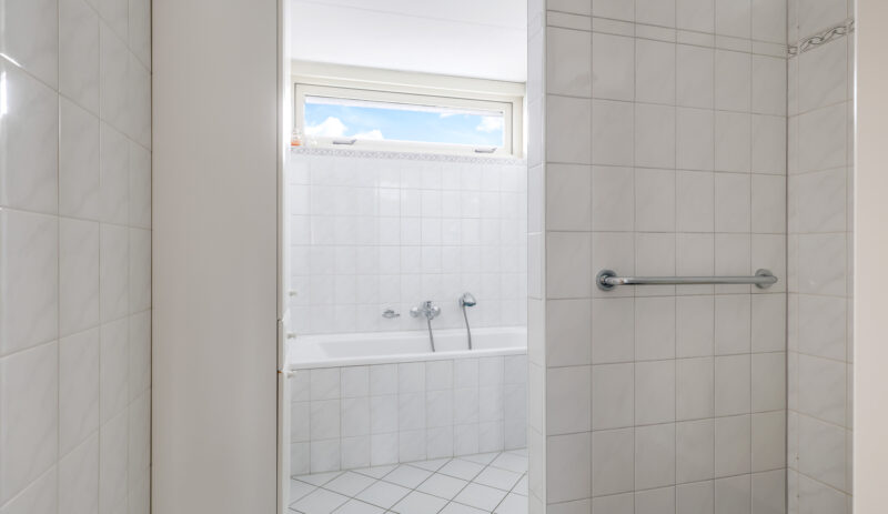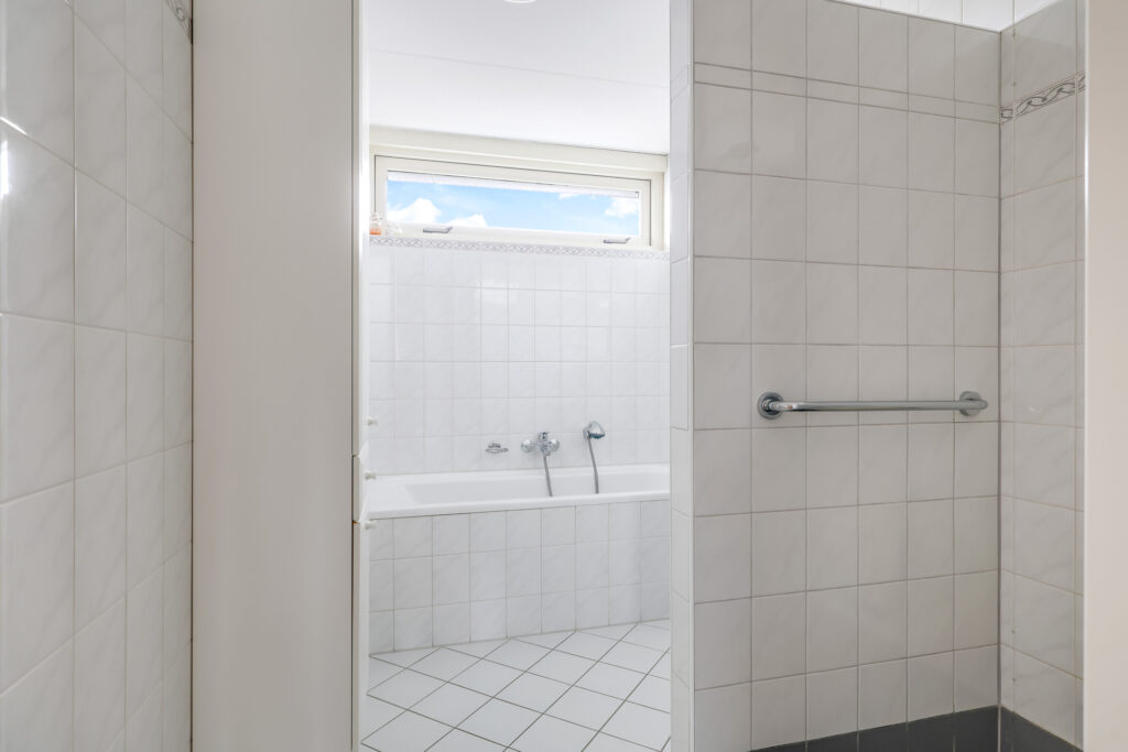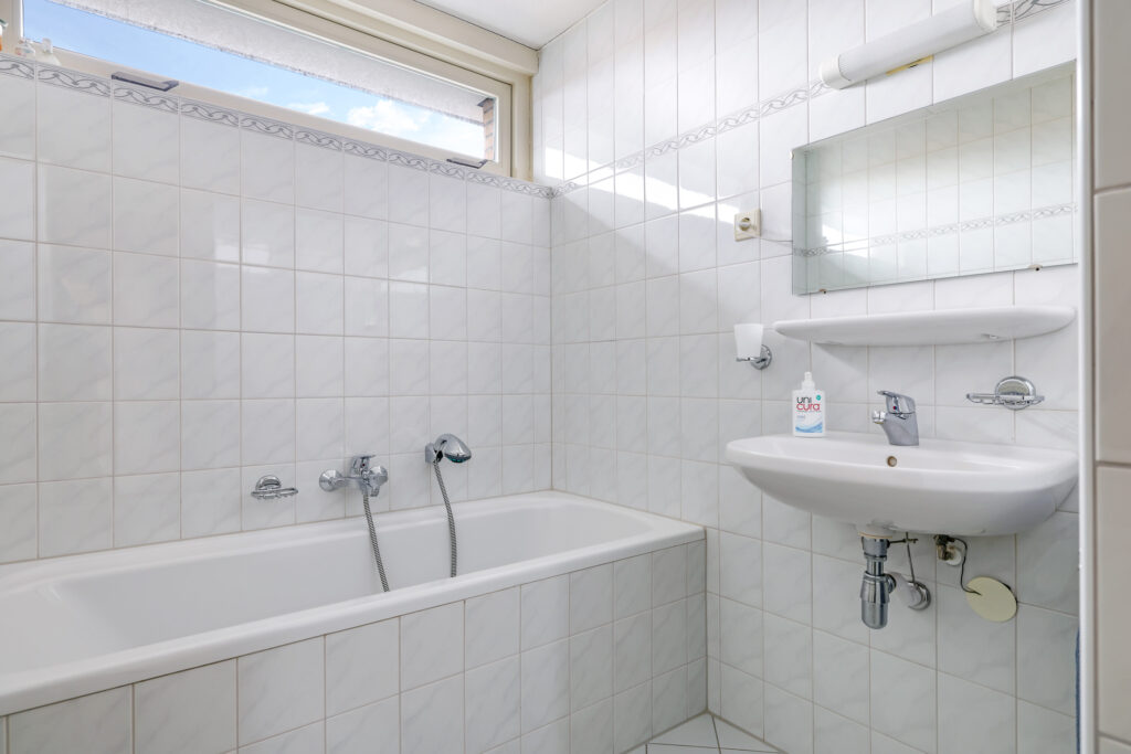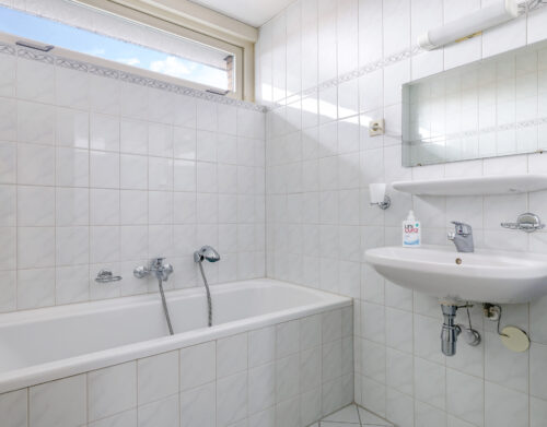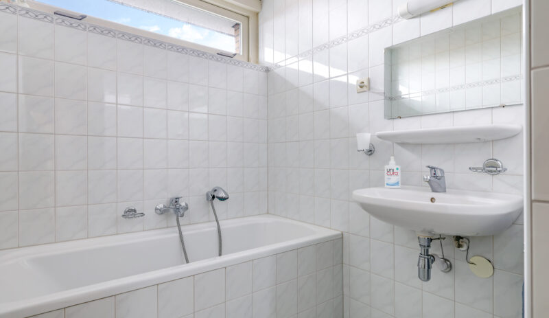 De badkamer is compleet ingericht met een ligbad, inloopdouche en wastafel. Daarnaast is er een praktische wasruimte met aansluitingen voor wasapparatuur, de CV-opstelling, mechanische ventilatie en extra provisieruimte.