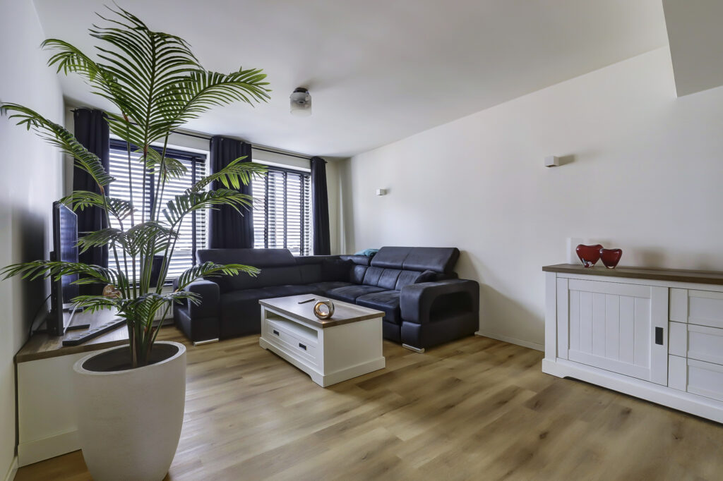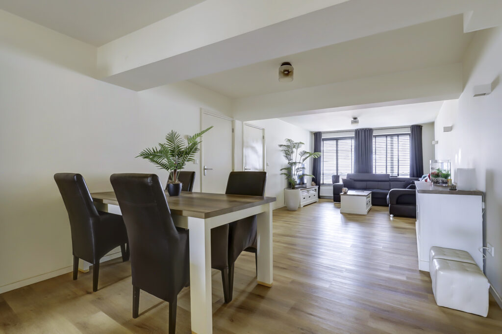 De ruime woonkamer vormt samen met de open keuken een sfeervolle leefruimte waar je heerlijk kunt ontspannen of gasten kunt ontvangen. De moderne keuken is uitgevoerd met een stijlvol kookeiland én een keukenblok voorzien van alle gemakken: een inductiekookplaat, afzuigkap, koel-/vriescombinatie, oven en een vaatwasser. Via de keuken stap je zo het riante dakterras op — een heerlijk privé buitenverblijf waar je in alle rust kunt genieten van de zon.