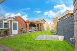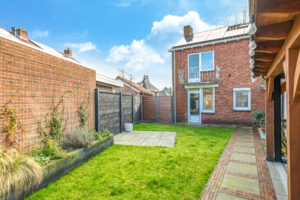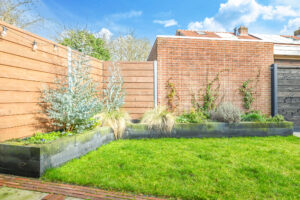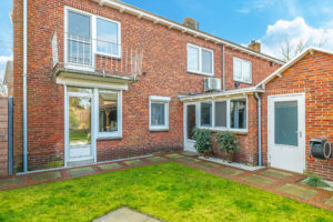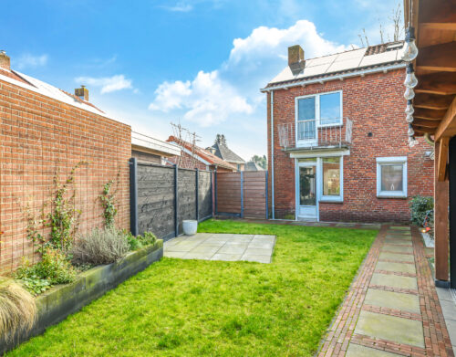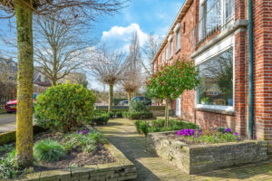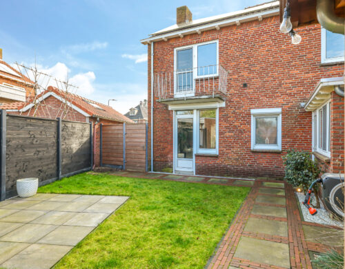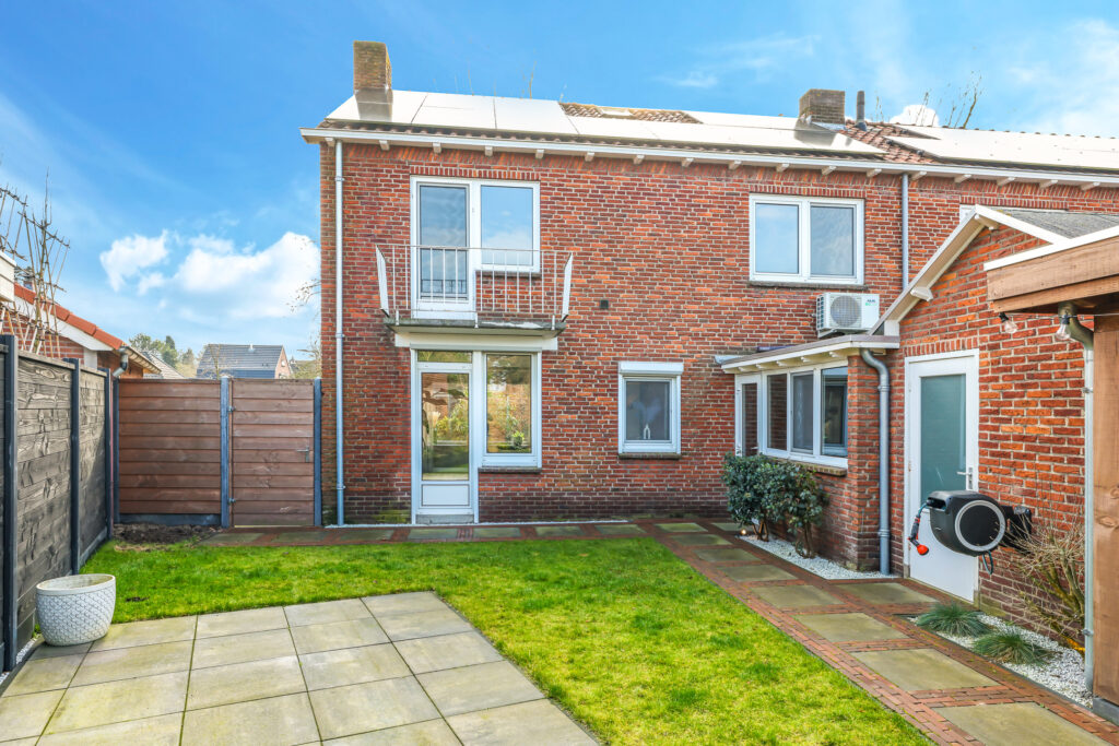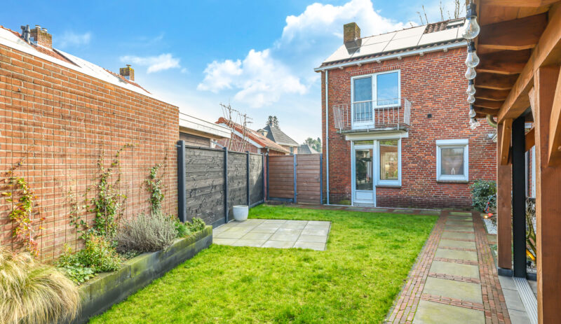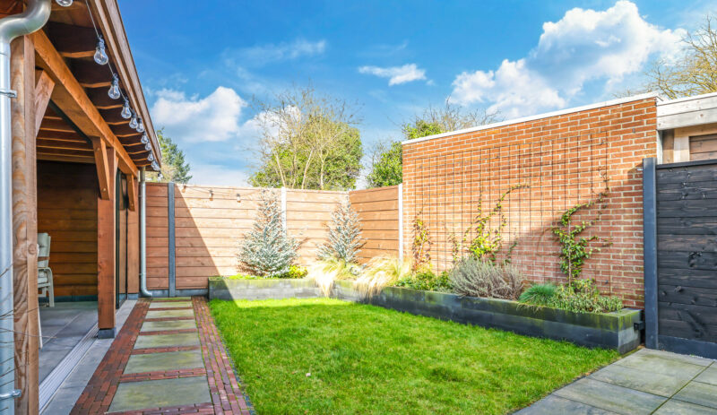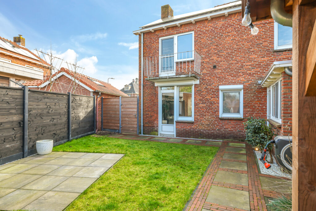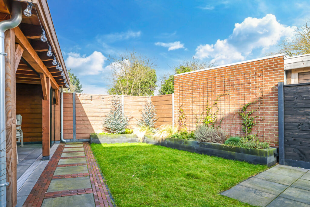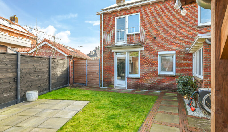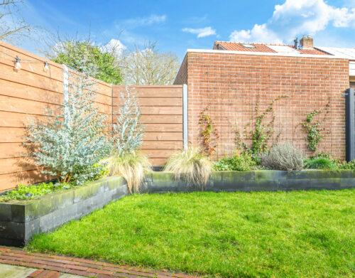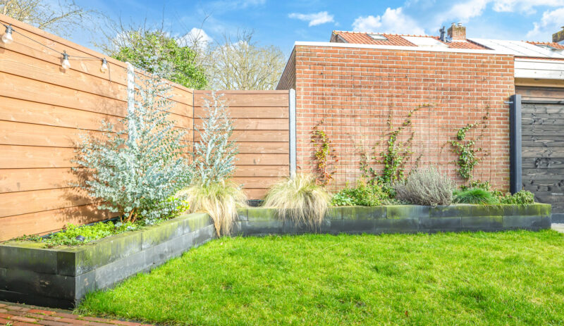 De achtertuin is verzorgd aangelegd en beschikt over een ruim terras, diverse beplanting en een praktische indeling.