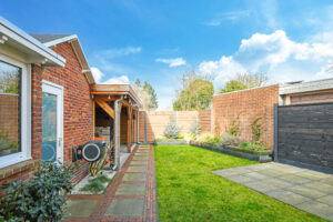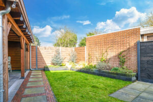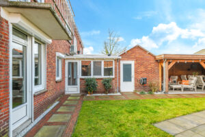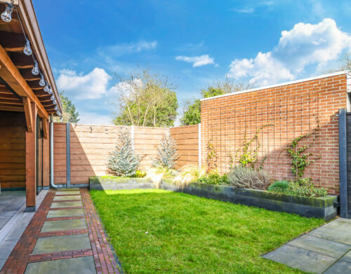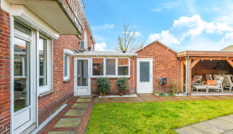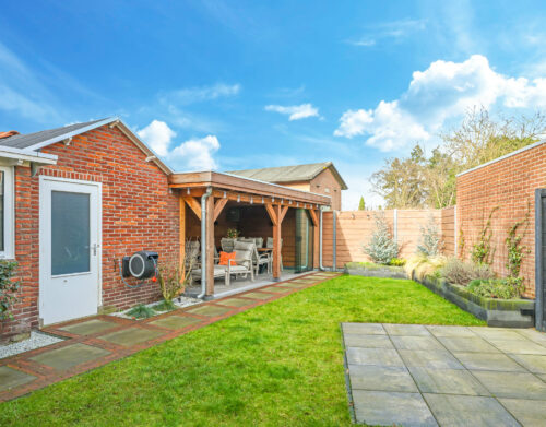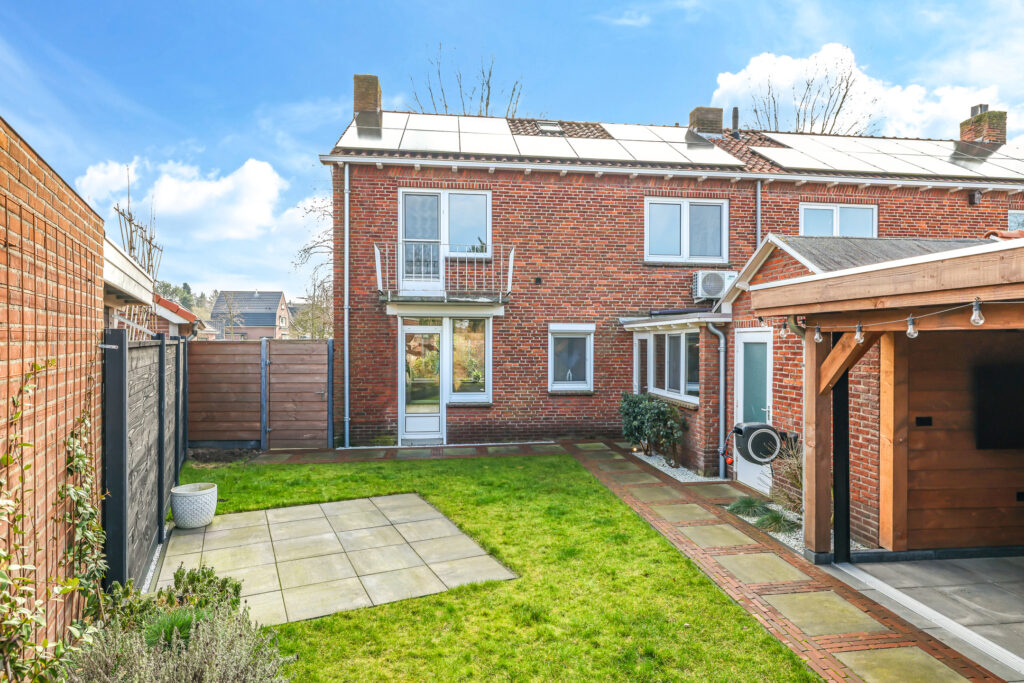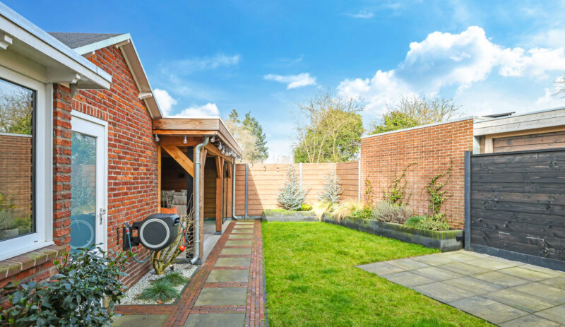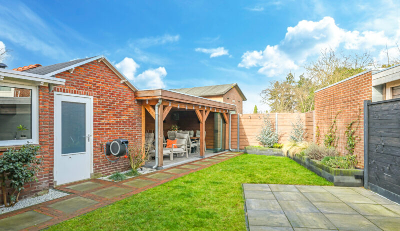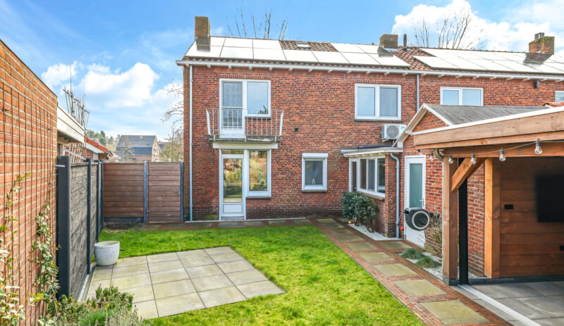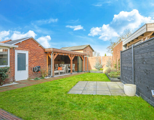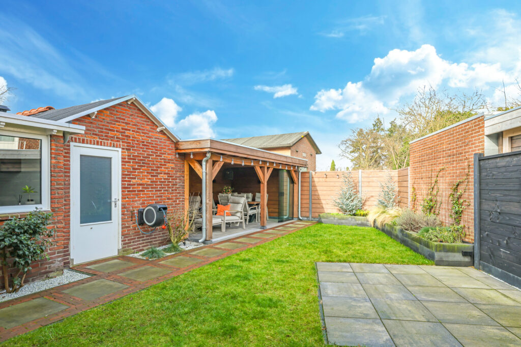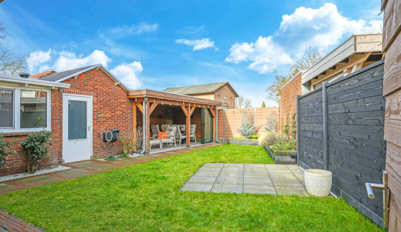 De achtertuin is verzorgd aangelegd en voorzien van een overkapping met glazen schuifwand, waardoor er het hele jaar door optimaal gebruik kan worden gemaakt van de buitenruimte.
