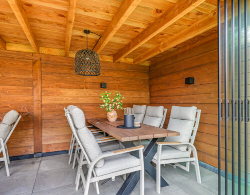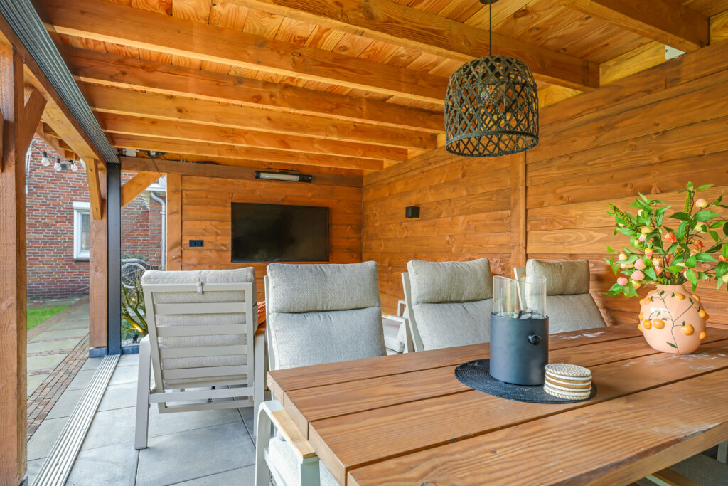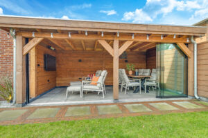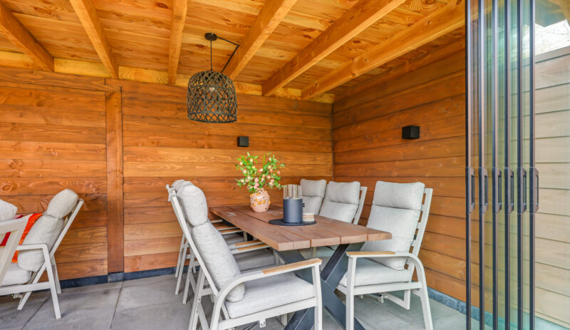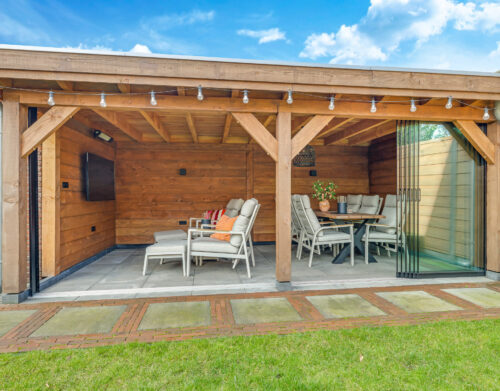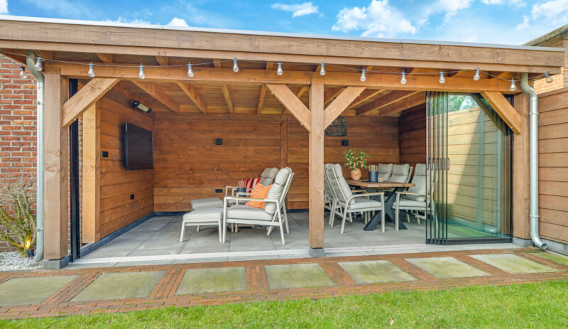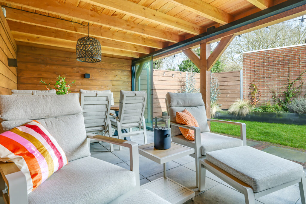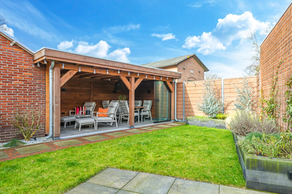 Een grote overkapping met glazen schuifwand maakt het mogelijk om gedurende het hele jaar comfortabel buiten te zitten. Daarnaast is er een aparte stenen berging aanwezig, geschikt voor fietsen en tuinopslag.