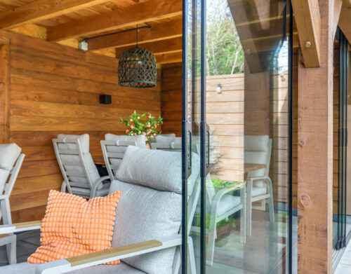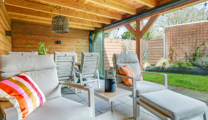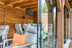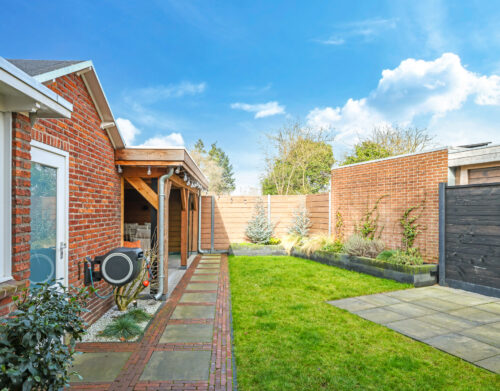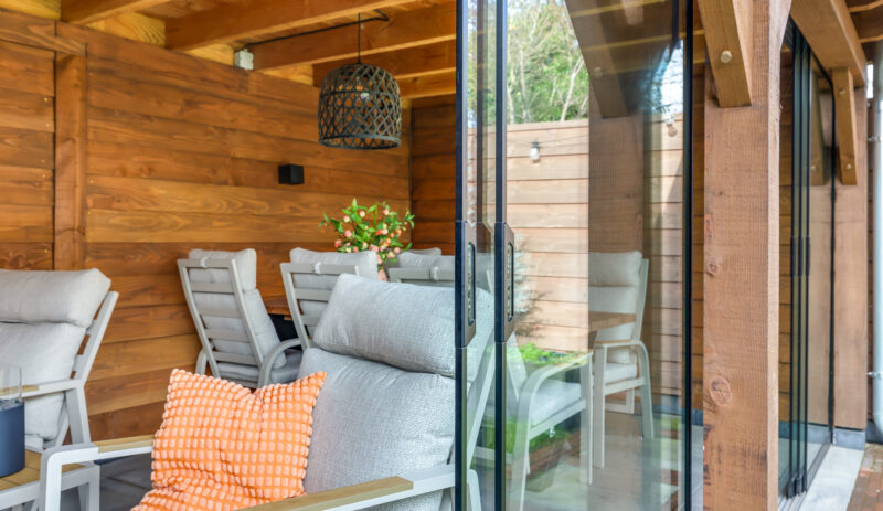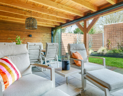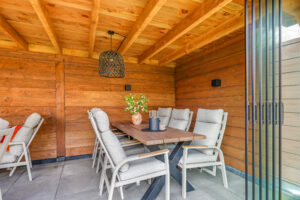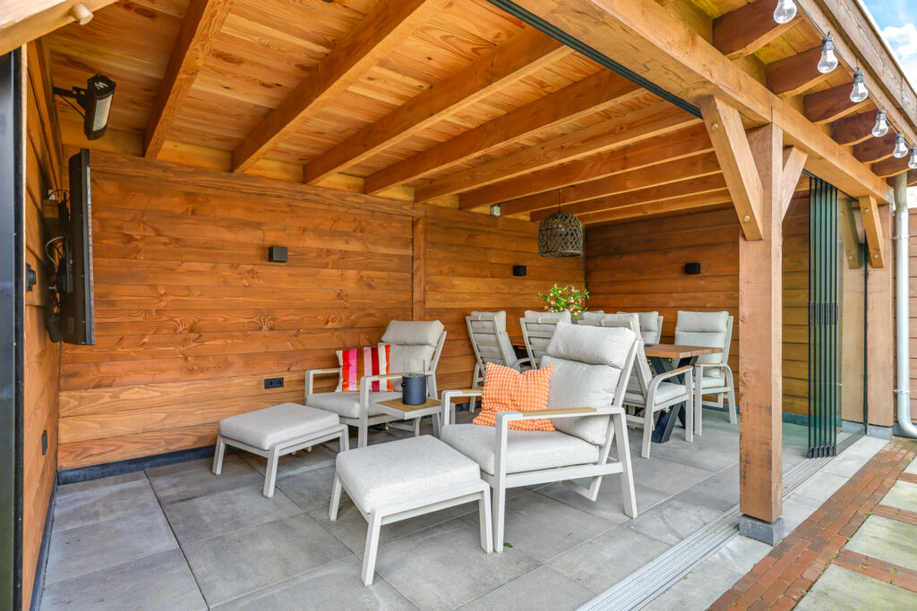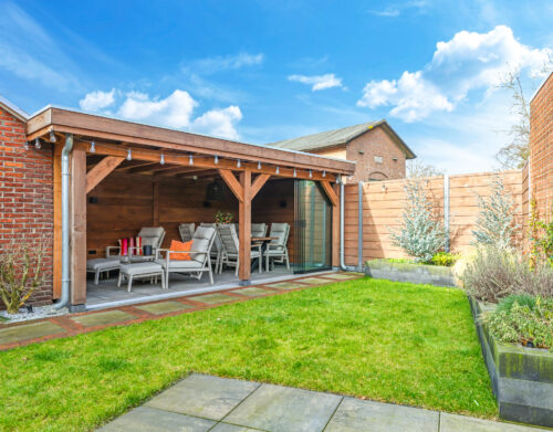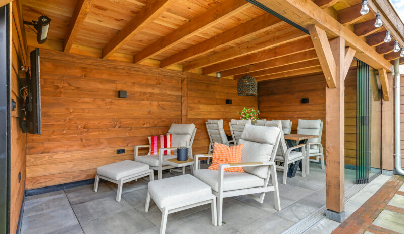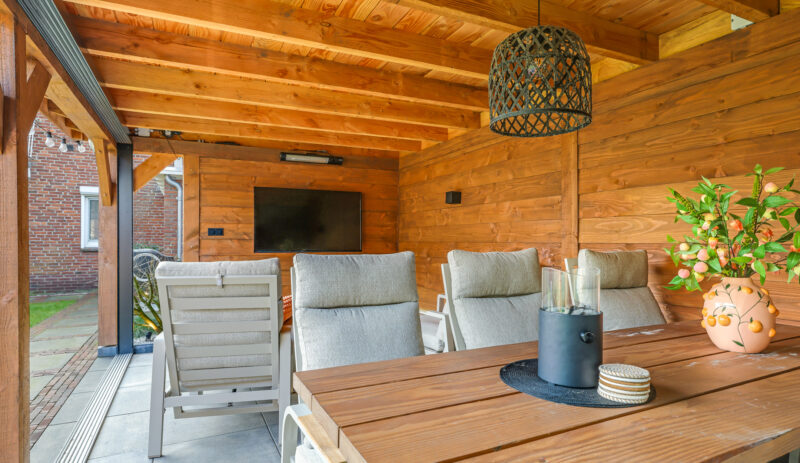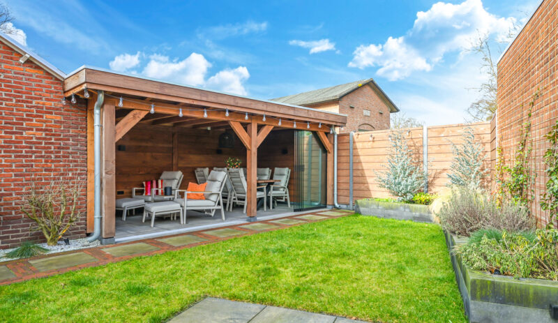 Een grote overkapping met glazen schuifwand maakt het mogelijk om gedurende het hele jaar comfortabel buiten te zitten. Daarnaast is er een aparte stenen berging aanwezig, geschikt voor fietsen en tuinopslag.