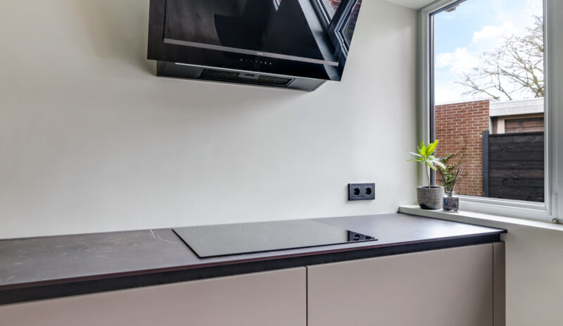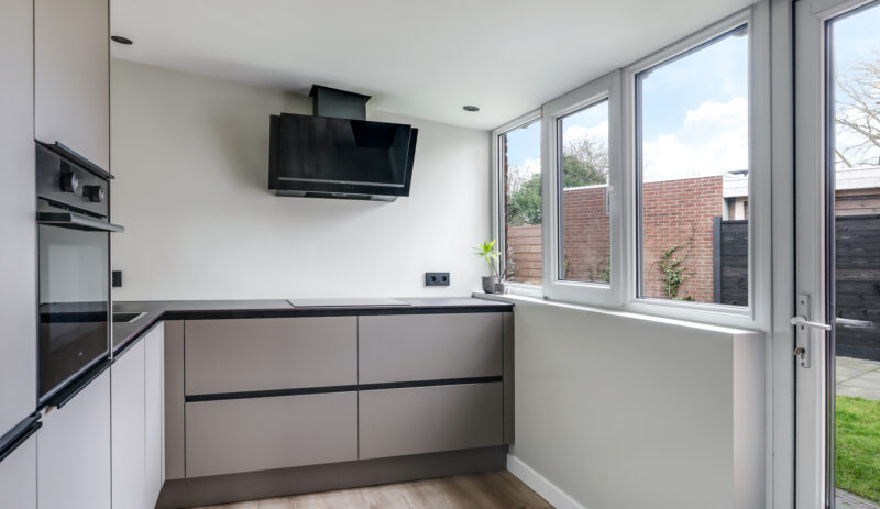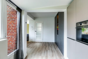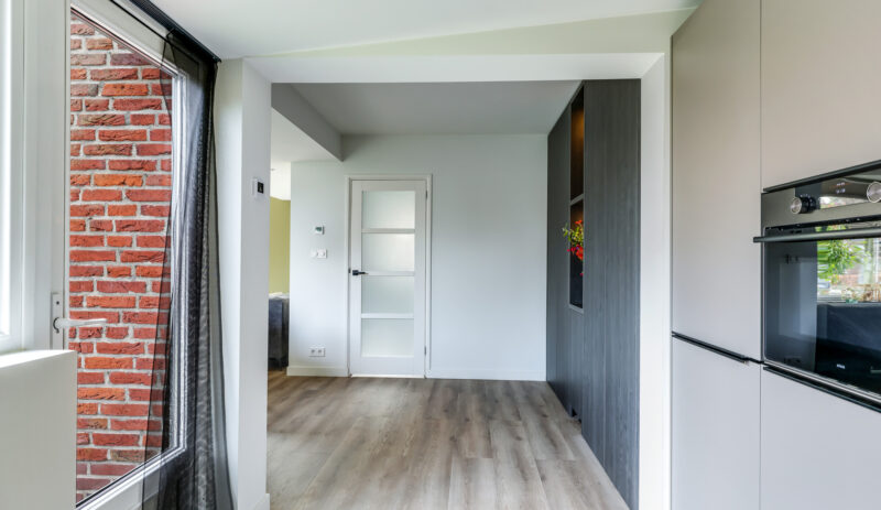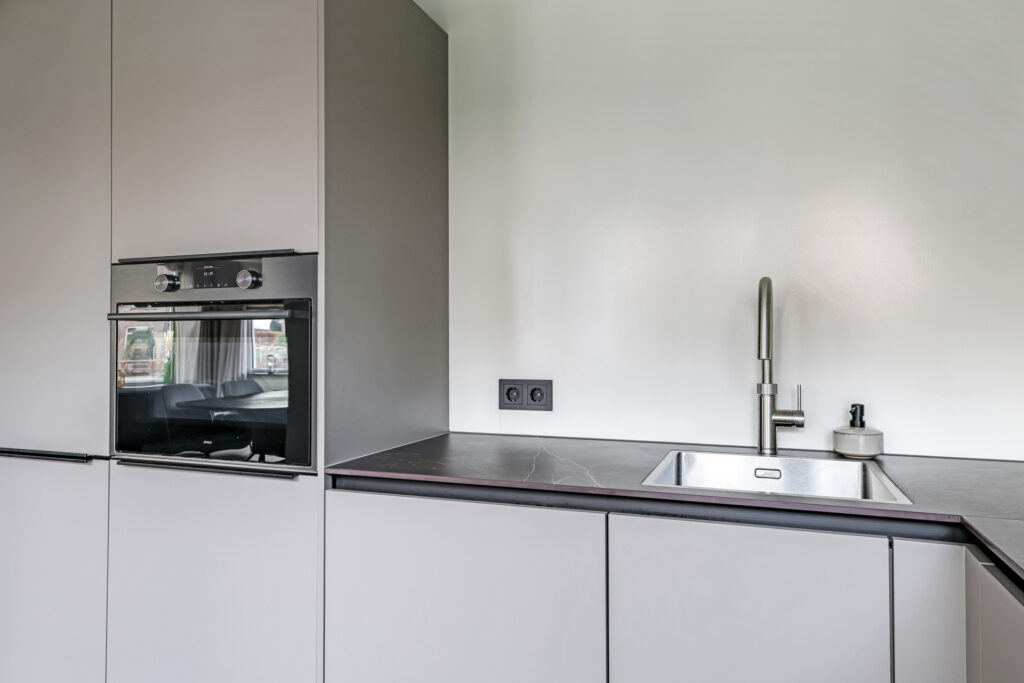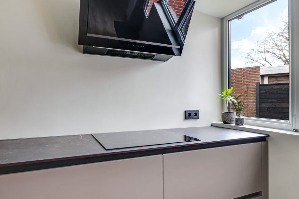 De keuken is in 2023 vernieuwd, luxe uitgevoerd en praktisch ingericht. De opstelling biedt voldoende kastruimte en moderne apparatuur. Vanuit de keuken is de achtertuin bereikbaar.