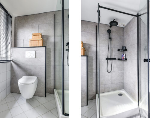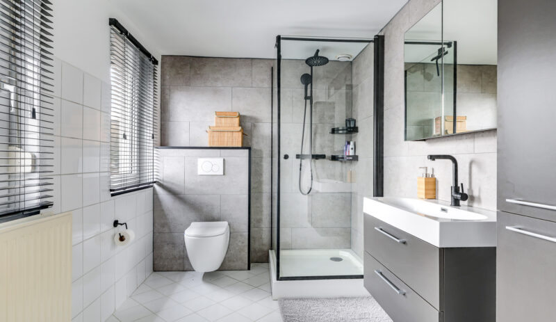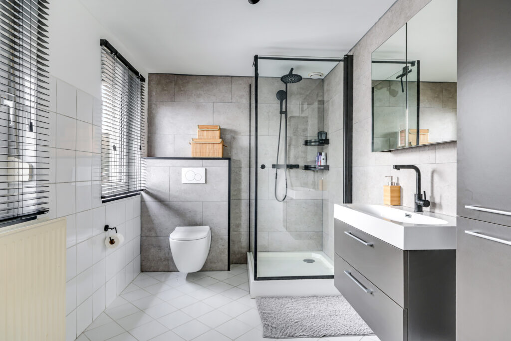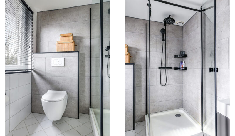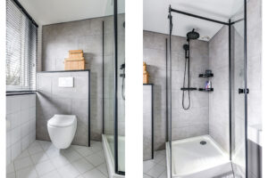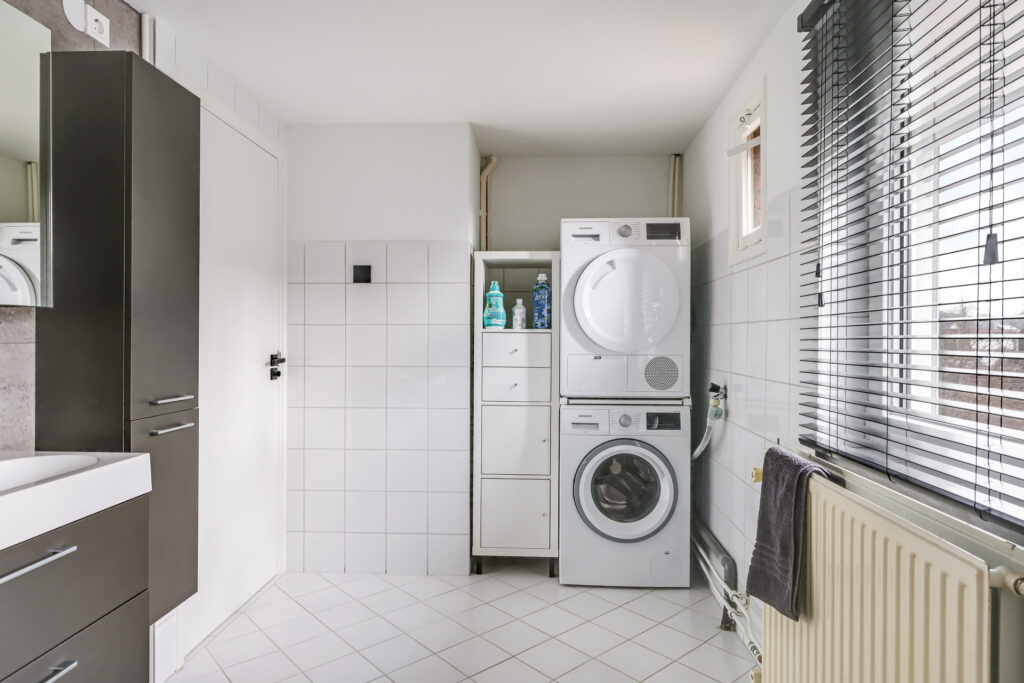 De badkamer is ruim en voorzien van een douche, toilet, wastafel en aansluitingen voor witgoedapparatuur.