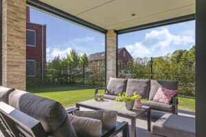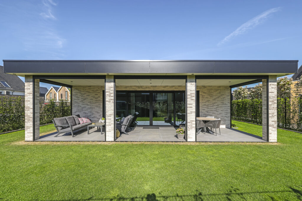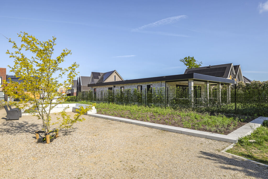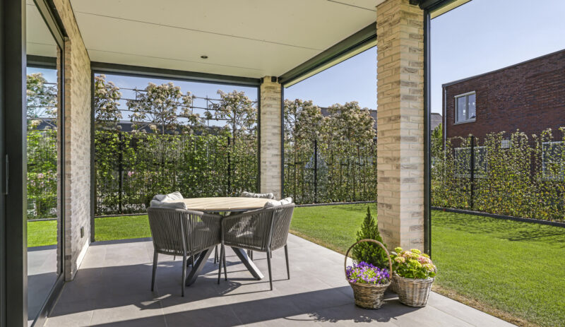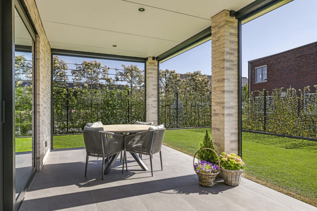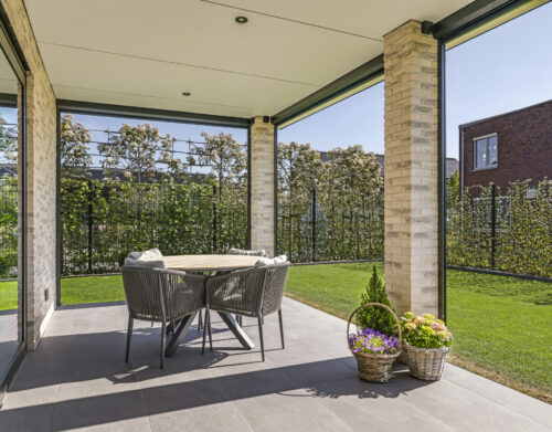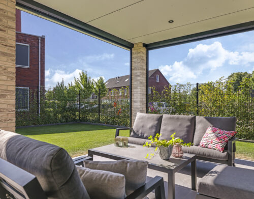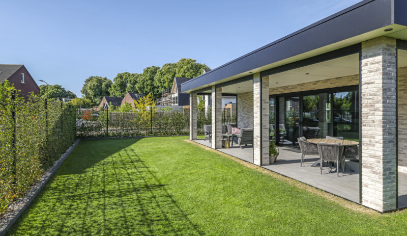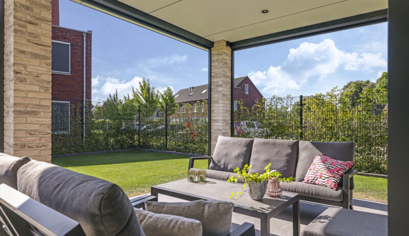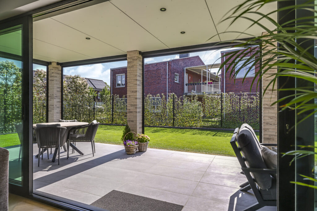 De tuin rondom de woning is onderhoudsvriendelijk aangelegd en volledig omsloten. Aan de achterzijde bevindt zich een royale veranda van ca. 31 m², voorzien van inbouwspots en elektrisch bedienbare screens, zodat je hier het hele jaar door comfortabel kunt zitten. Aan de voorzijde kunnen twee auto’s op eigen terrein worden geparkeerd en er is een afsluitbare poort aan de zijkant van de woning.