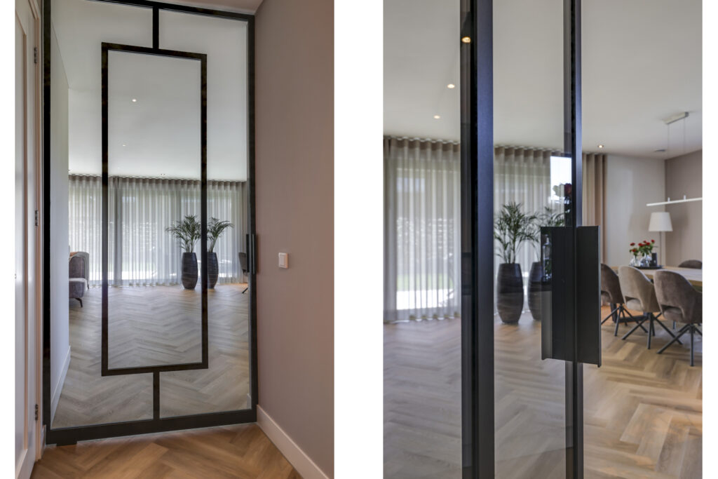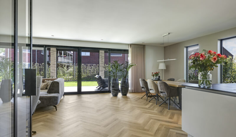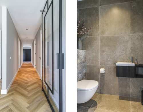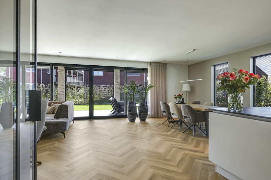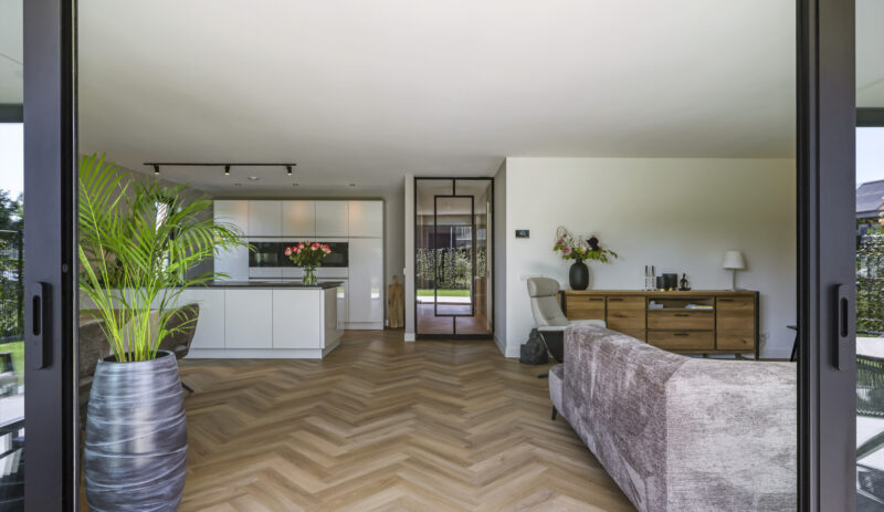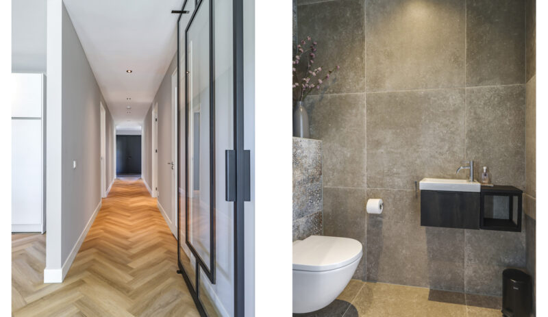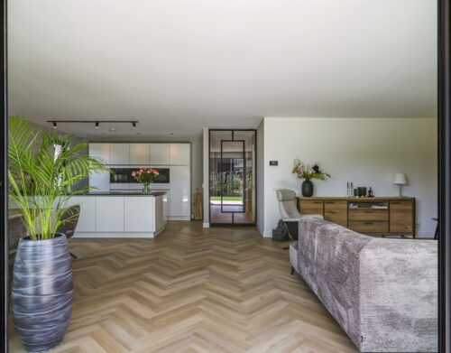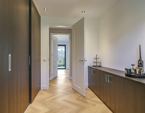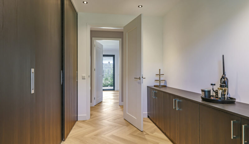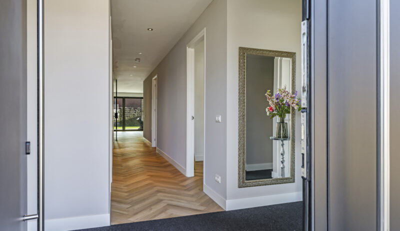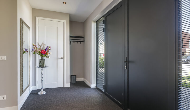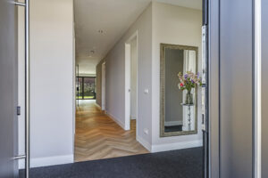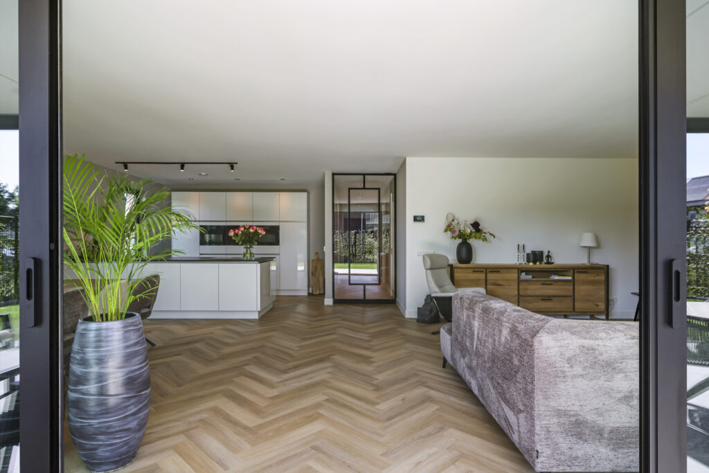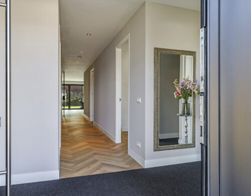 Bij binnenkomst in de ruime hal tref je direct de hoogwaardige afwerking: strak gestucte wanden en plafonds met inbouwspots, een fraaie PVC-vloer in visgraatmotief en vloerverwarming door het hele huis. De hal biedt toegang tot het gastentoilet, de meterkast en alle overige vertrekken. Via een stijlvolle stalen taatsdeur betreed je de royale, tuingerichte woonkamer met grote glazen achterpui en dubbele schuifdeuren naar de veranda. Licht en ruimte spelen hier de hoofdrol.