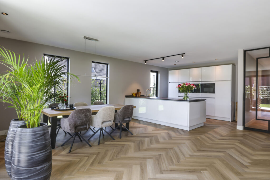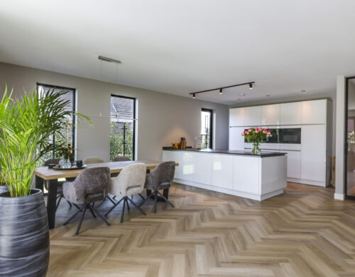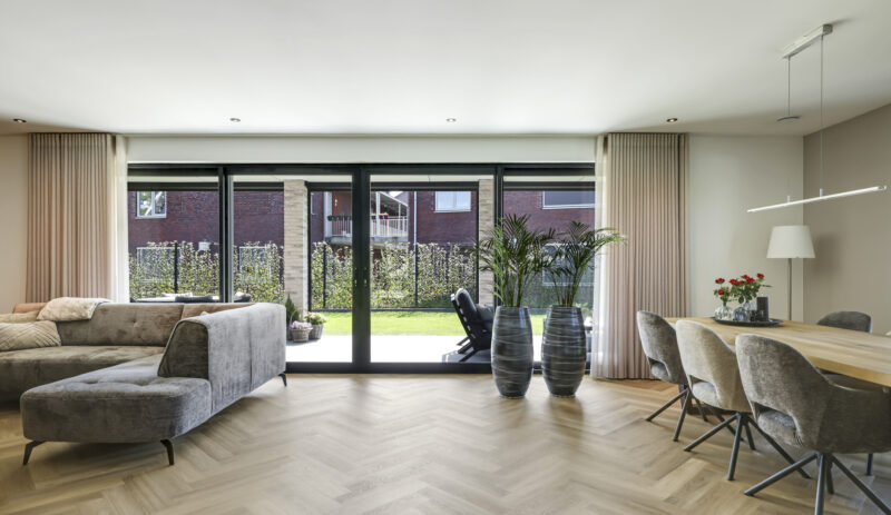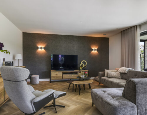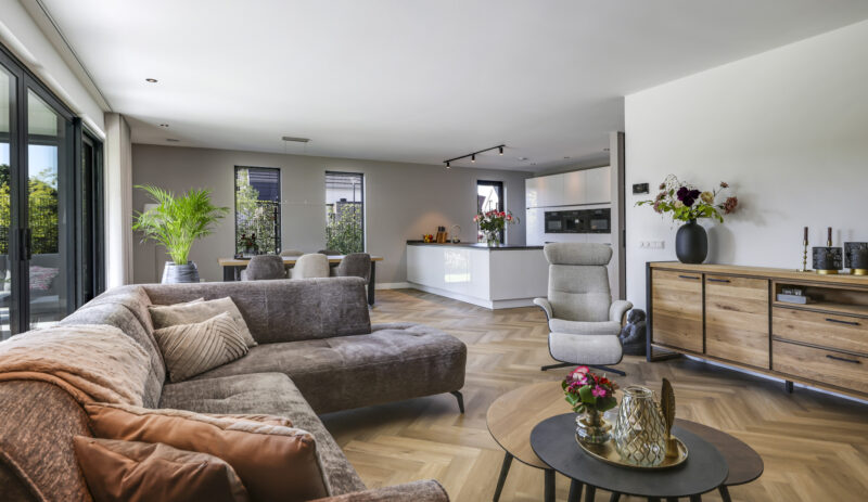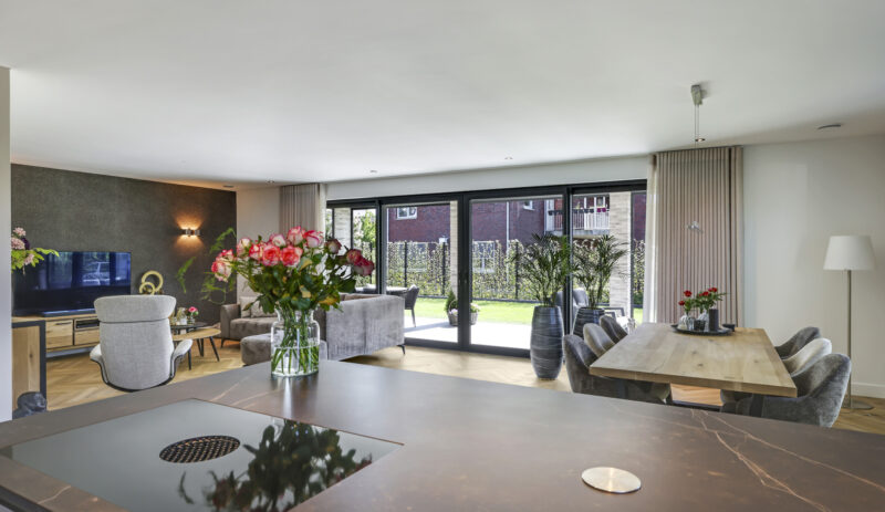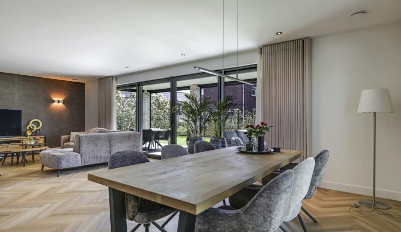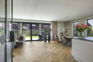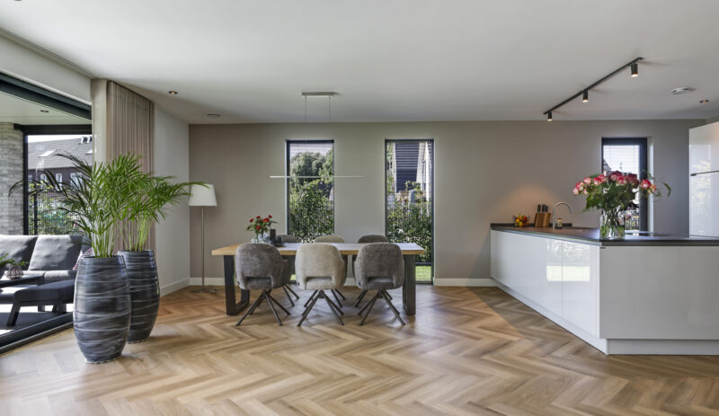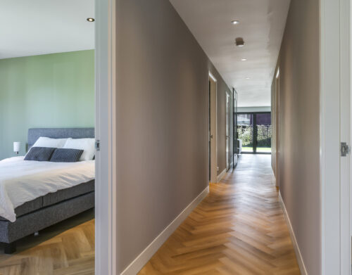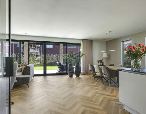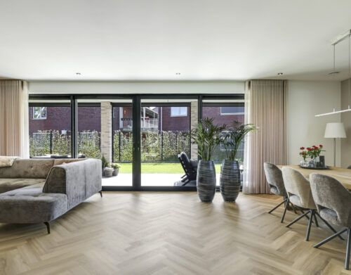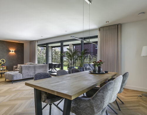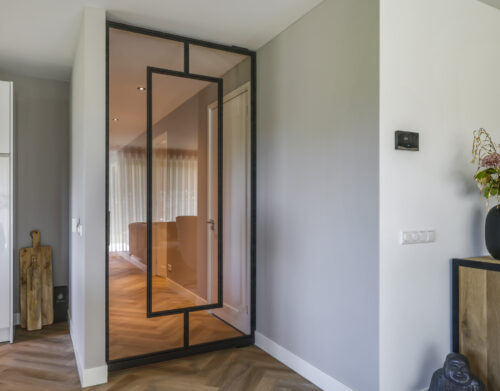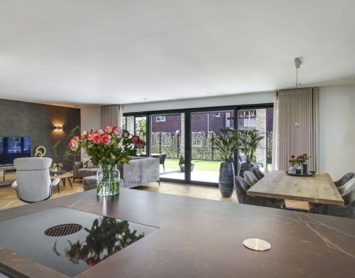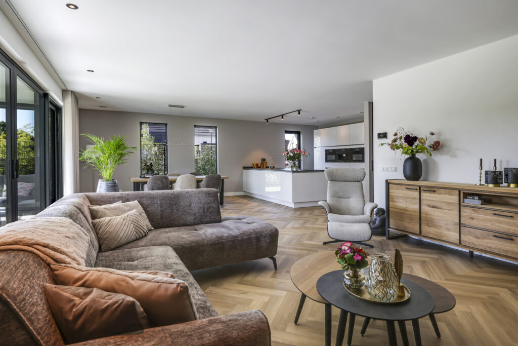 Bij binnenkomst in de ruime hal tref je direct de hoogwaardige afwerking: strak gestucte wanden en plafonds met inbouwspots, een fraaie PVC-vloer in visgraatmotief en vloerverwarming door het hele huis. De hal biedt toegang tot het gastentoilet, de meterkast en alle overige vertrekken. Via een stijlvolle stalen taatsdeur betreed je de royale, tuingerichte woonkamer met grote glazen achterpui en dubbele schuifdeuren naar de veranda. Licht en ruimte spelen hier de hoofdrol.