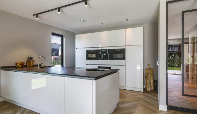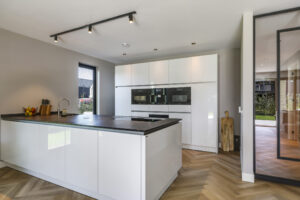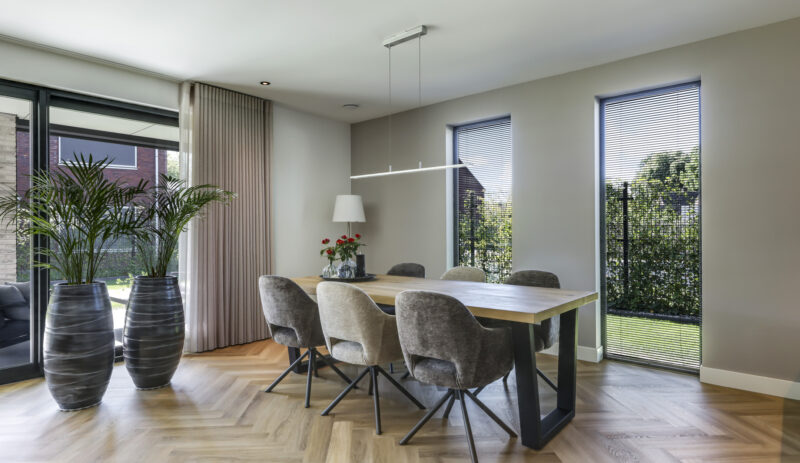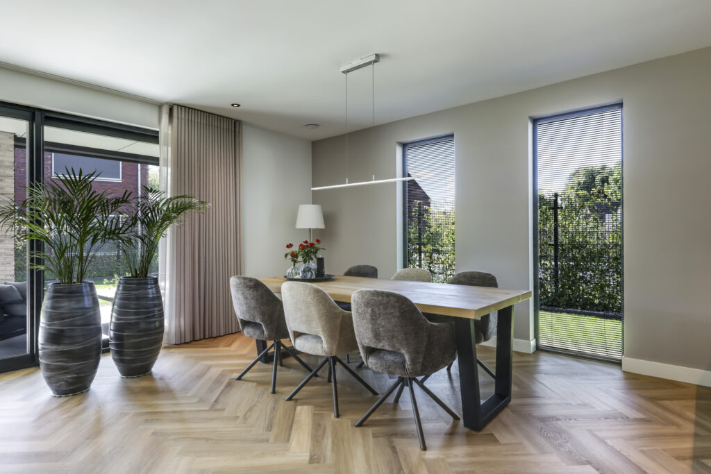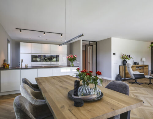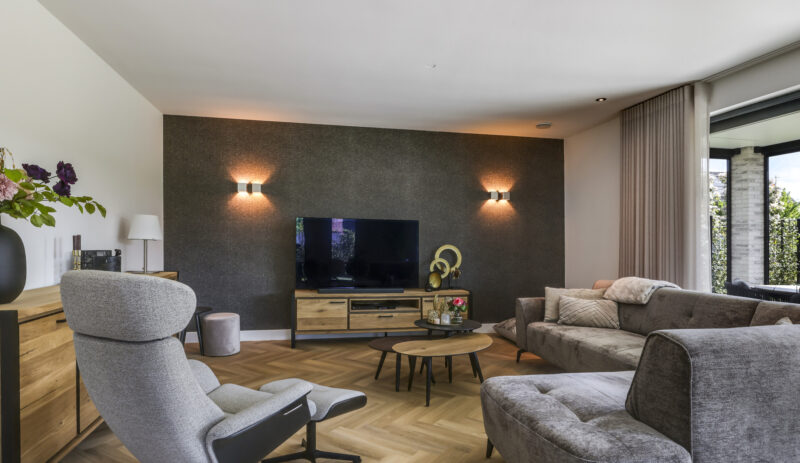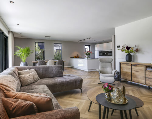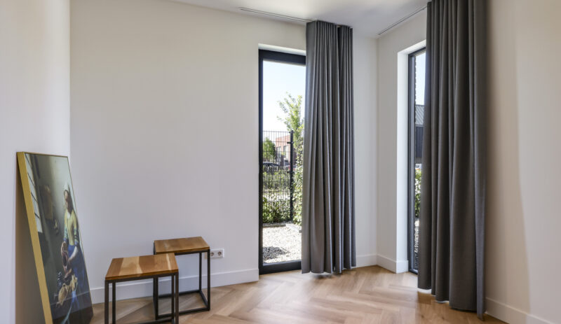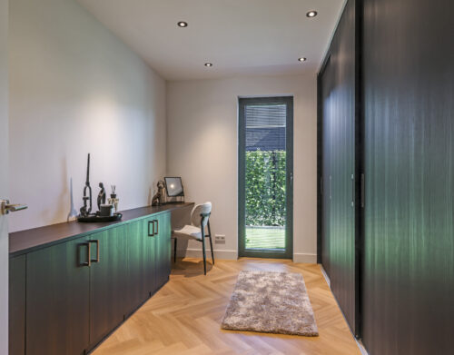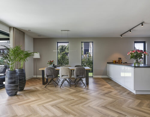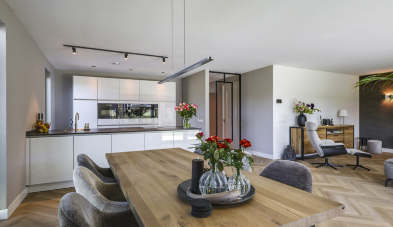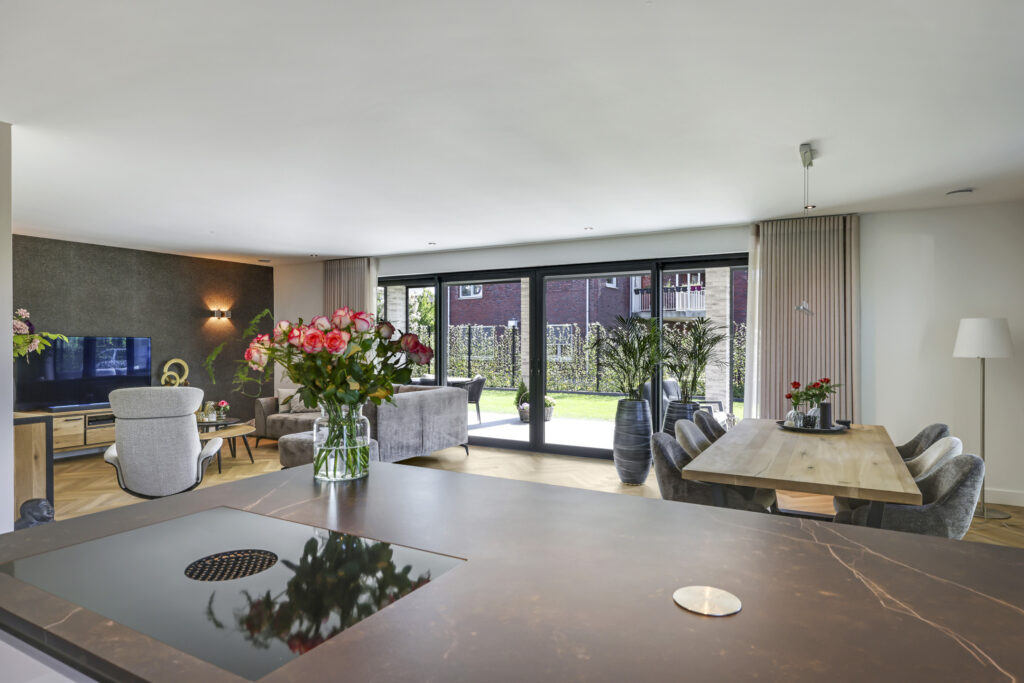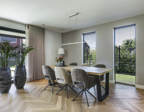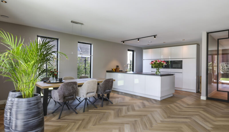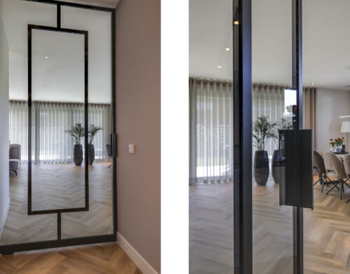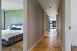 Bij binnenkomst in de ruime hal tref je direct de hoogwaardige afwerking: strak gestucte wanden en plafonds met inbouwspots, een fraaie PVC-vloer in visgraatmotief en vloerverwarming door het hele huis. De hal biedt toegang tot het gastentoilet, de meterkast en alle overige vertrekken. Via een stijlvolle stalen taatsdeur betreed je de royale, tuingerichte woonkamer met grote glazen achterpui en dubbele schuifdeuren naar de veranda. Licht en ruimte spelen hier de hoofdrol.