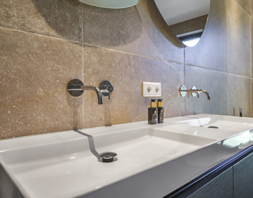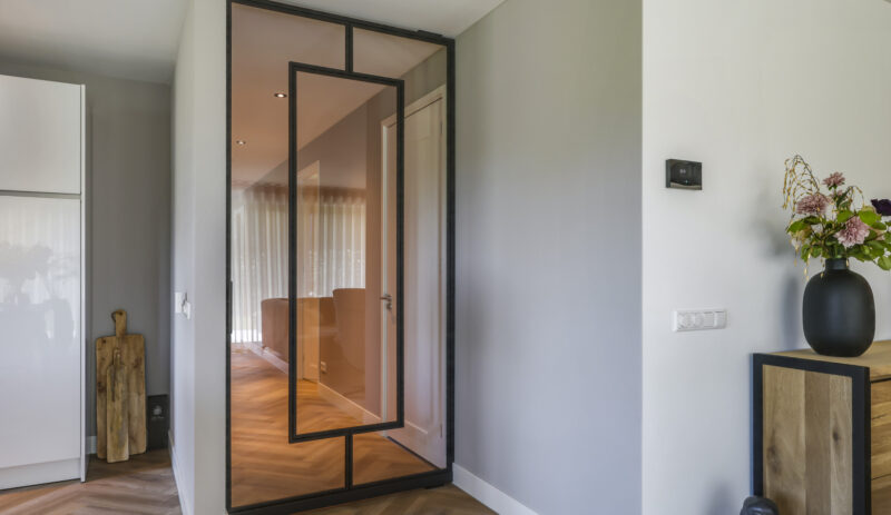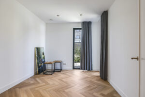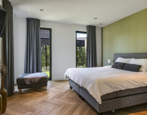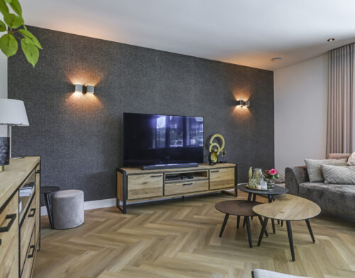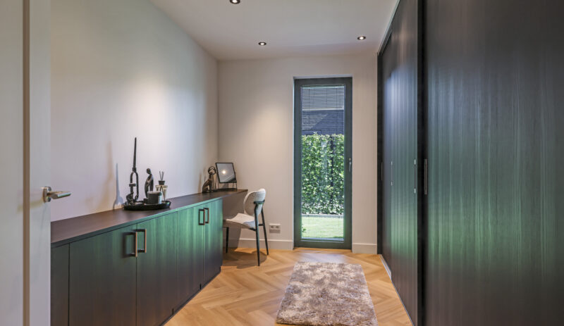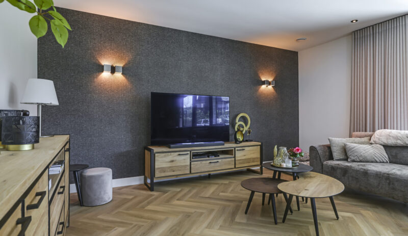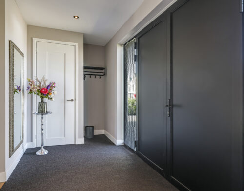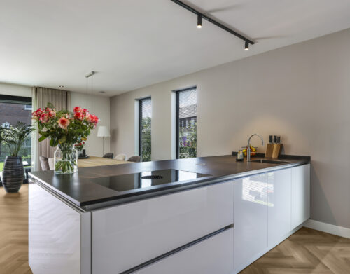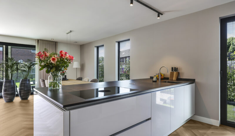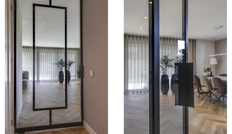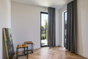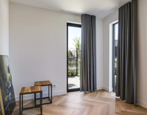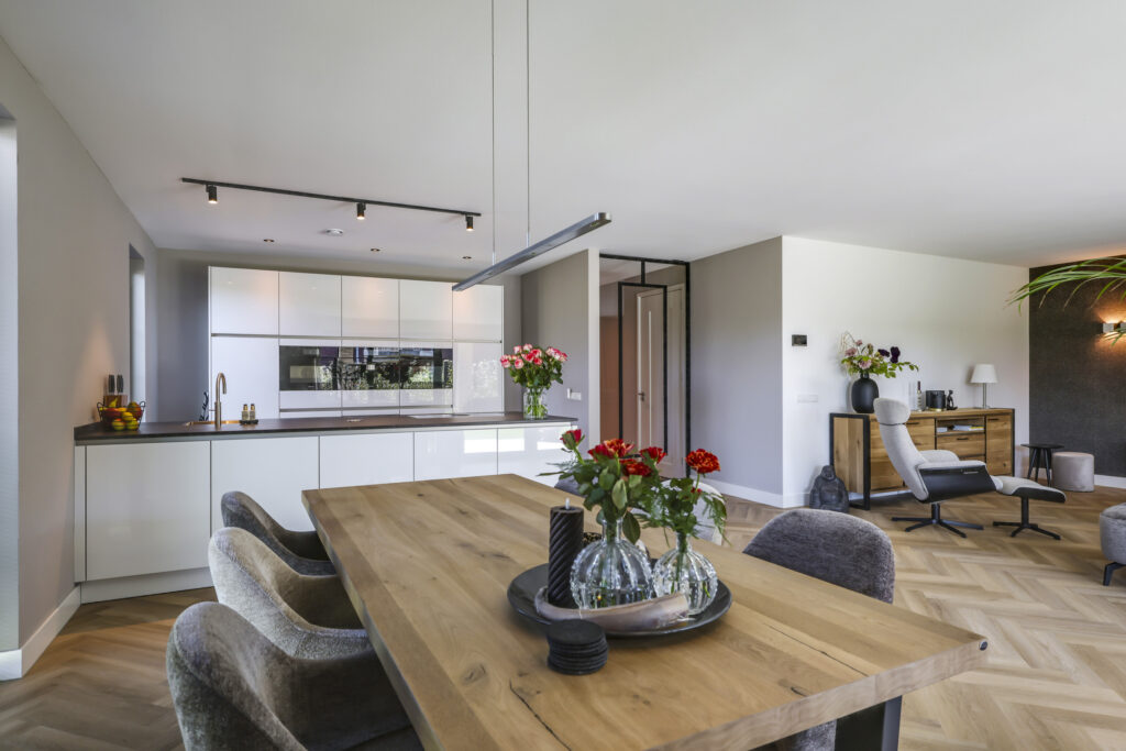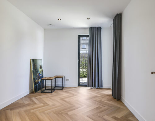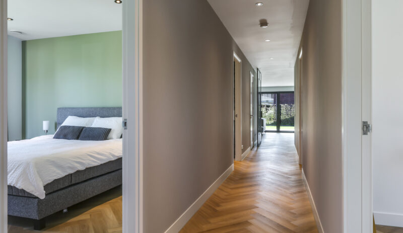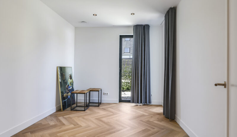Bij binnenkomst in de ruime hal tref je direct de hoogwaardige afwerking: strak gestucte wanden en plafonds met inbouwspots, een fraaie PVC-vloer in visgraatmotief en vloerverwarming door het hele huis. De hal biedt toegang tot het gastentoilet, de meterkast en alle overige vertrekken. Via een stijlvolle stalen taatsdeur betreed je de royale, tuingerichte woonkamer met grote glazen achterpui en dubbele schuifdeuren naar de veranda. Licht en ruimte spelen hier de hoofdrol.