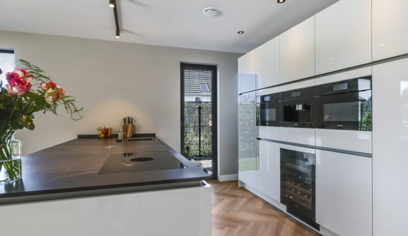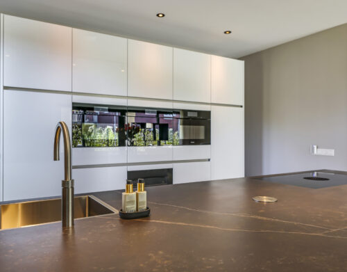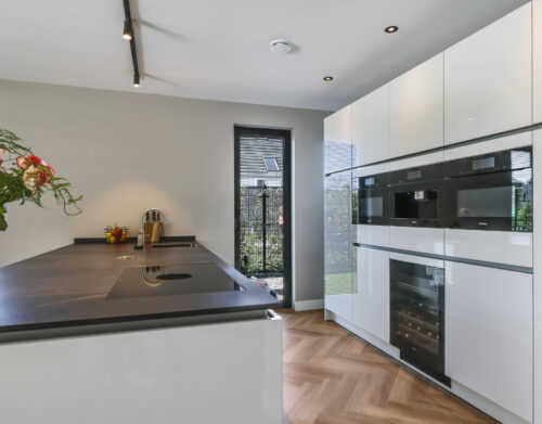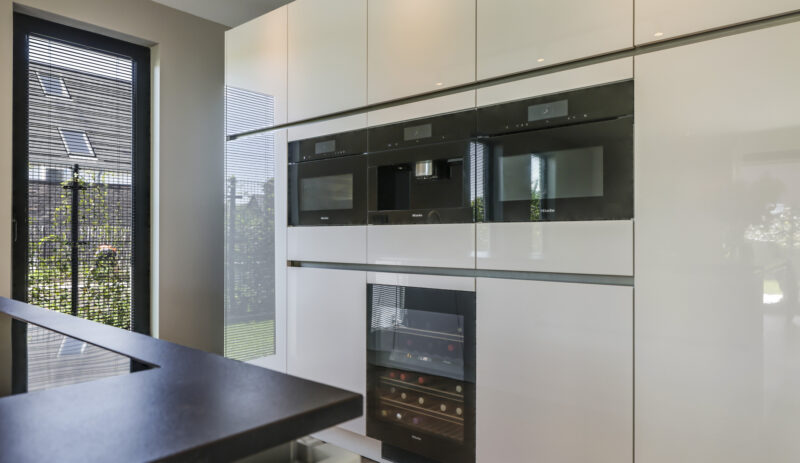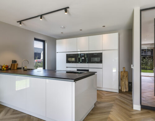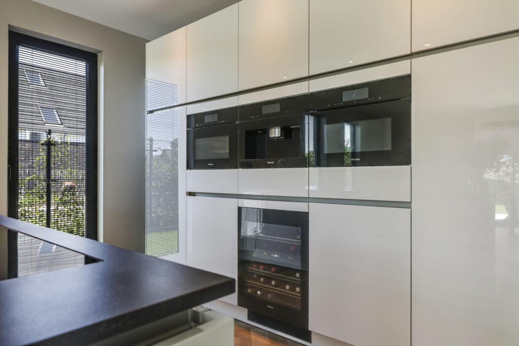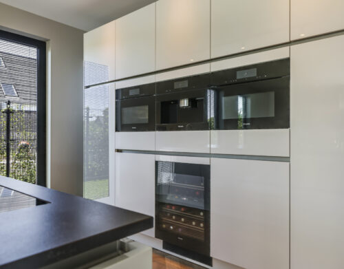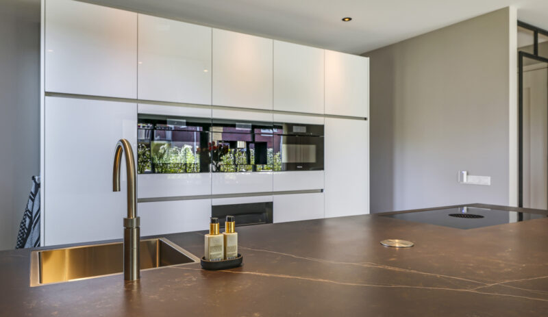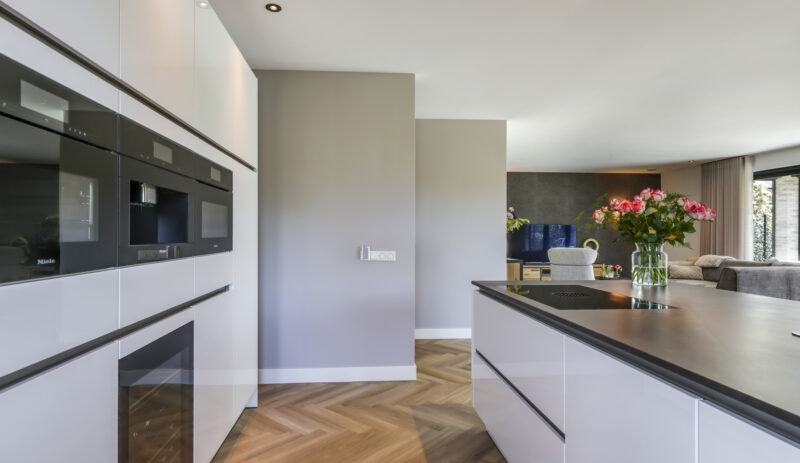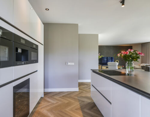De open keuken is een ware eyecatcher en een droom voor iedere kookliefhebber. De SieMatic inbouwkeuken is voorzien van hoogglans witte fronten, een kookeiland en een kastenwand met een zeer compleet pakket aan luxe Miele inbouwapparatuur, waaronder: