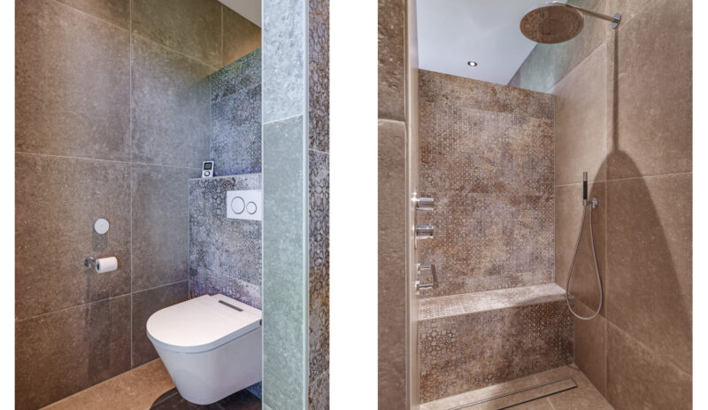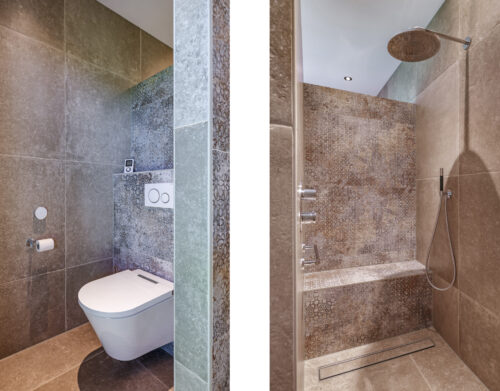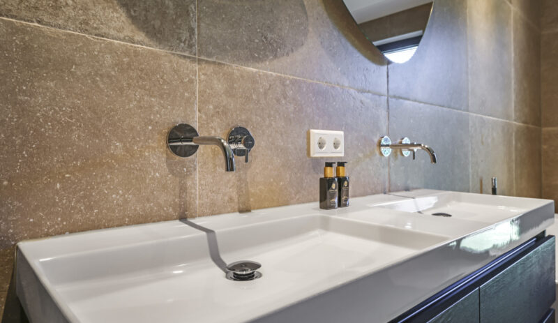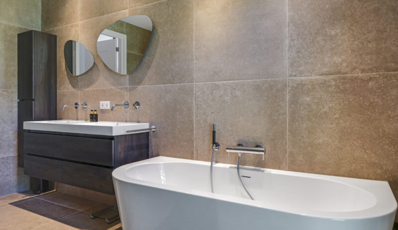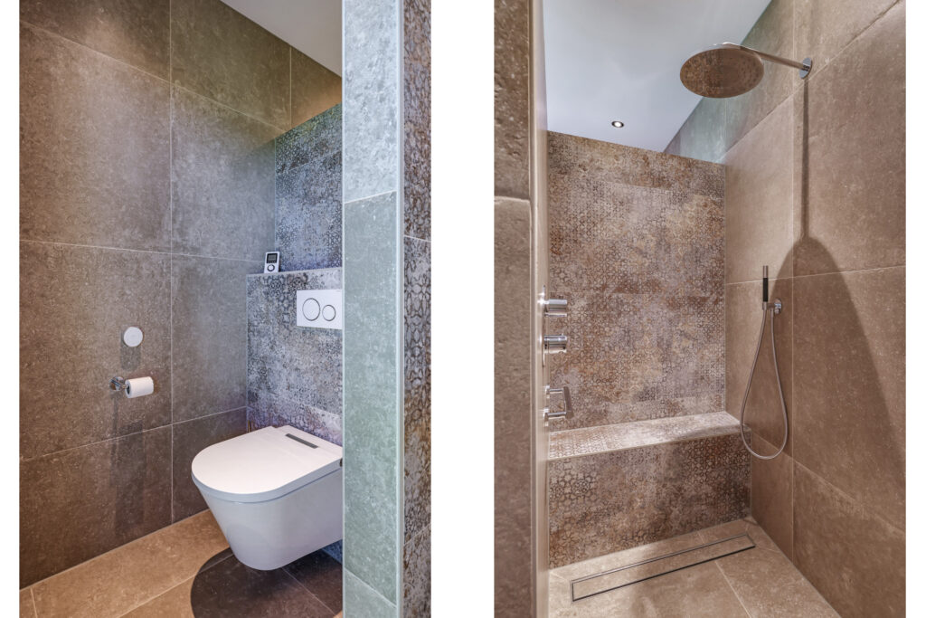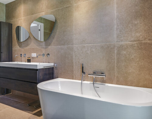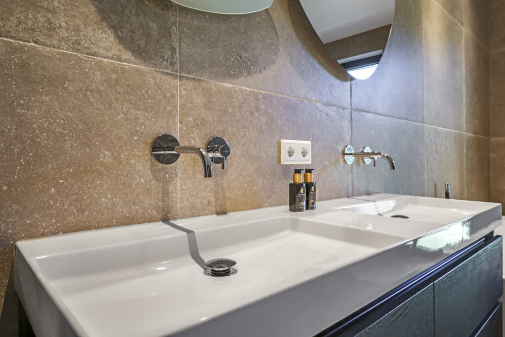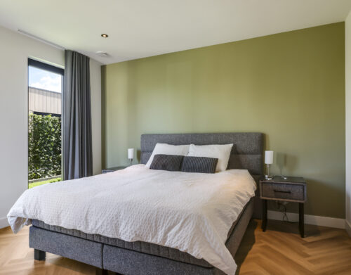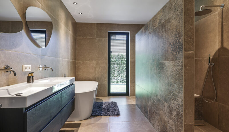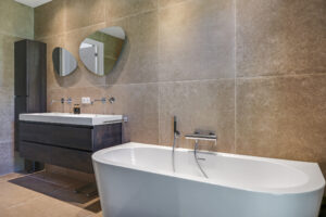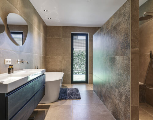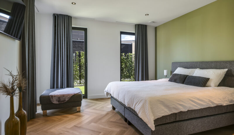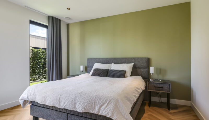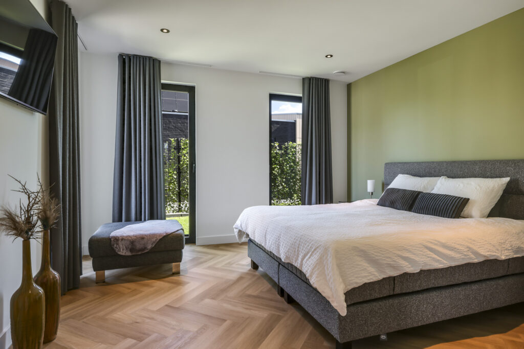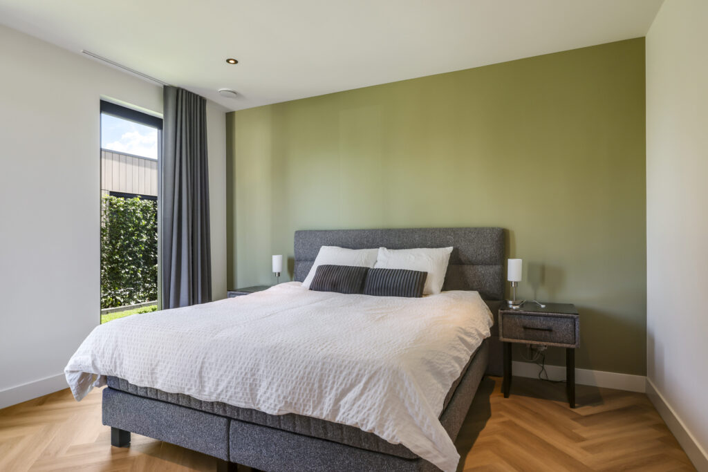 Er zijn drie slaapkamers aanwezig, waarvan één met een op maat gemaakte vaste kastenwand. De luxe badkamer is voorzien van een inloopdouche met ingebouwde rainshower, een vrijstaand ligbad, dubbel wastafelmeubel, spoeltoilet en een elektrische designradiator. De afwerking is strak en modern, met grote wand- en vloertegels en ingebouwde kranen.